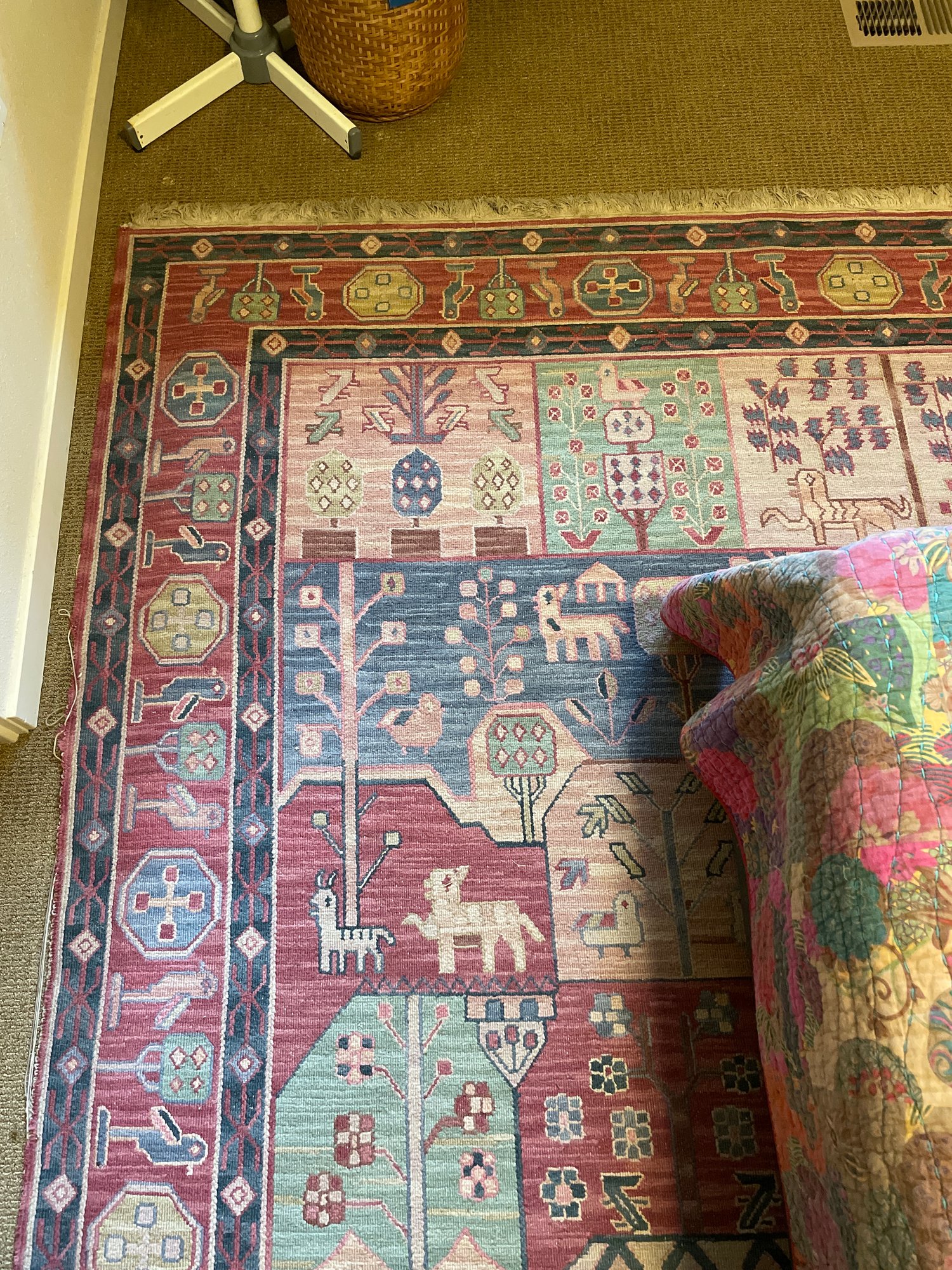 Woven rug measures 5.5 feet. Needs cleaning. Heavy, bring help.