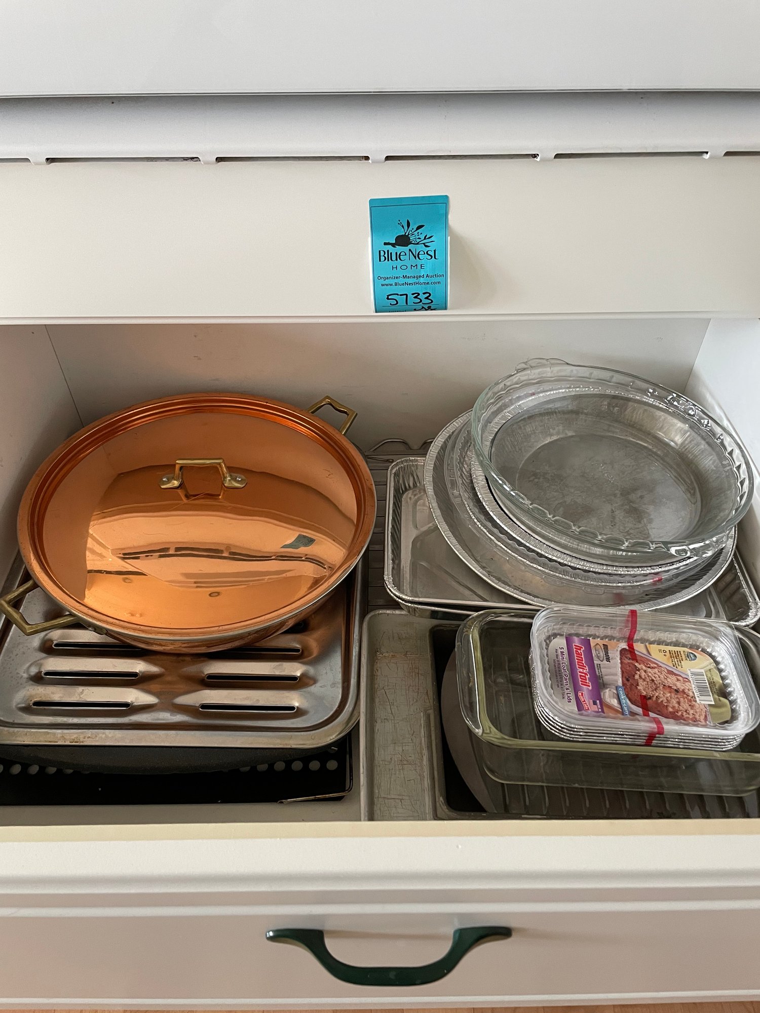 Collection of baking and cooking items. One Pyrex dish, one pie plate, one loaf pan. 9 in x 13 in Wilton metal pan. Lot also includes: roasting pan with rack, two roasting racks, 7 in x 11 in metal pan, microwave safe pan, assorted disposable baking pans, and a 13 inch sauce pan with handles and lid. Not checked for completeness. The small glass baking pyrex dish located in the drawer is NOT included in this lot.