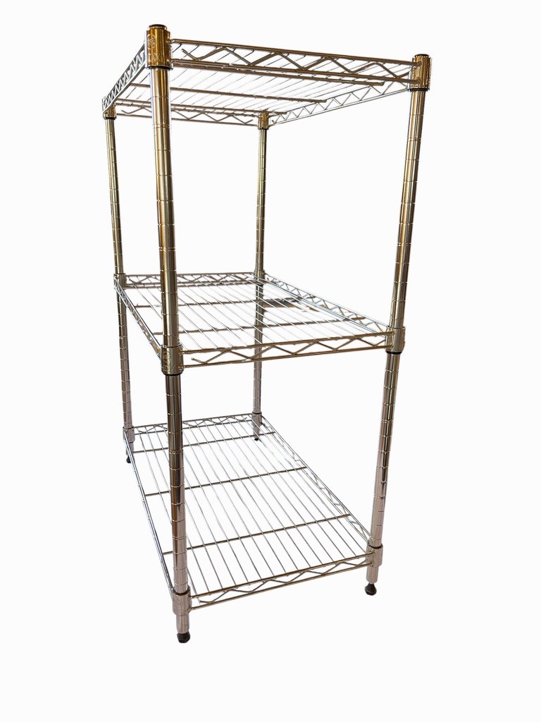 Durable and versatile, this chrome wire shelving unit offers practical storage with a clean, industrial look. Featuring three spacious tiers, the adjustable shelves allow for customized spacing to accommodate a variety of items—from kitchen appliances and pantry goods to office supplies or garage storage.