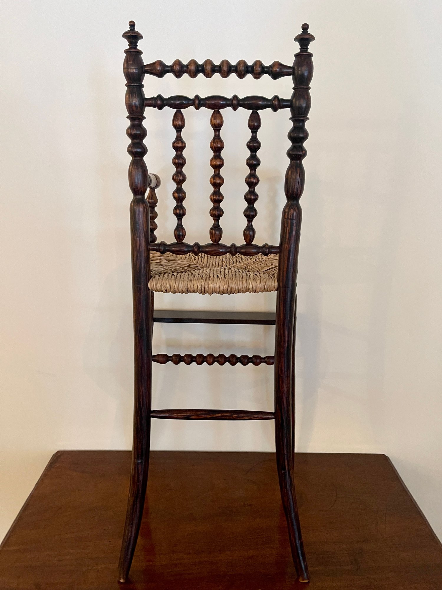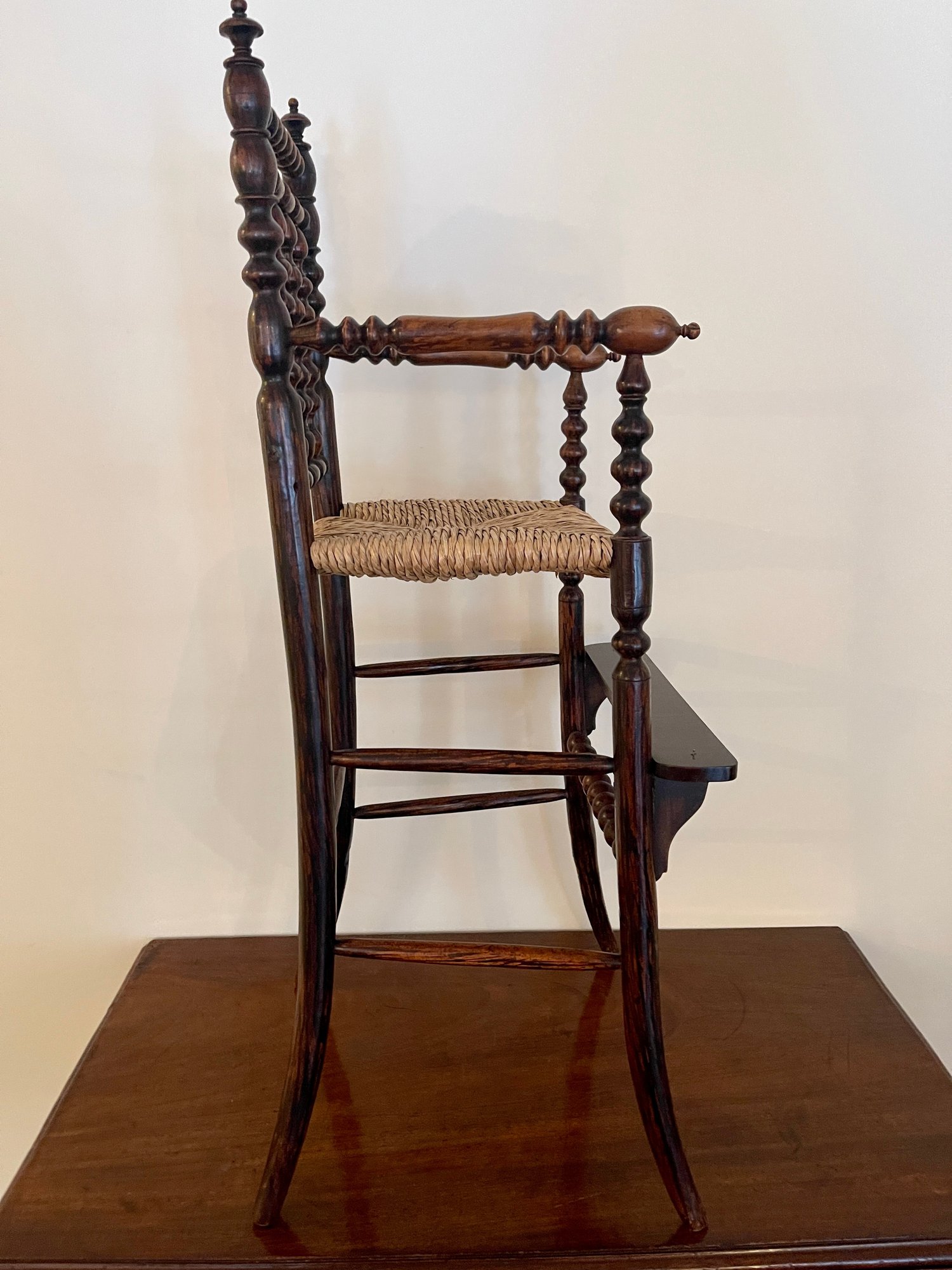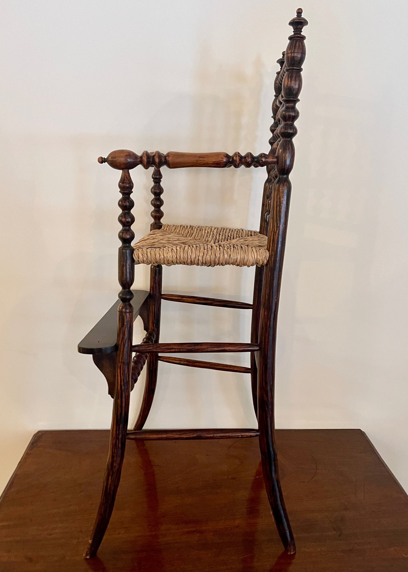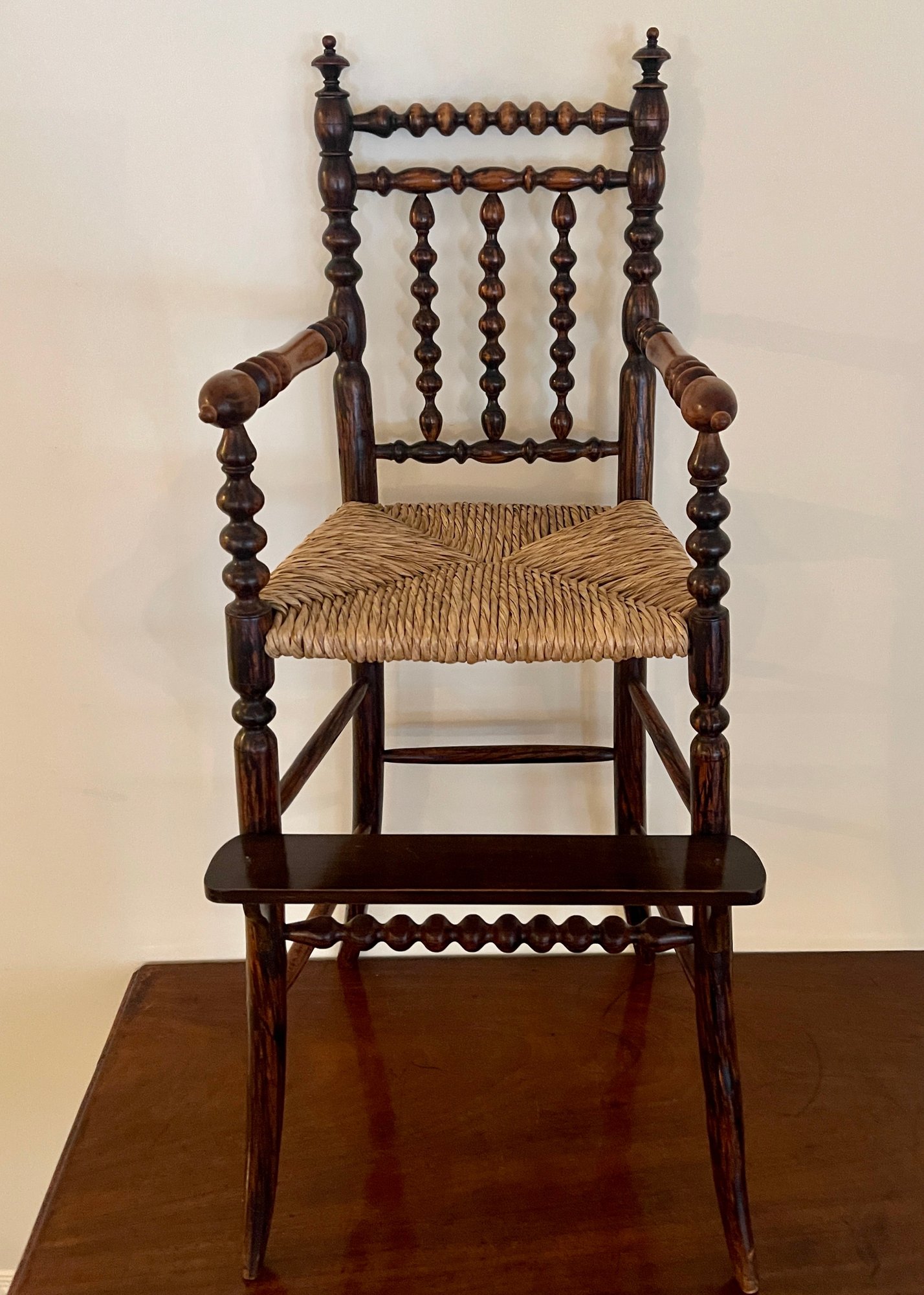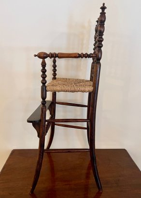 A 19th-century turned wood high chair featuring finely shaped spindle turnings throughout the back, arms, legs, and stretchers. Features woven rush seat and tapering legs joined by decorative turned stretchers.