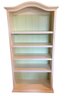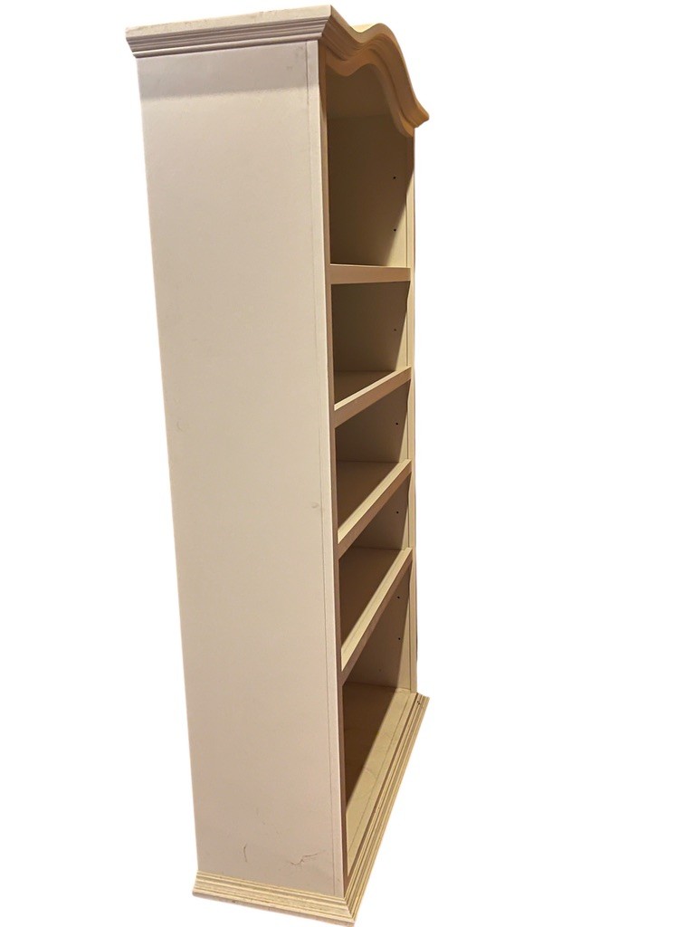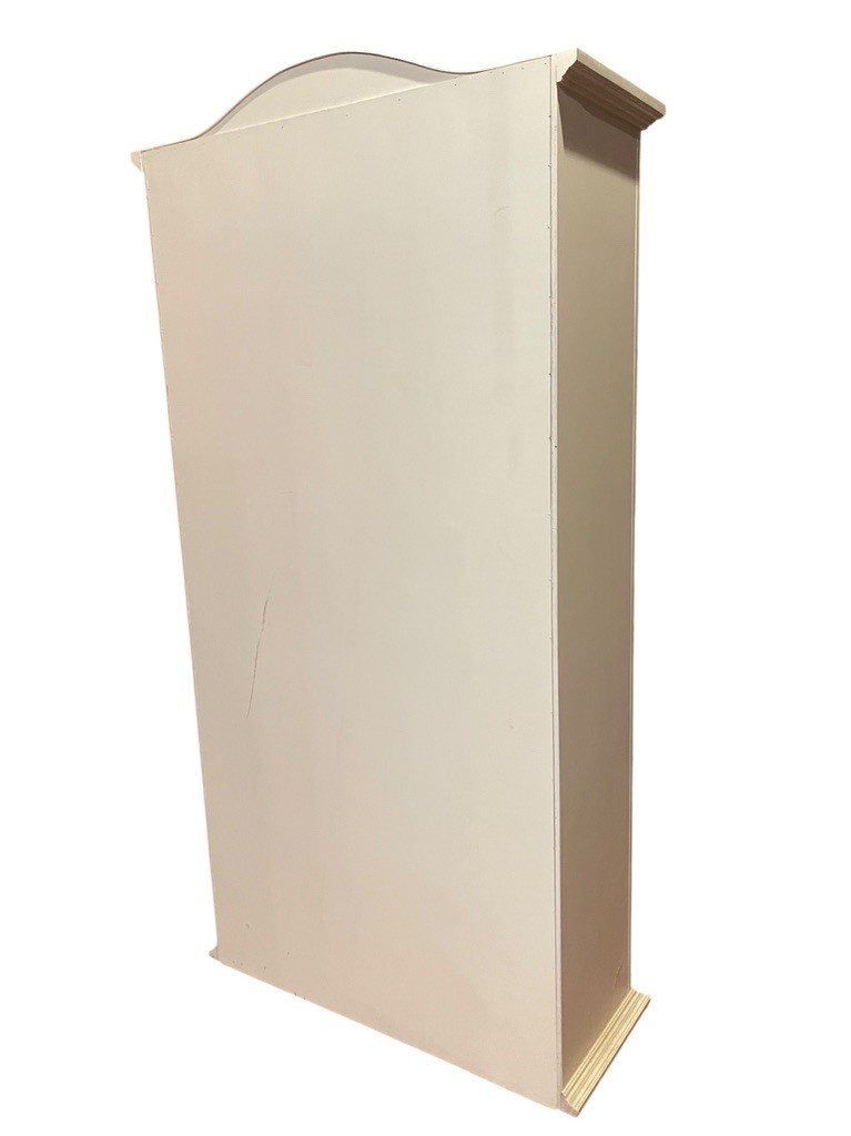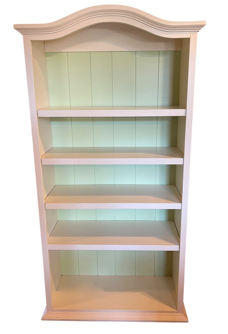 Charming painted wood bookcase featuring a soft cream exterior with a contrasting light green beadboard-style backing. The gently arched crown molding adds a classic, decorative touch, making this piece both functional and visually appealing.
