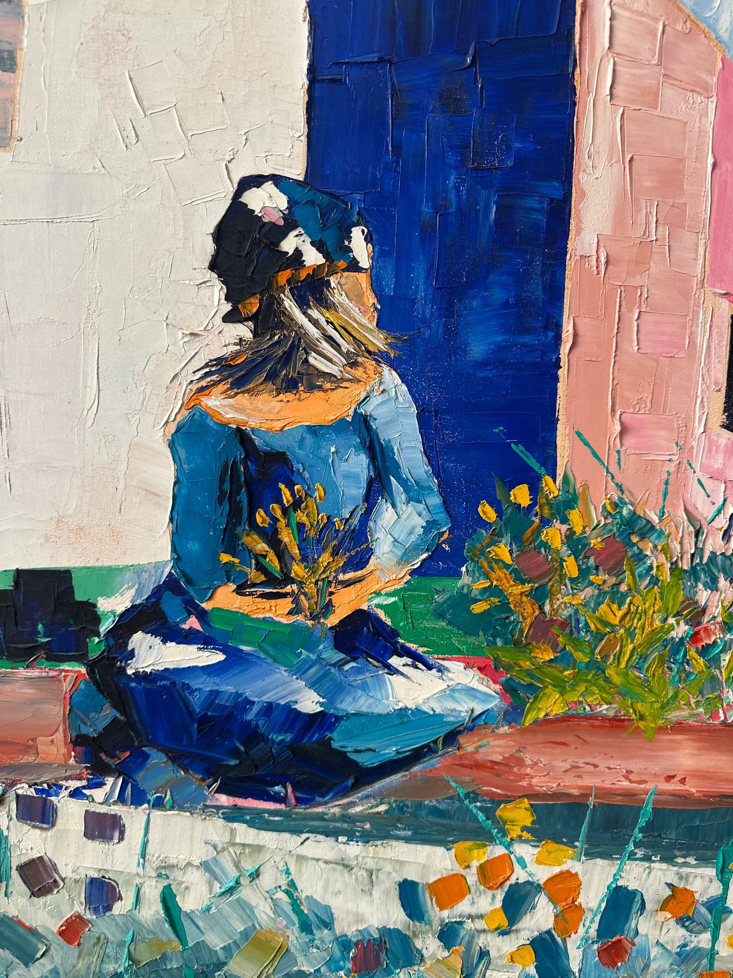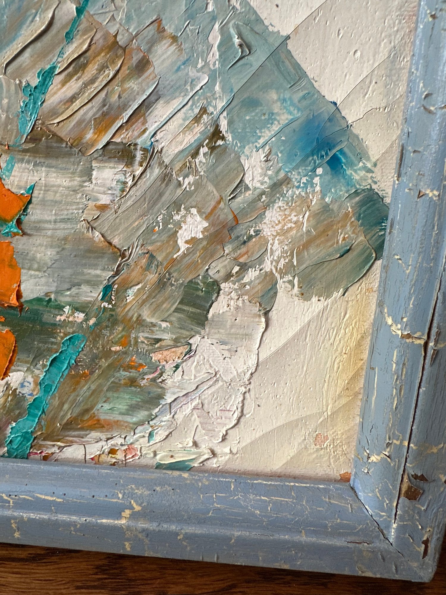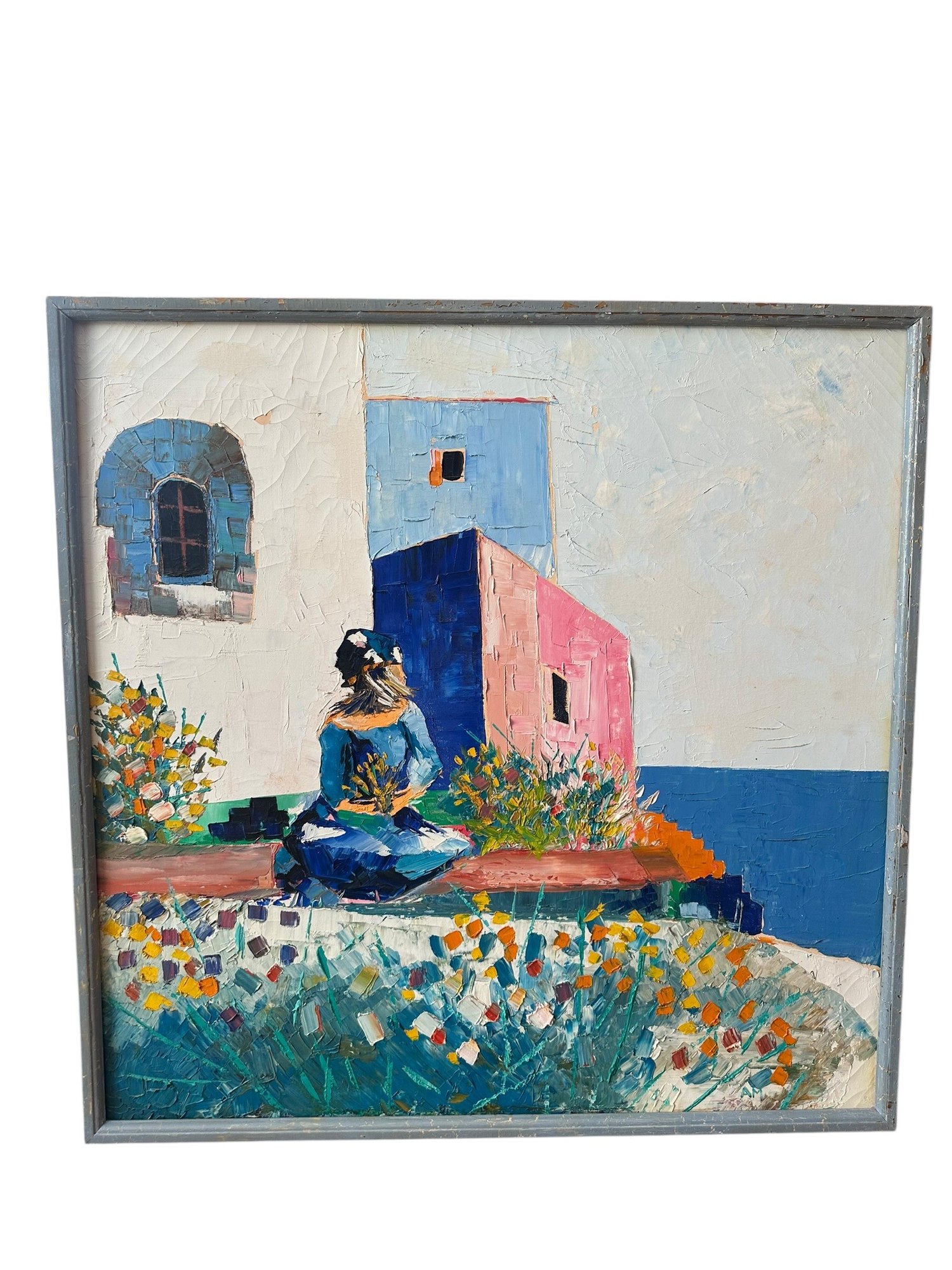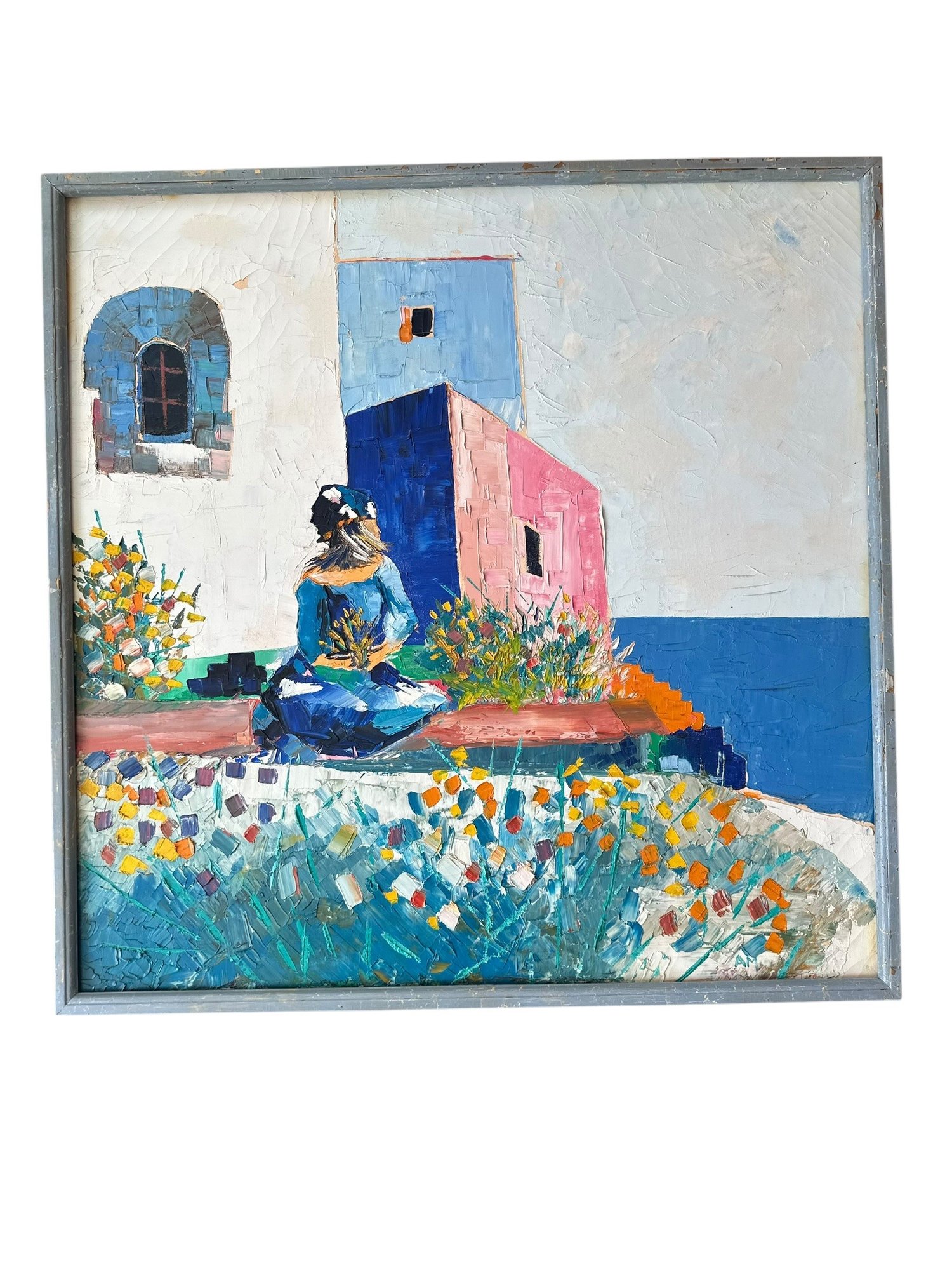 The artwork was created with heavy palette knife texture on canvas and appears to be a Mediterranean / Greek island style scene. Executed in a richly textured impasto technique, the artwork showcases expressive palette knife strokes and dynamic color contrasts—soft whites and sky blues balanced with vivid pinks, oranges, and deep cobalt tones.The signature at bottom right reads “AM” Probably mid-to-late 20th century (1960’s - 1980’s)