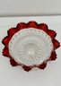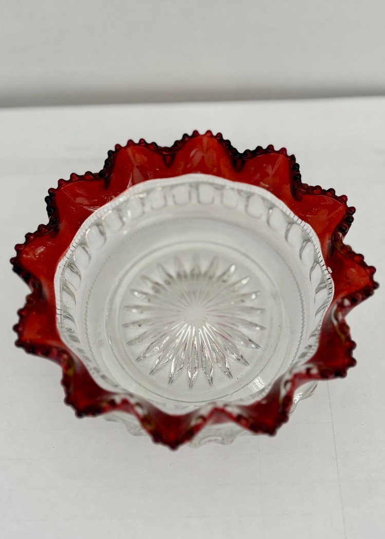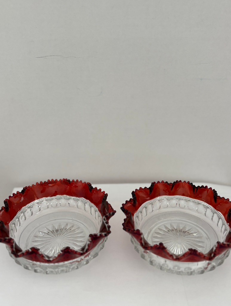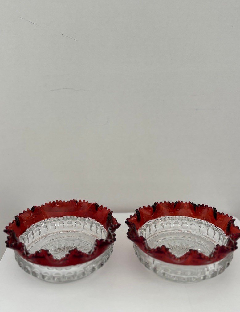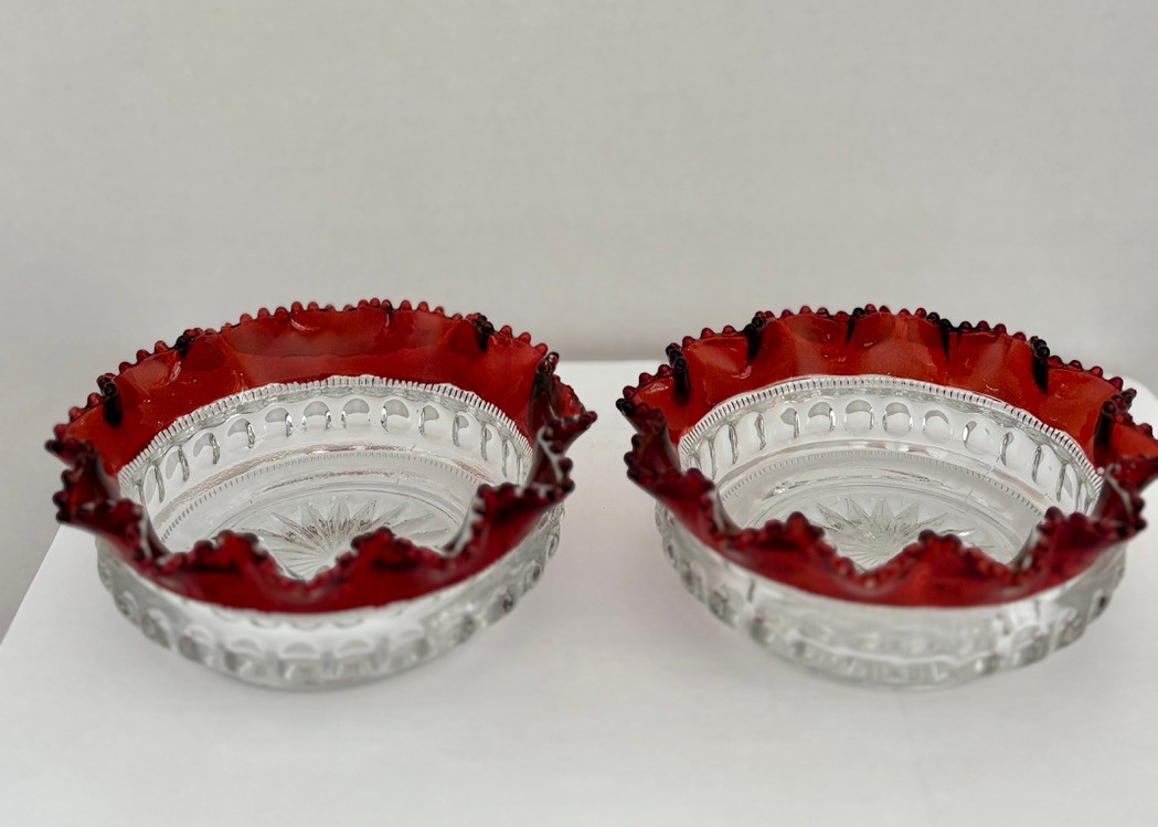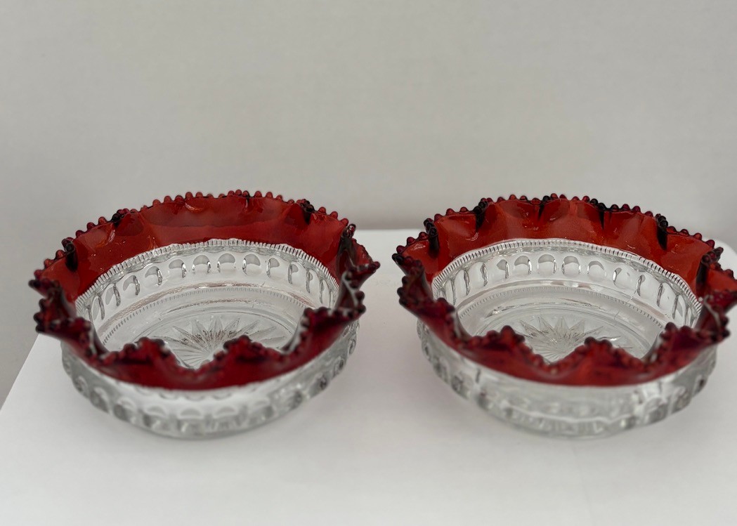 Two Heisey Punty Band ruby stained bowl with small thumbprints around the side. The top has a beautiful crimp rim. Introduced by the Heisey company in 1897 and discontinued in 1909.
