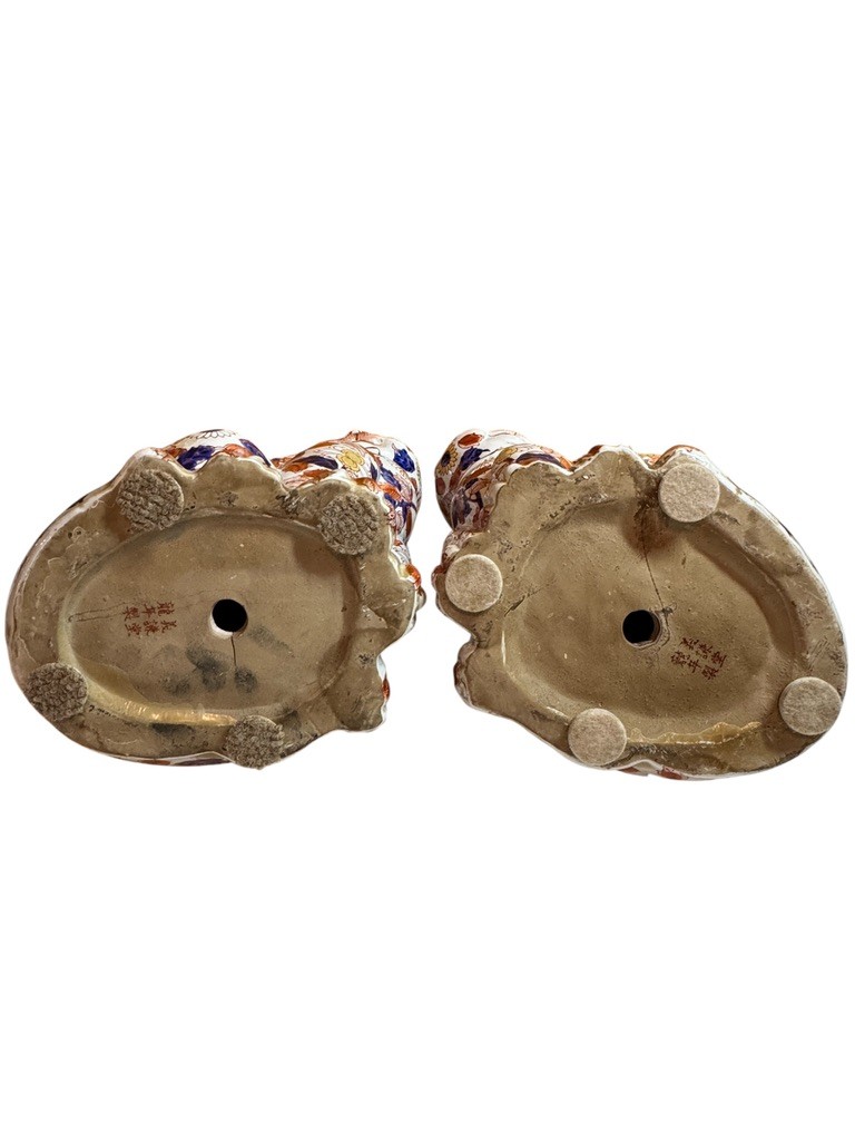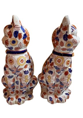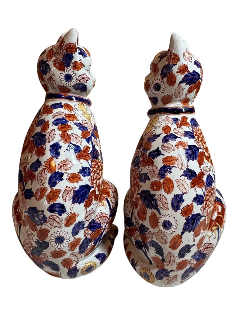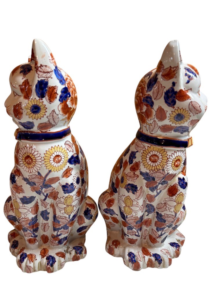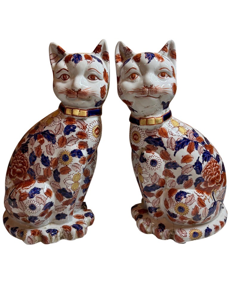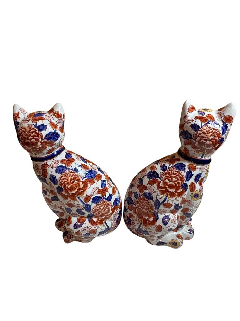 A decorative pair of porcelain cat figures, each seated upright and richly adorned with an all-over floral pattern in iron red, cobalt blue, and soft yellow tones. The cats feature expressive hand-painted faces, stylized collars with gilt accents, and detailed, densely patterned bodies reminiscent of traditional Imari designs.