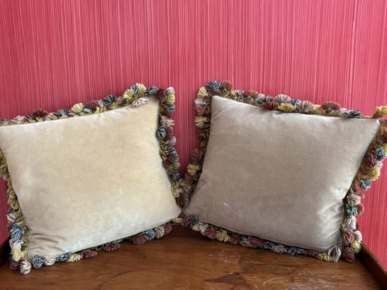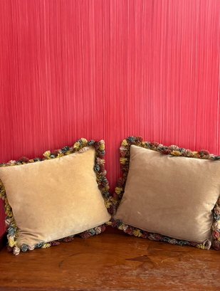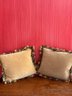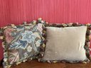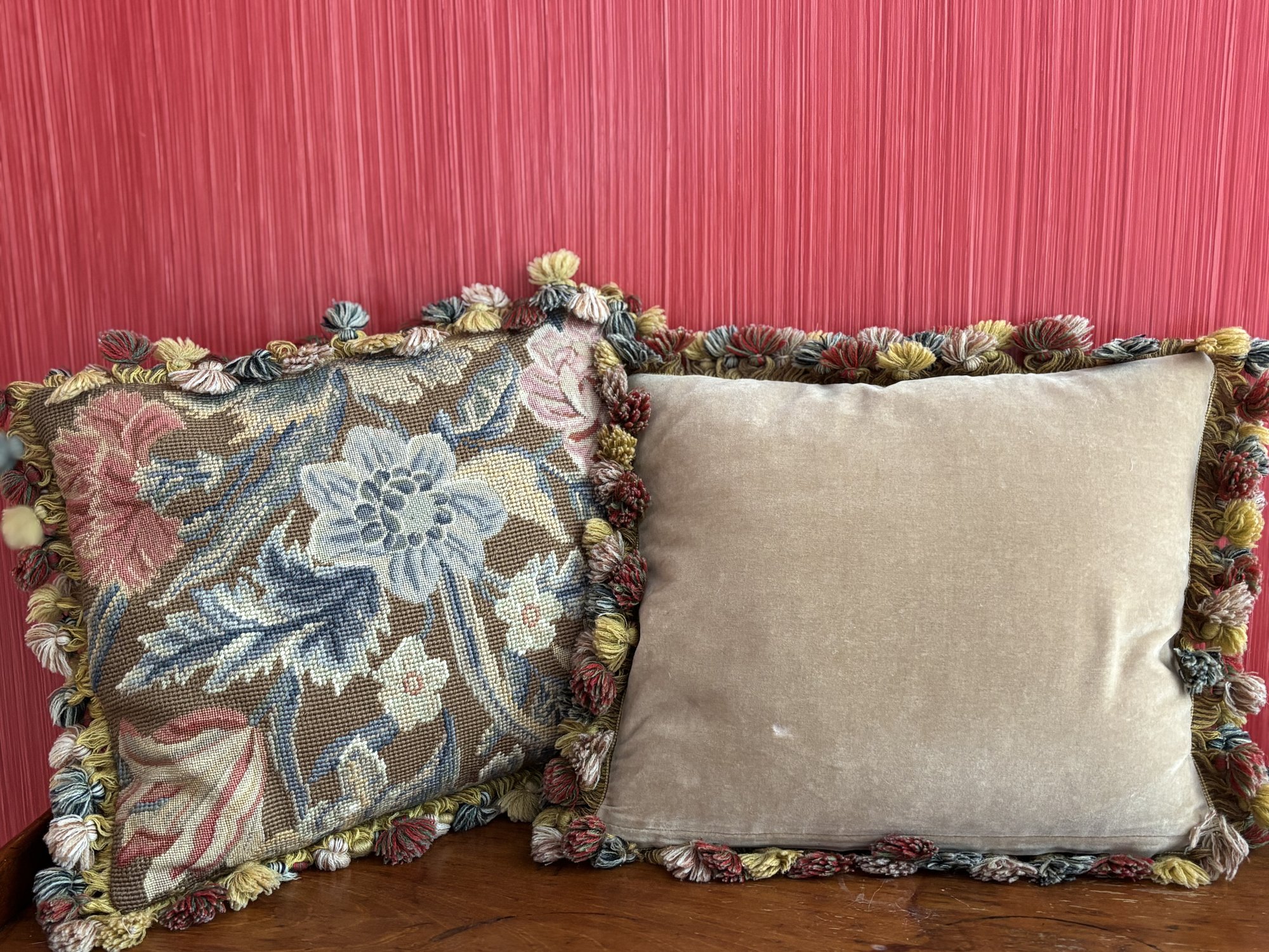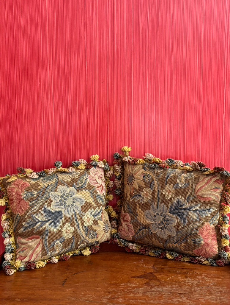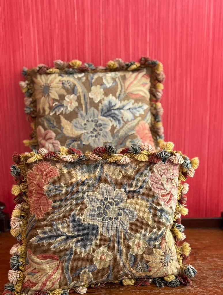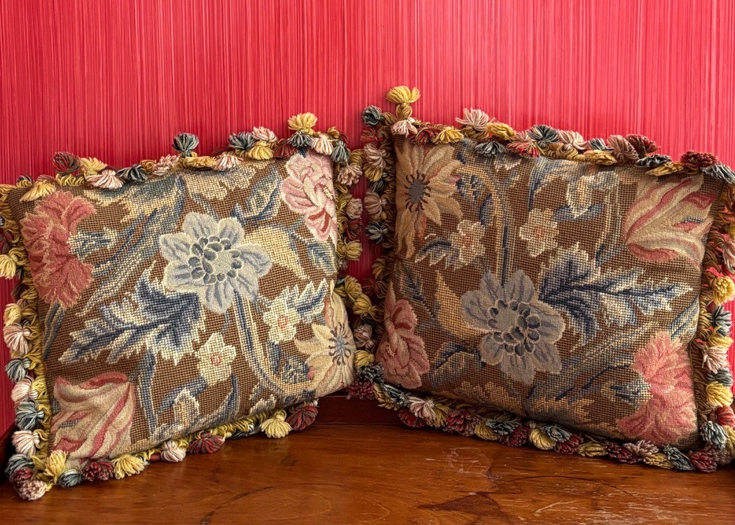 Aubusson handwoven needlepoint floral pillows featuring detailed floral tapestry designs and tassel fringe.
