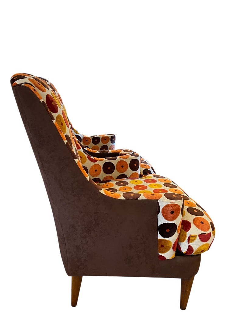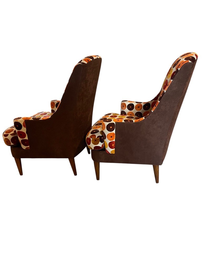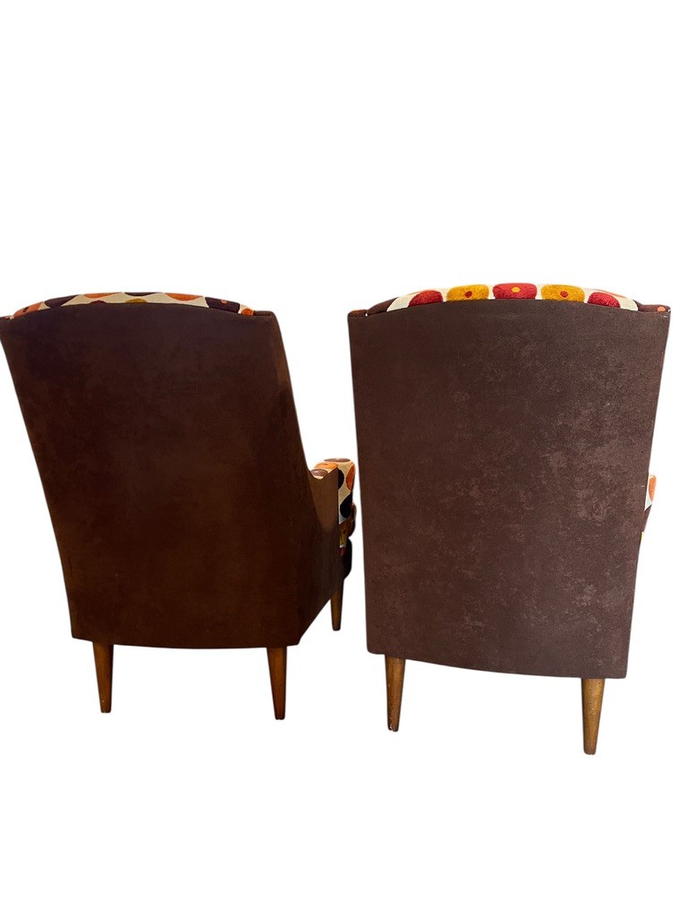 Pair of stylish and eye-catching mid-century style chairs featuring a bold, retro-inspired geometric dot upholstery in warm tones of rust, ochre, brown, and cream. The chairs have a classic barrel-back silhouette with gently sloped arms and tapered wooden legs, giving them a timeless modern profile.