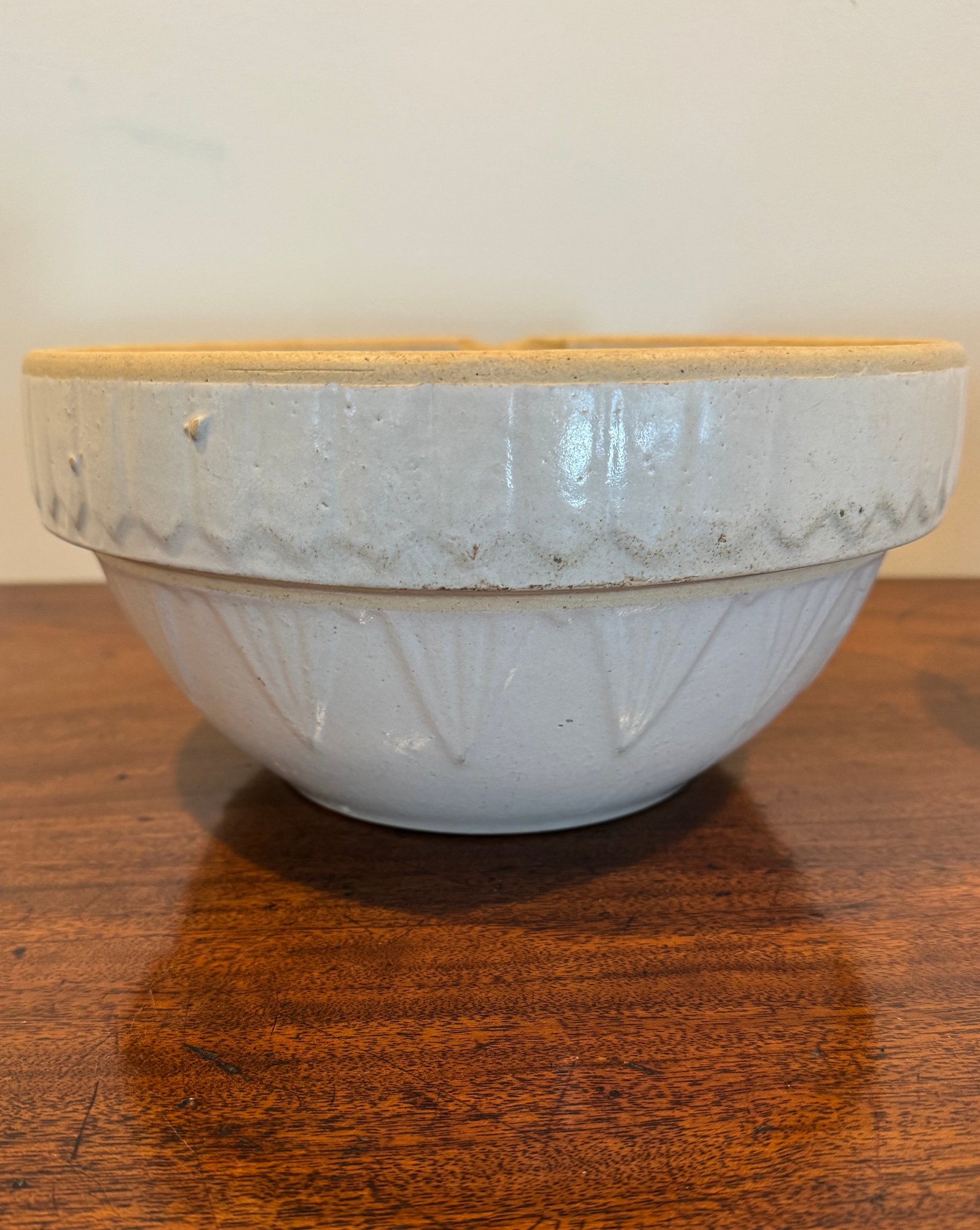 One bowl features a subtle molded exterior pattern, while the other has a smooth, simple body—together creating a complementary yet slightly varied set. These timeless pieces are perfect for farmhouse décor, open shelving, or as functional serving and mixing bowls.