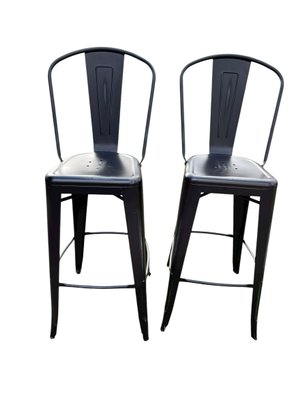 Pair of Tolix style metal bar stools fit for any kitchen or bar area with curved back and comfortable seats.