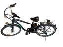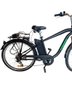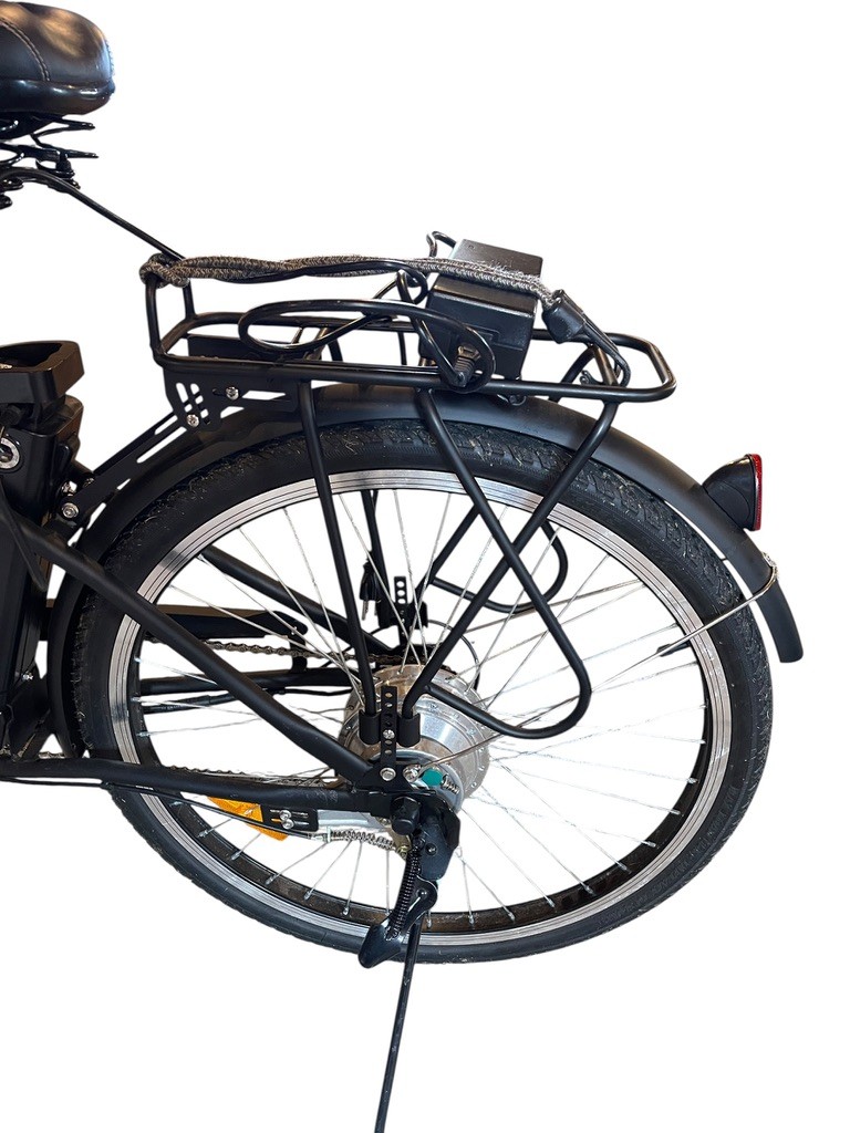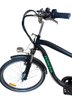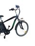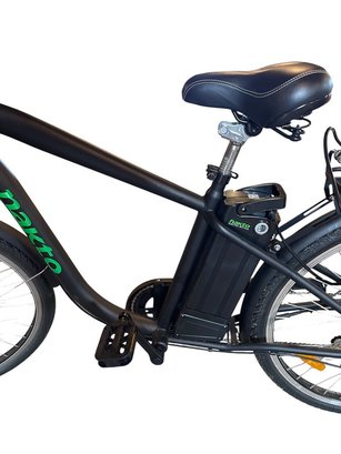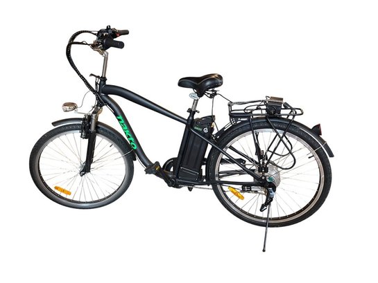 Equipped with a rear hub motor and a removable lithium-ion battery mounted behind the seat tube, offering pedal-assist functionality for added power and extended range. The upright riding position, swept-back handlebars, and wide cushioned saddle provide a smooth, comfortable experience.