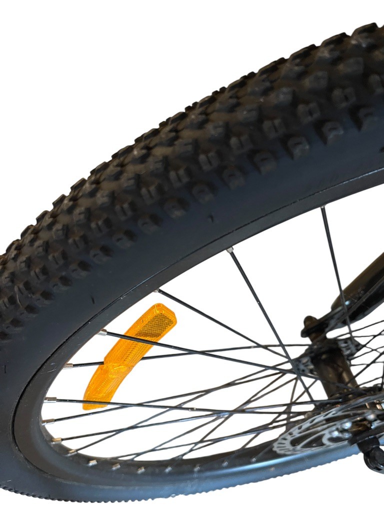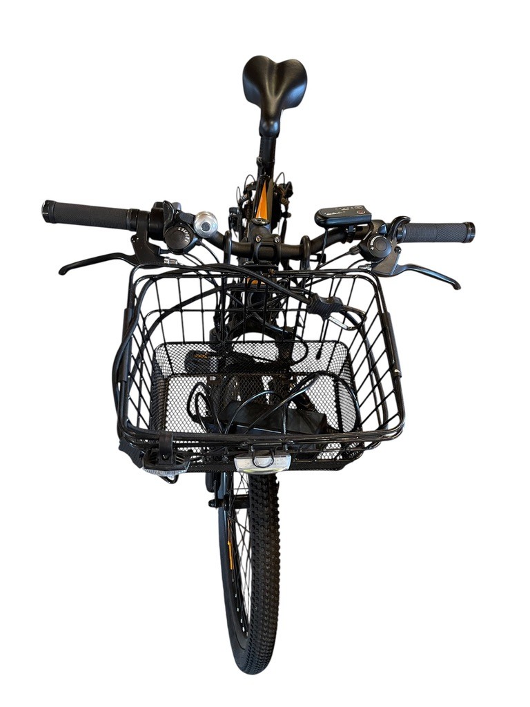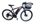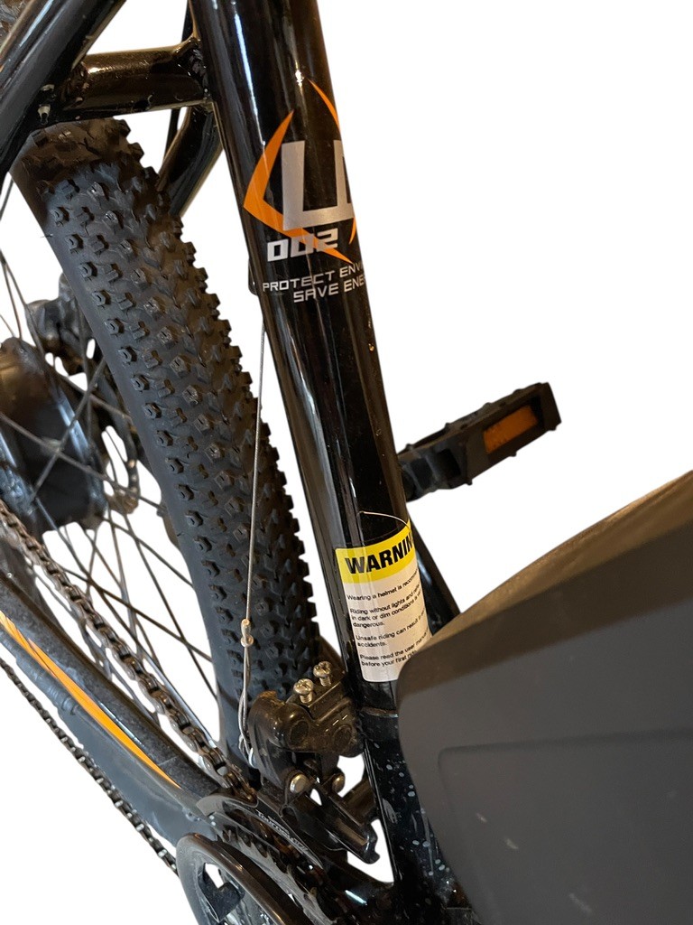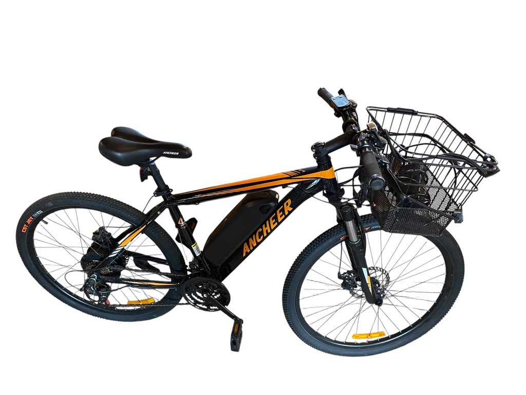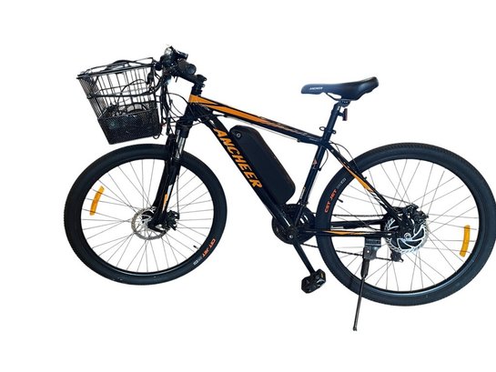 Sleek and versatile ANCHEER electric mountain bike featuring a black frame with bold orange accents. Designed for both commuting and recreational riding, this e-bike is equipped with a removable lithium-ion battery mounted on the downtube, providing pedal-assist power for extended range and easier climbs.