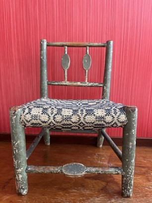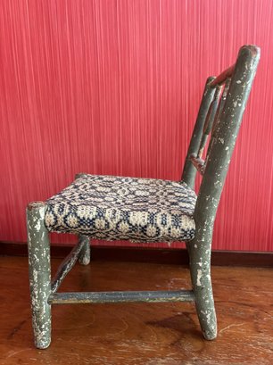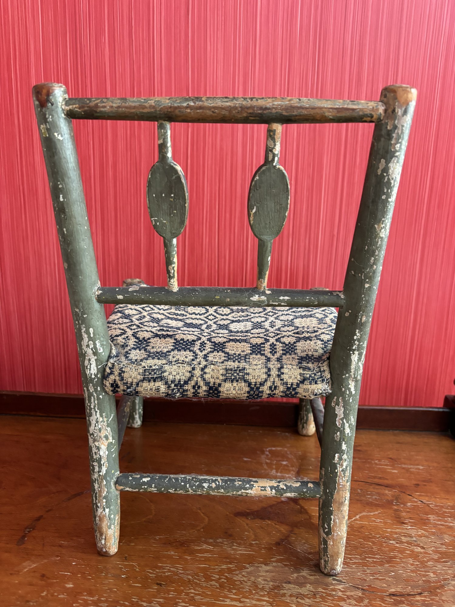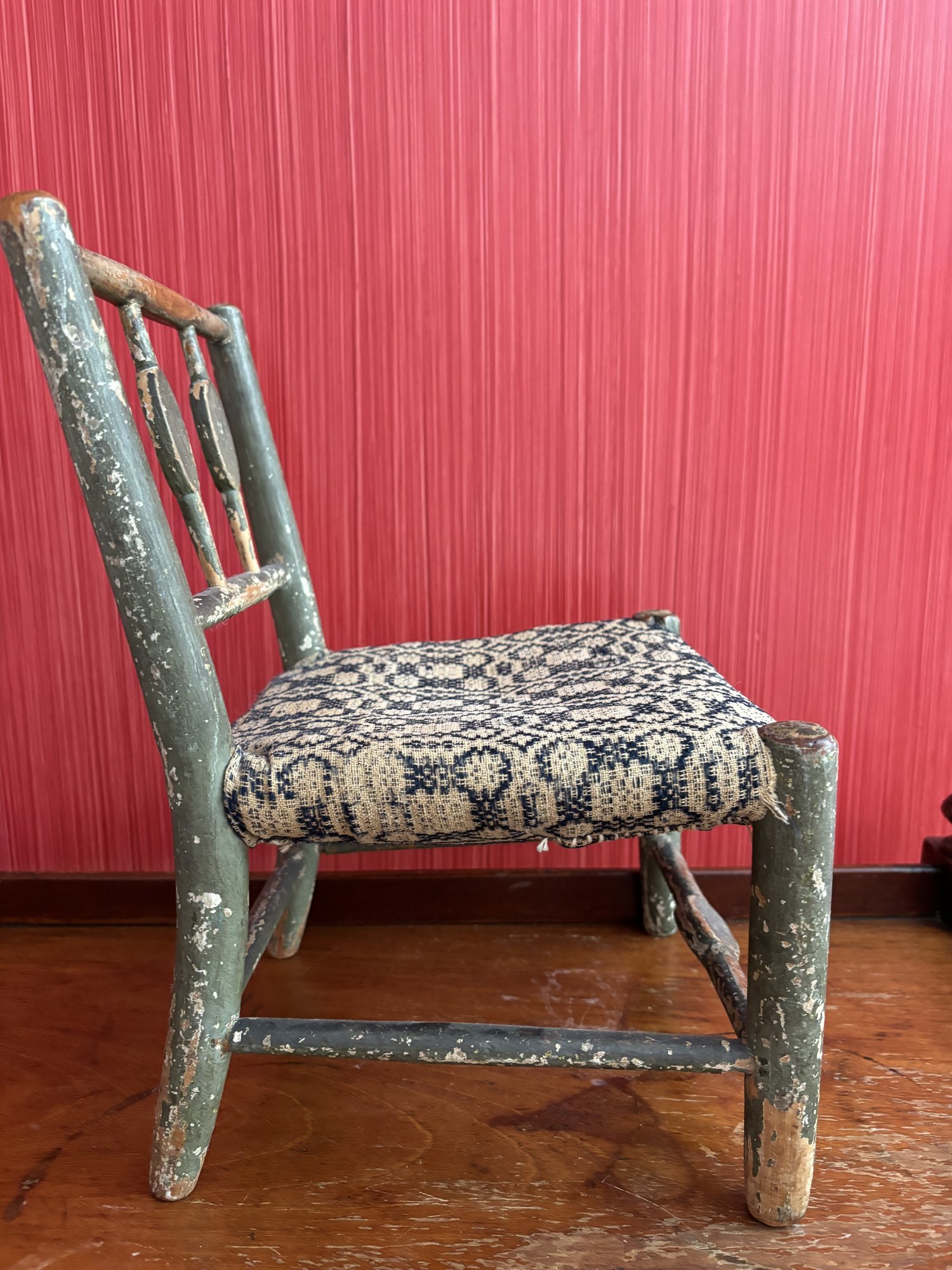 Antique child's doll chair with a green painted wooden frame and woven patterned seat. The chair is distressed with chipping, paint and scuffs to the wood only adding to its charm.