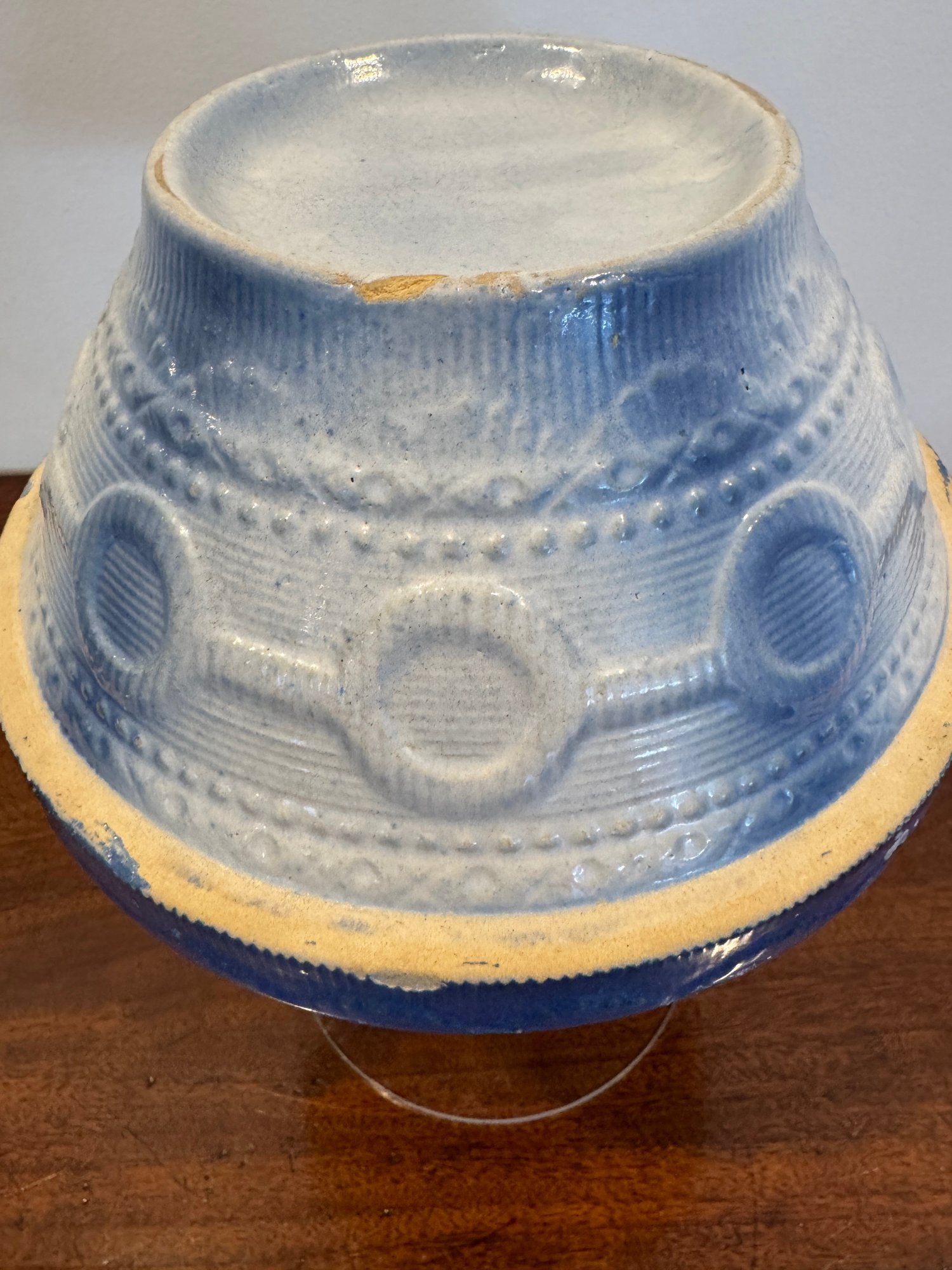 Exceptional antique stoneware bowl featuring a vivid cobalt blue glazed rim with beautifully modeled decorative detailing throughout the body. The bowl showcases alternating impressed medallions and banded textures, giving it strong visual interest and depth. The deep cobalt glaze cascades slightly over the rim, creating attractive tonal variation against the lighter blue-gray body. The interior is fully glazed, and the bowl retains a substantial weight and balanced form typical of quality early pottery.