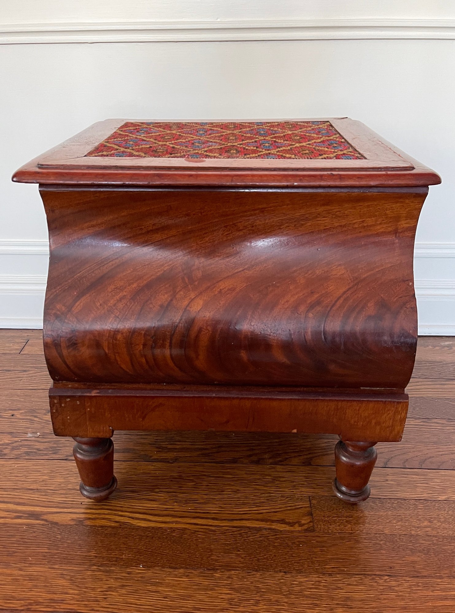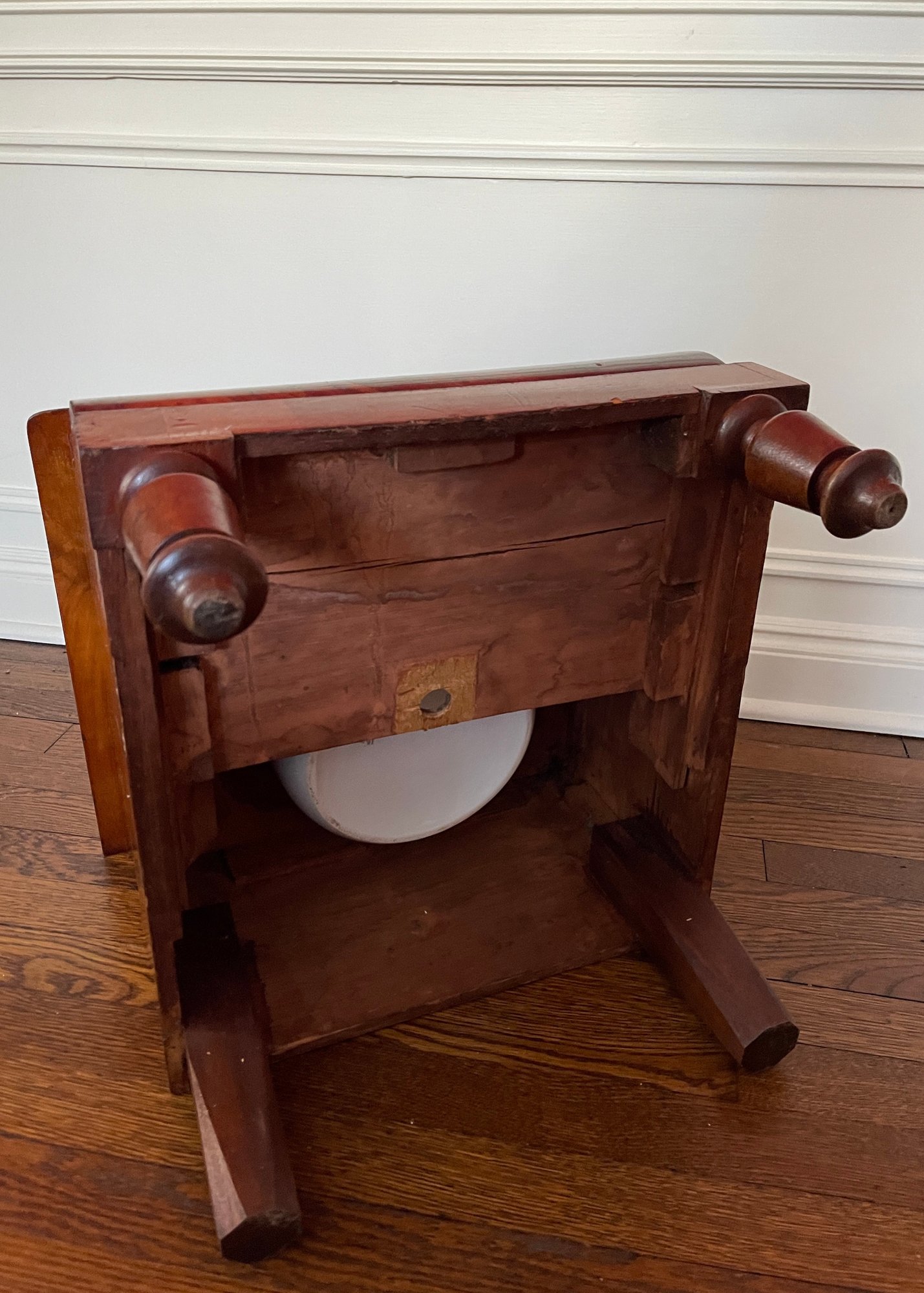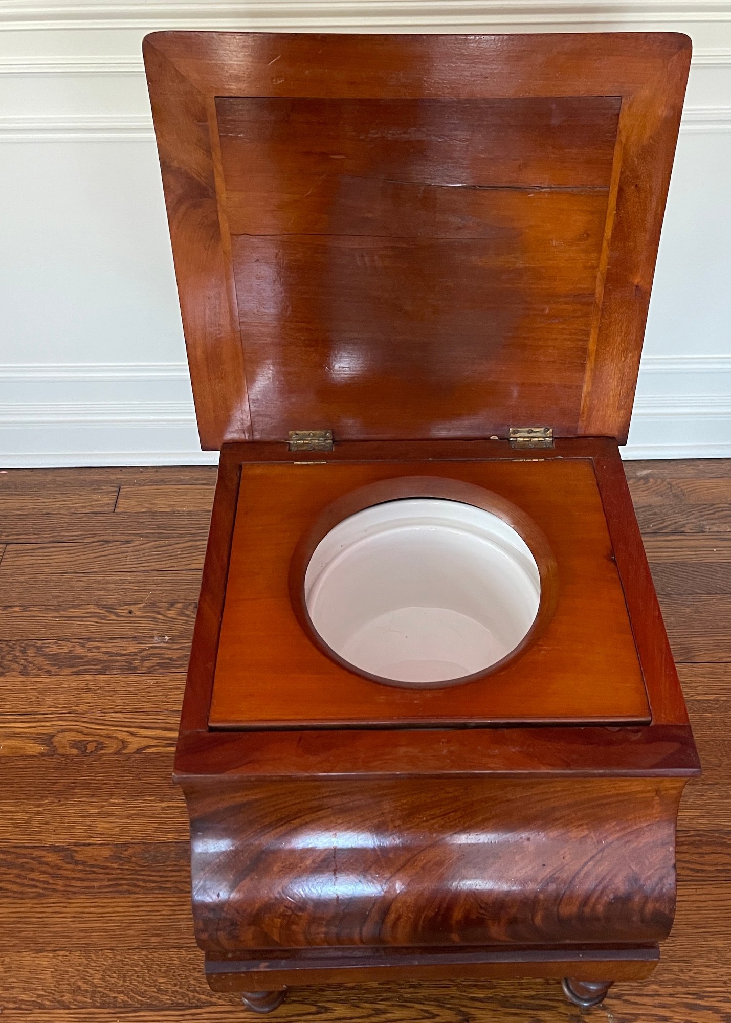 19th century mahogany hinged lid commode that opens to reveal a circular seat designed to hold a chamber pot. Chamber pot is included in this piece historically used as a discreet bathroom fixture in bedrooms before indoor pluming was common.