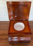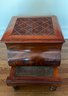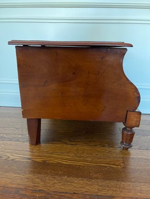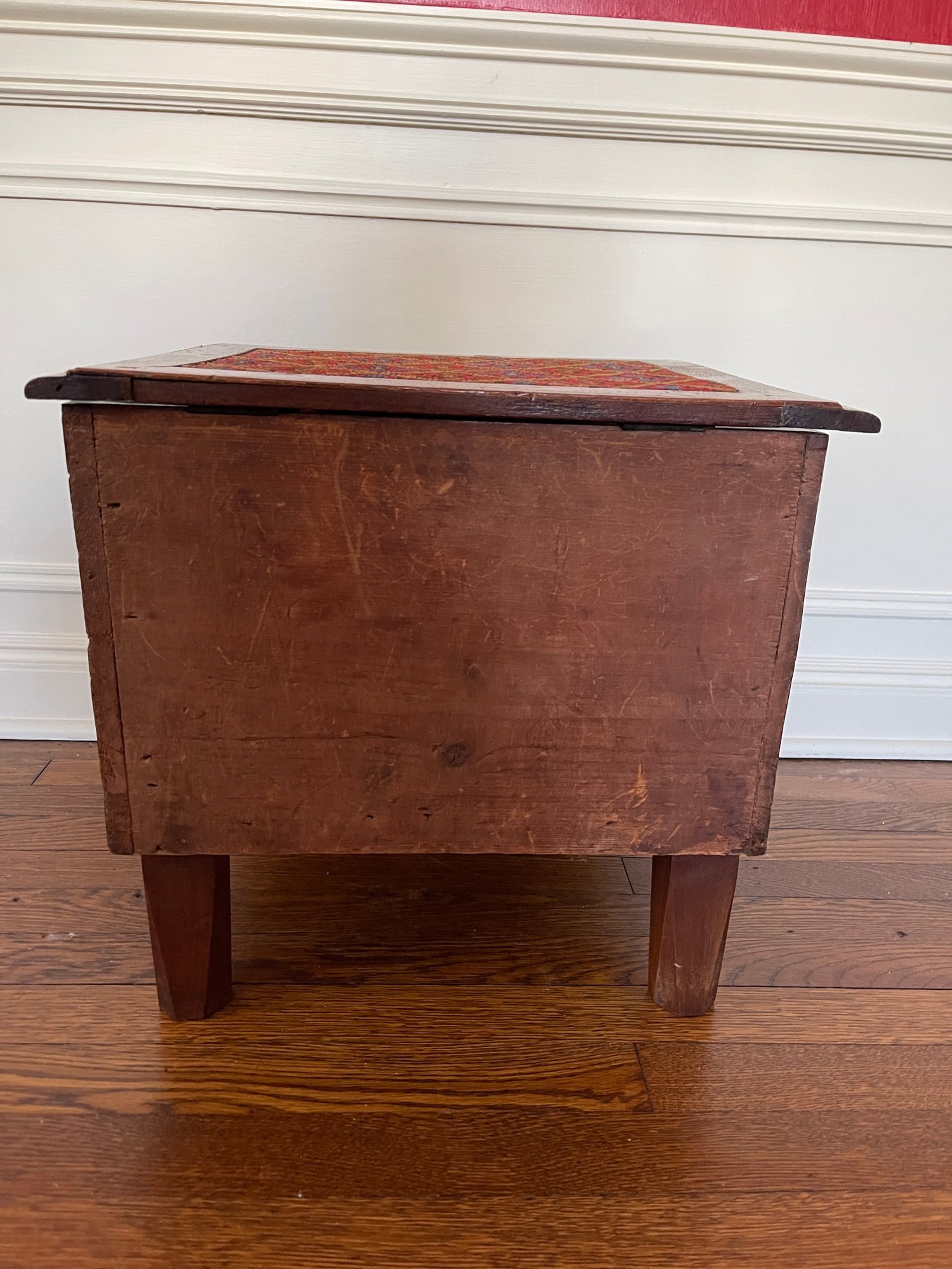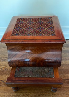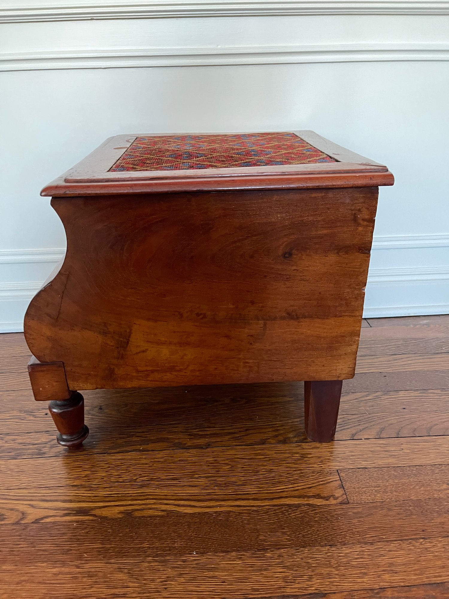 19th century mahogany hinged lid commode that opens to reveal a circular seat designed to hold a chamber pot. Chamber pot is included in this piece historically used as a discreet bathroom fixture in bedrooms before indoor pluming was common.