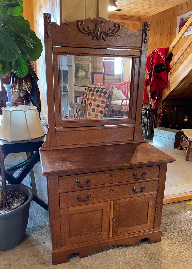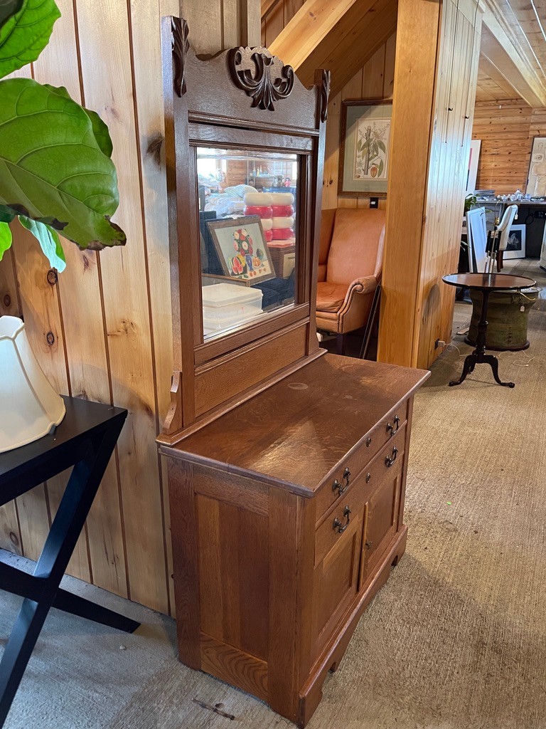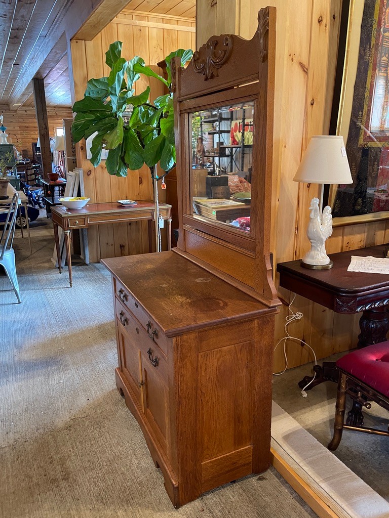 Attractive antique oak dresser featuring a warm, medium-toned finish and a classic two-piece design with attached mirror. The upper mirror is framed by a beautifully carved crest with scroll and foliate detailing, adding elegance and visual interest.