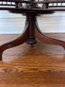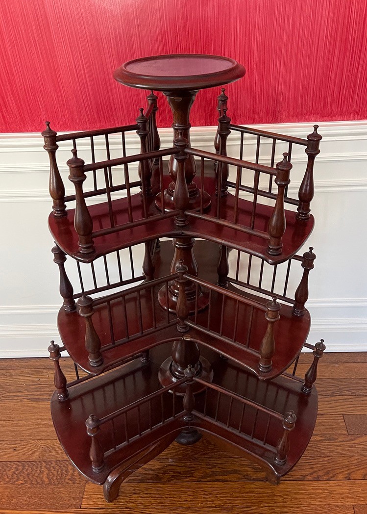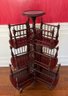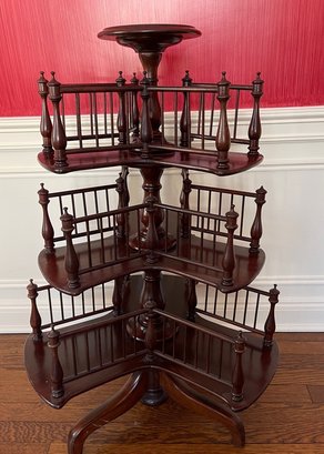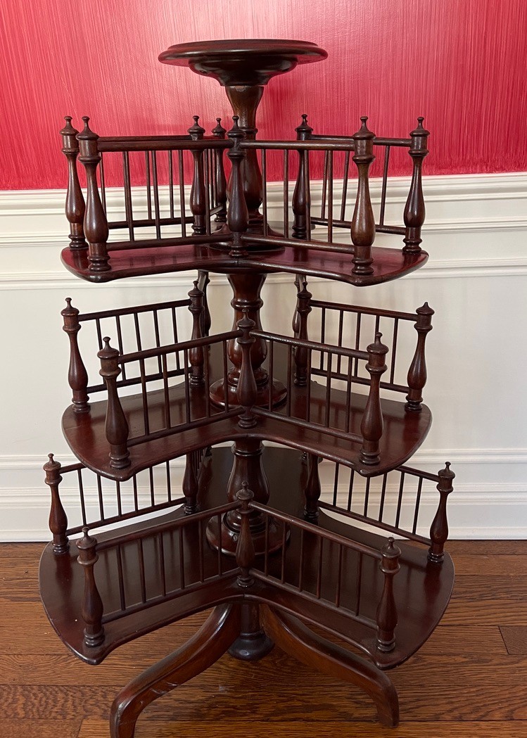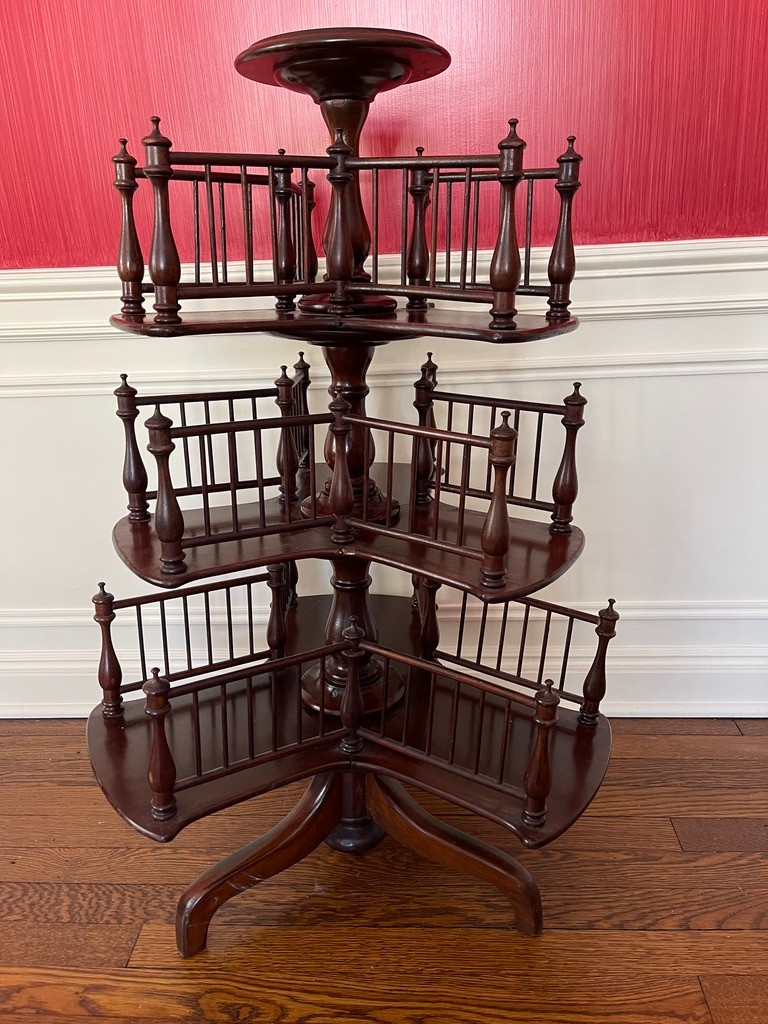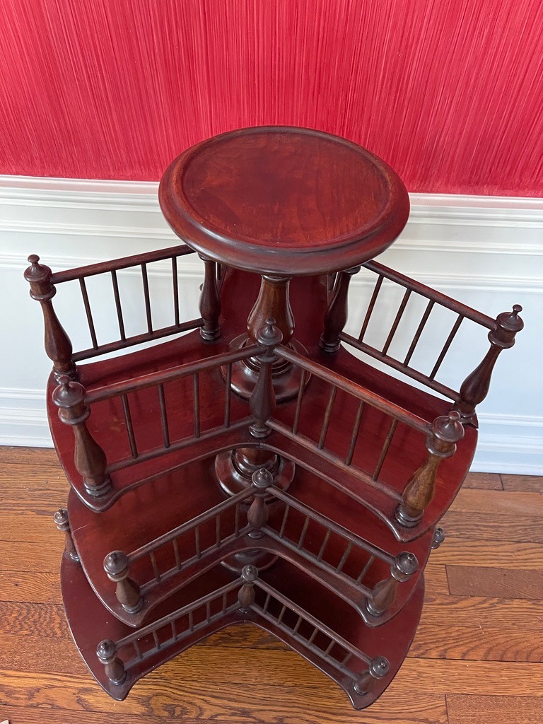 Victorian mahogany revolving bookstand from the 19th century with a circular top and three revolving spindle bookshelves on a tripod base.