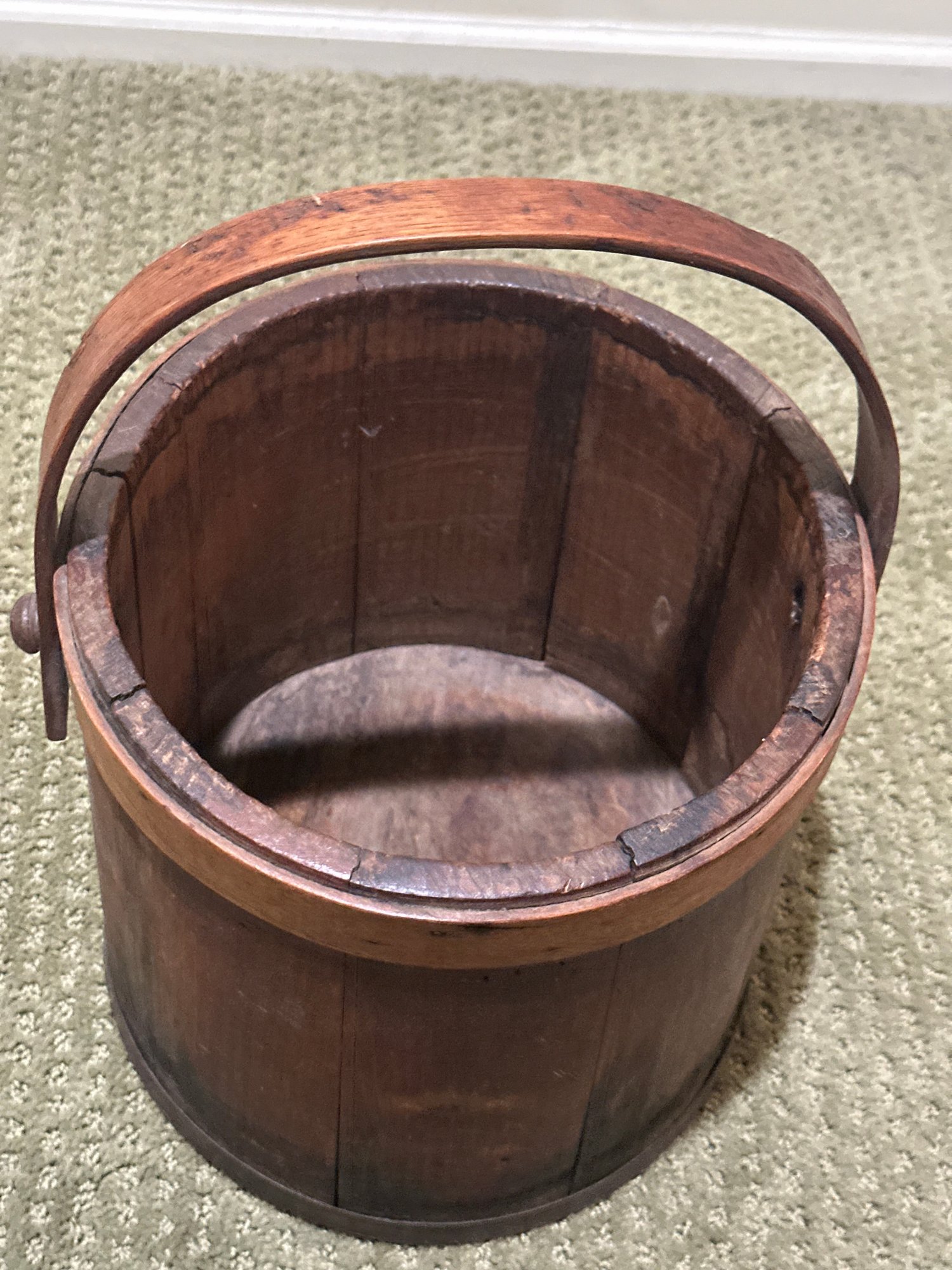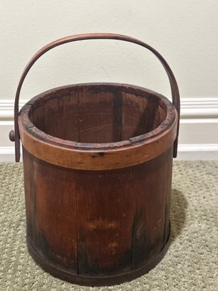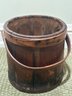 Antique wooden firkin, a type of collectible lidded bucket historically use for storing goods like sugar or lard. The bucket is made of vertical stave construction with bentwood bands and a swing handle. This item is highly collectible.