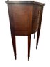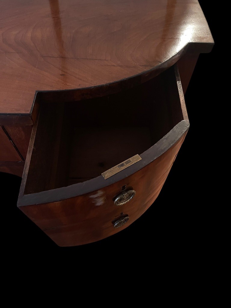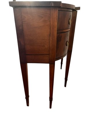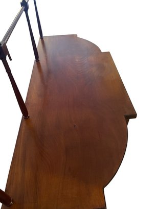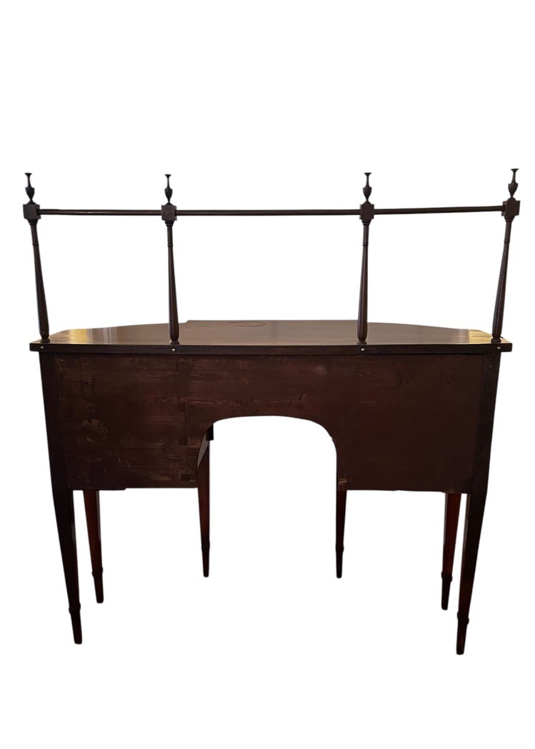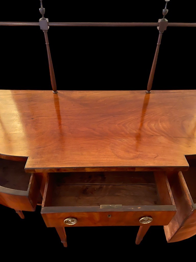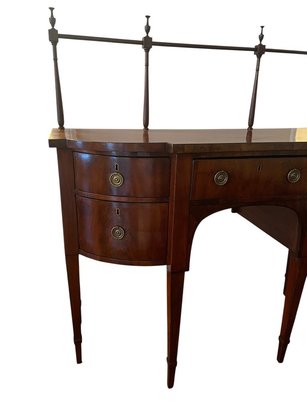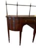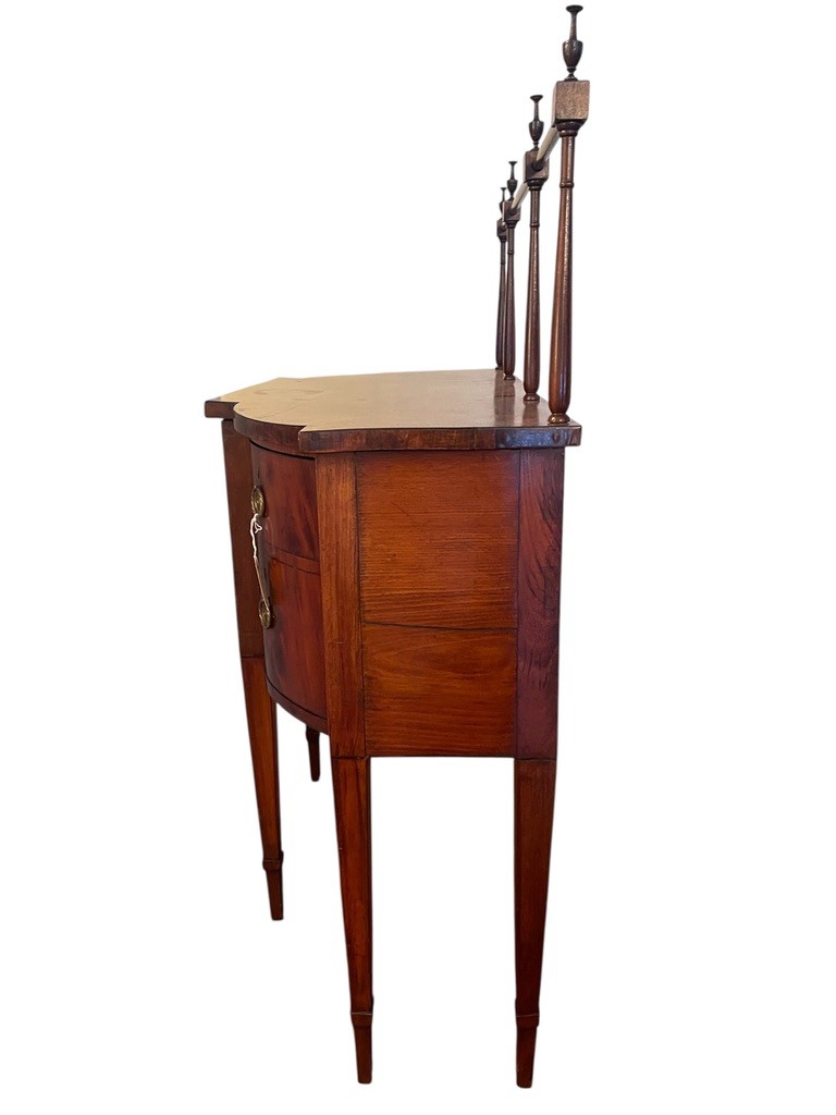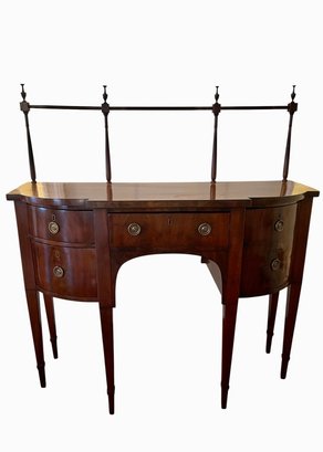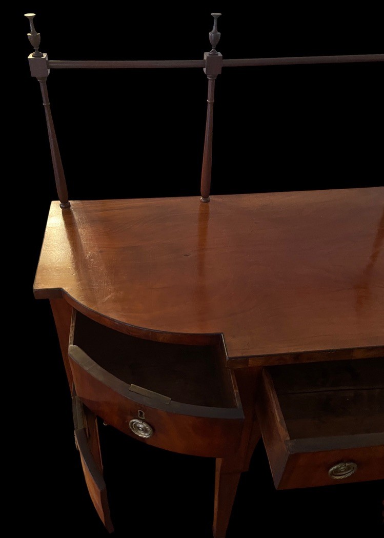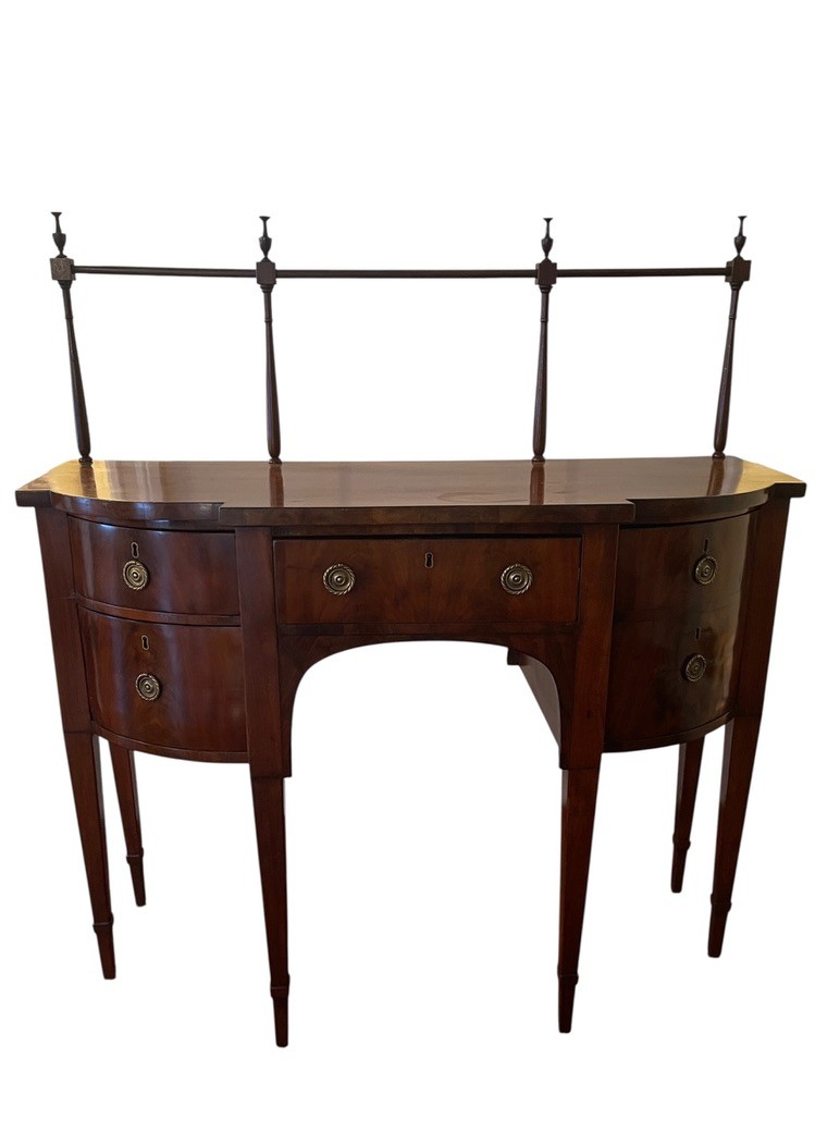 Antique George III style mahogany serpentine sideboard with rail, dovetailed drawers and slender tapered legs. With rail 52" high