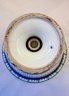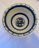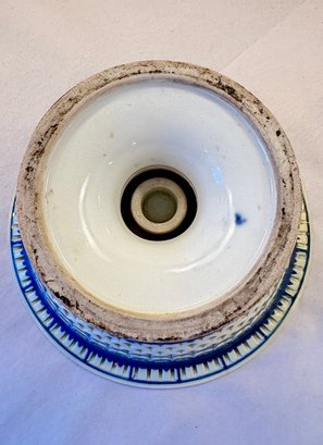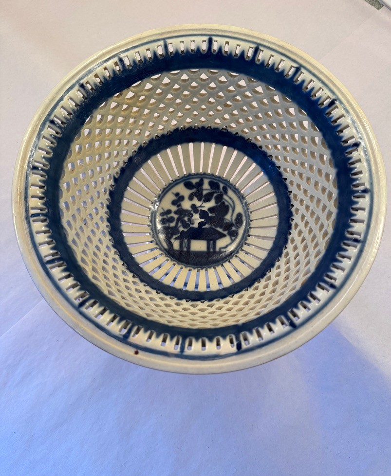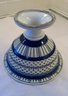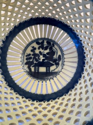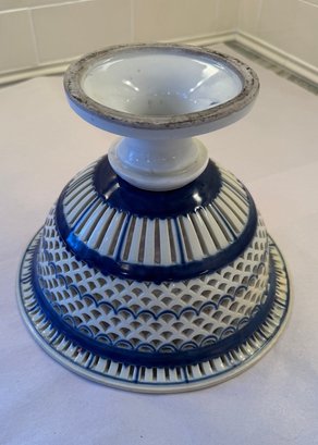 Decorative blue and white porcelain pedestal bowl or compote featuring intricate pierce lattice work