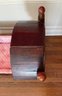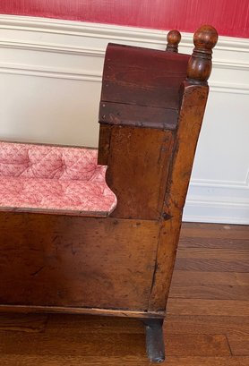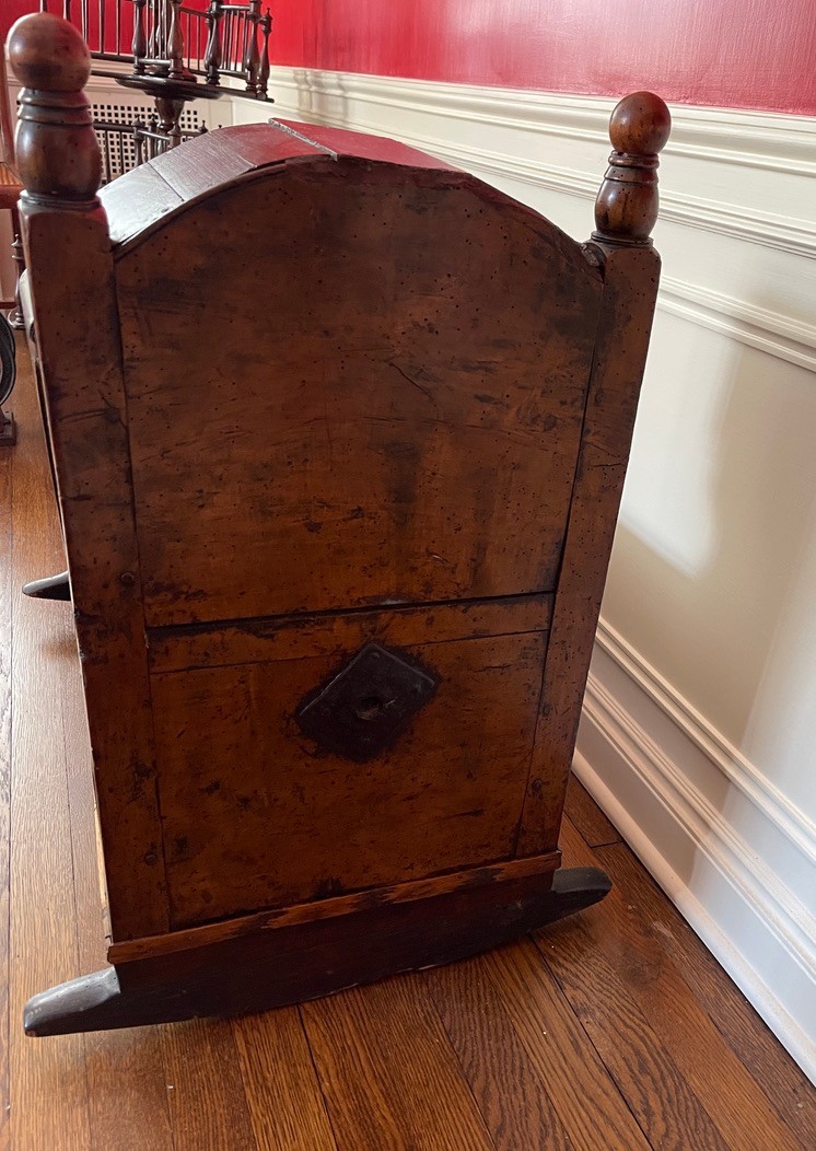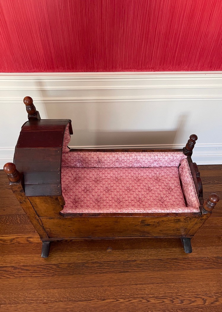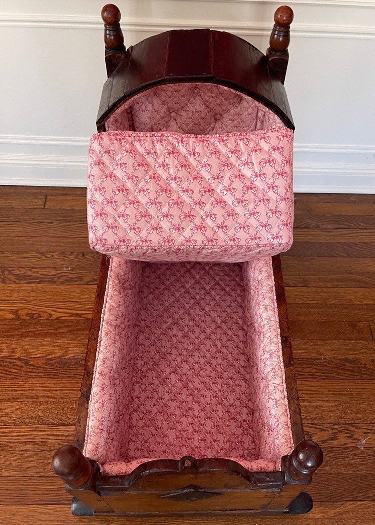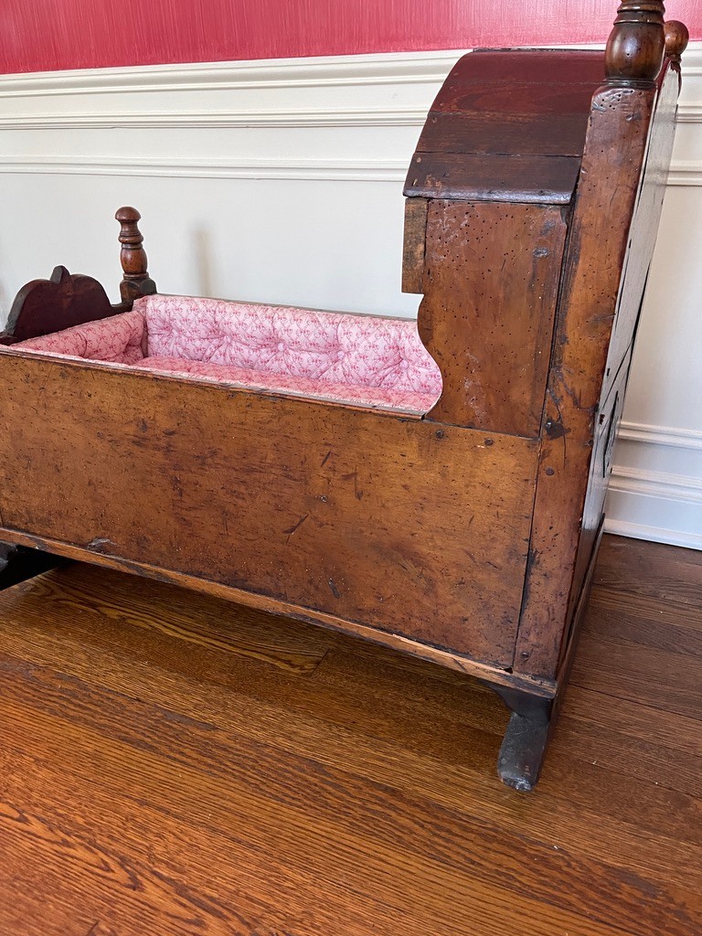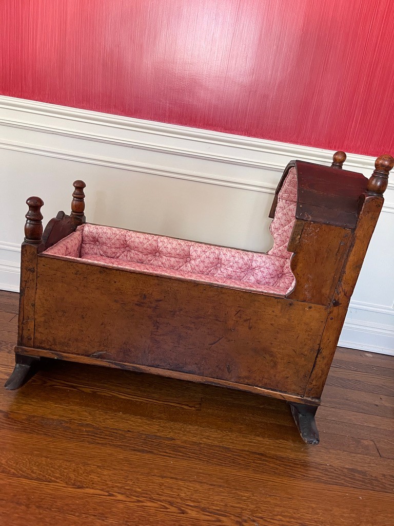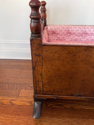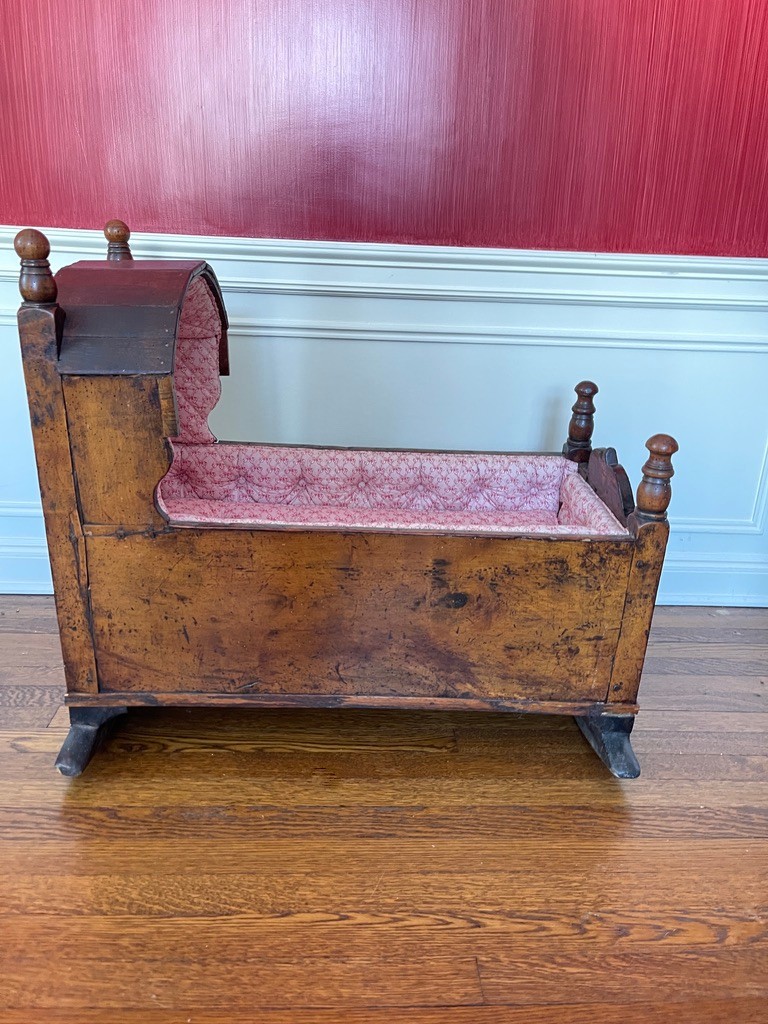 Antique wooden rocking cradle dating back to the 19th century. This heirloom piece features a hooded design and constructed from solid wood. Custom upholstered interior with tufted mattress.