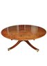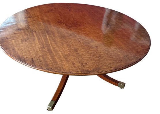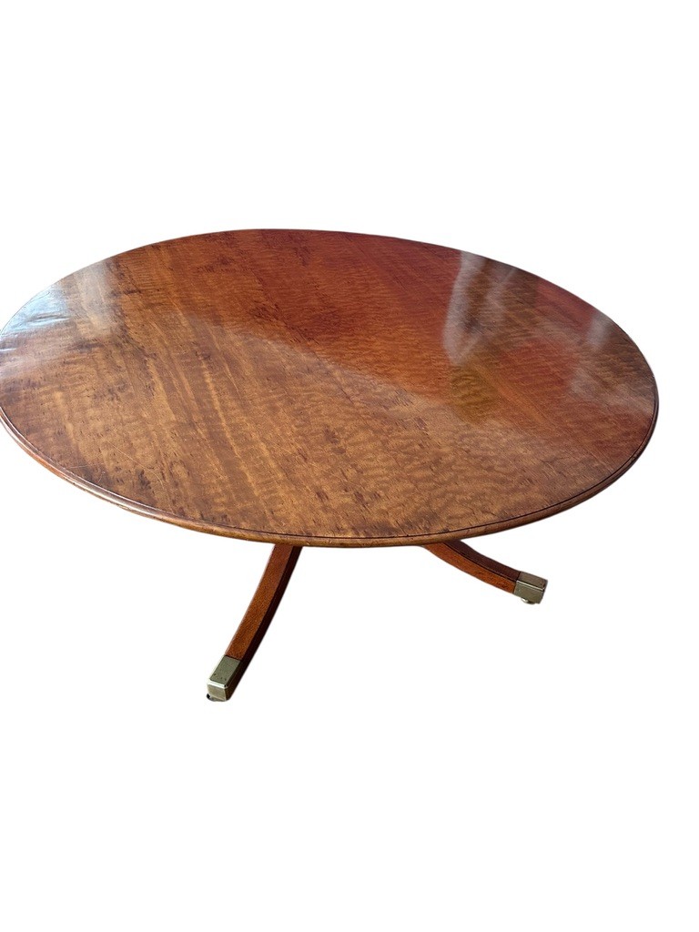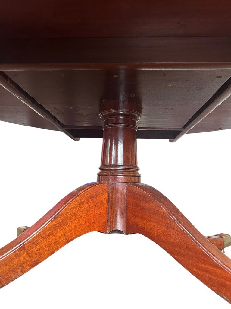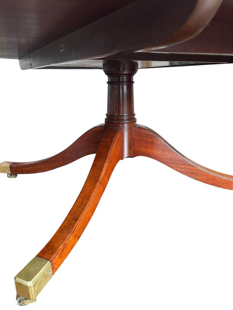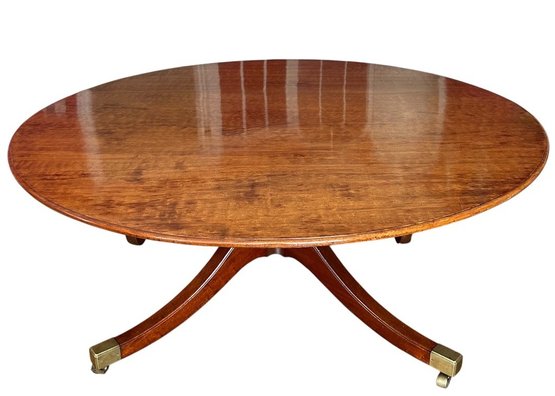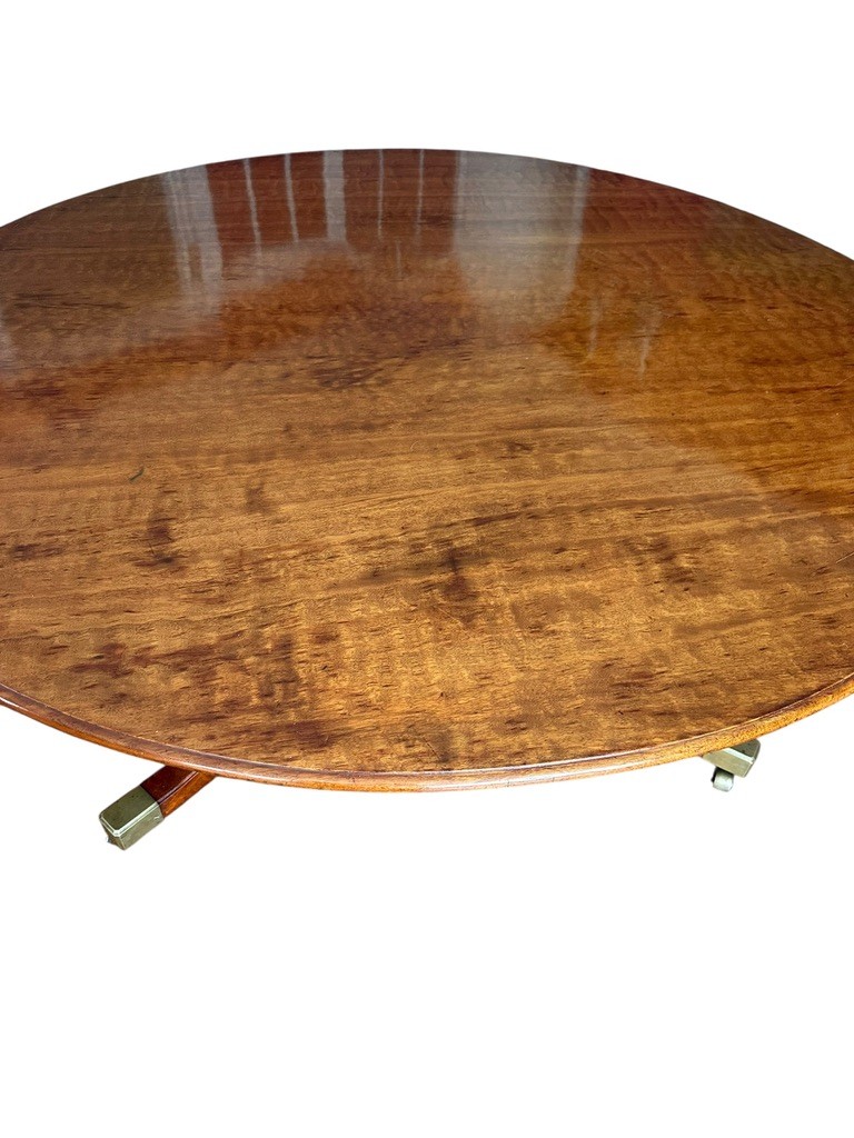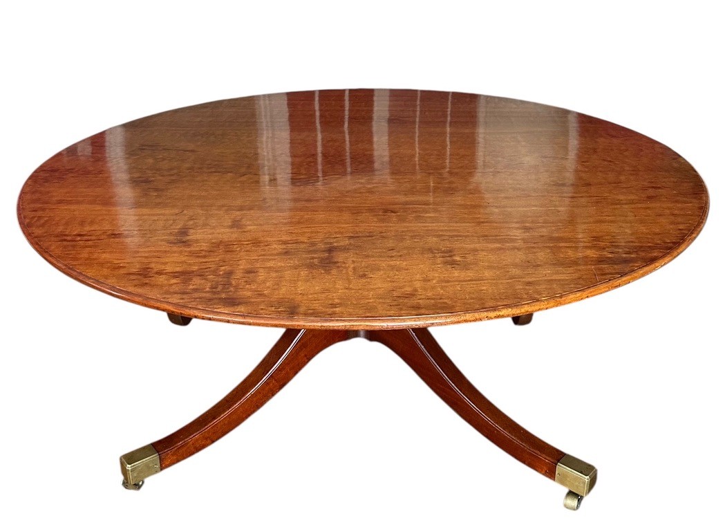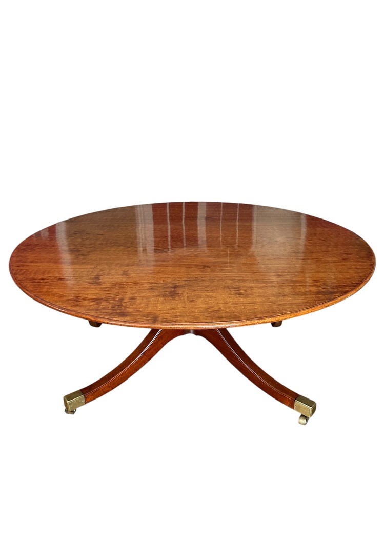A stunning period mahogany table of superb color on a quadripartite carved base terminating in four outswept legs and fitted with original brass casters. This fine antique was purchased in England at an antique store likely dating back to 1790.