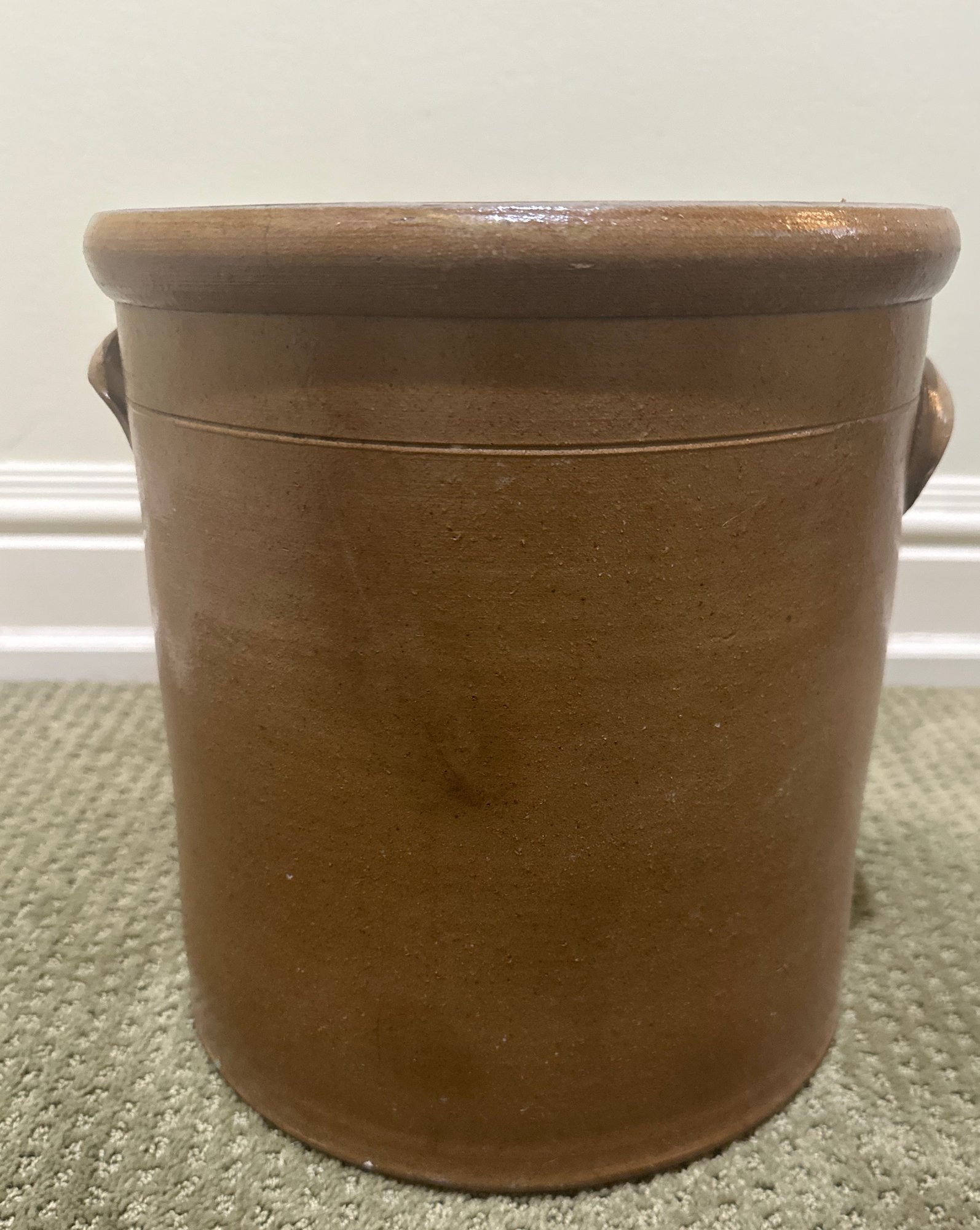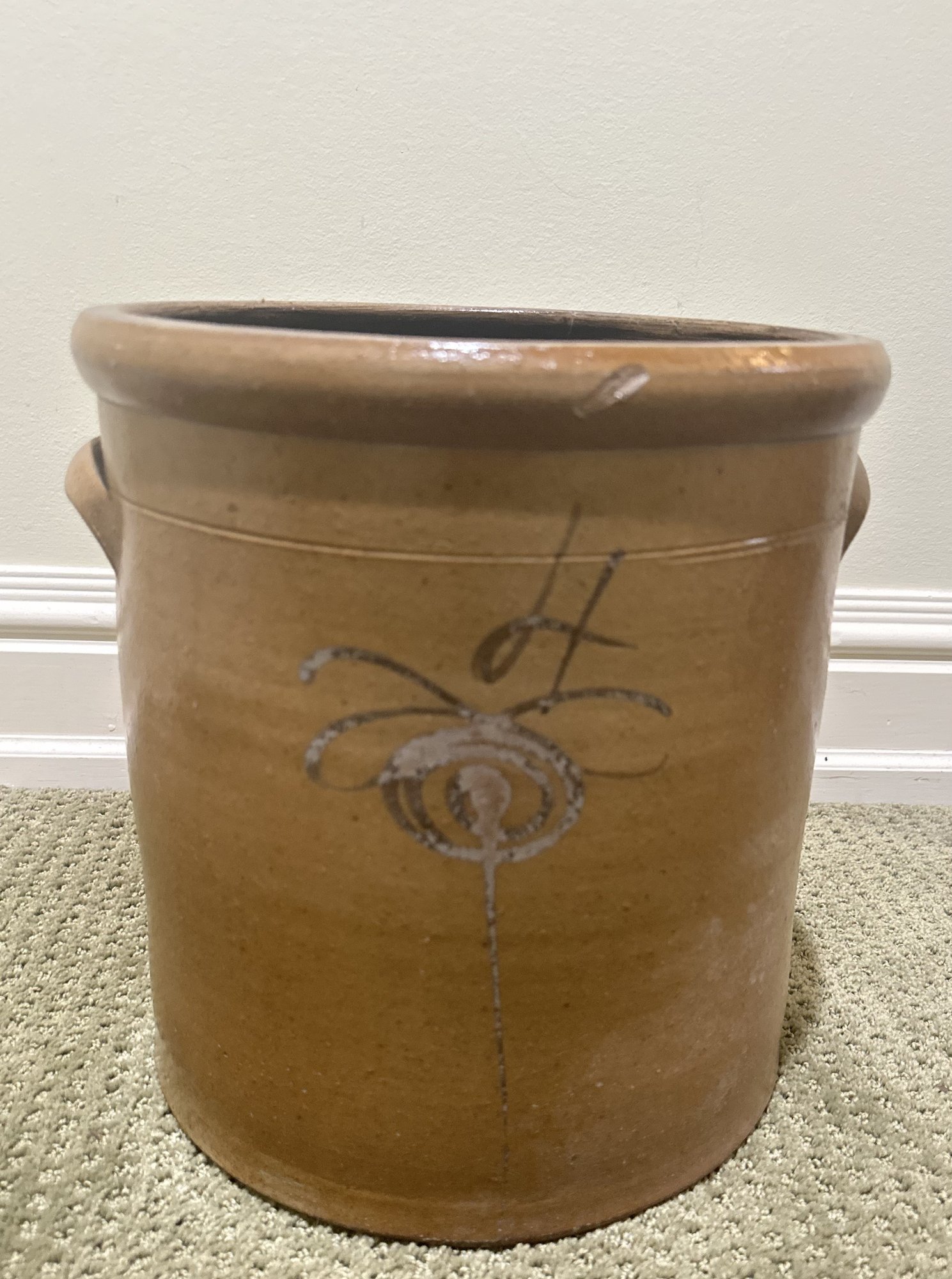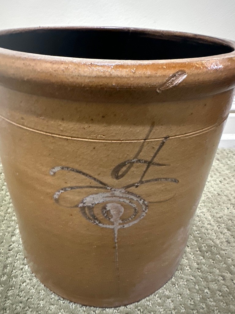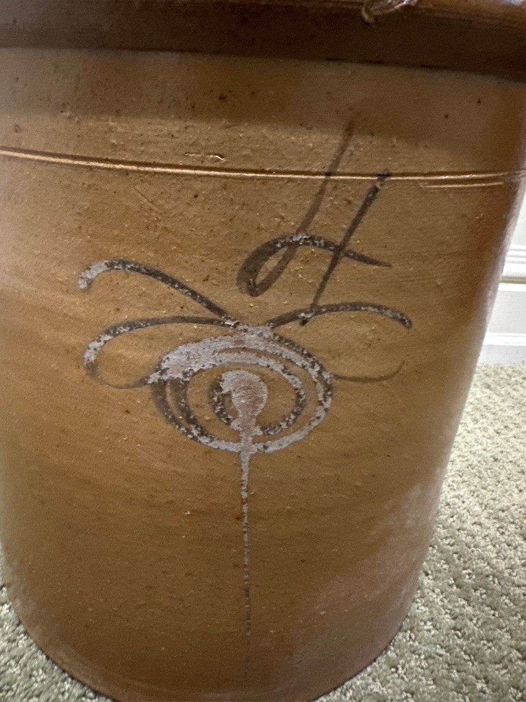The front is decorated with a freehand design often called a “bee sting”, adding visual interest and collectible appeal. Such crocks were commonly used for food storage and preservation, making them both historically significant and highly desirable among collectors.