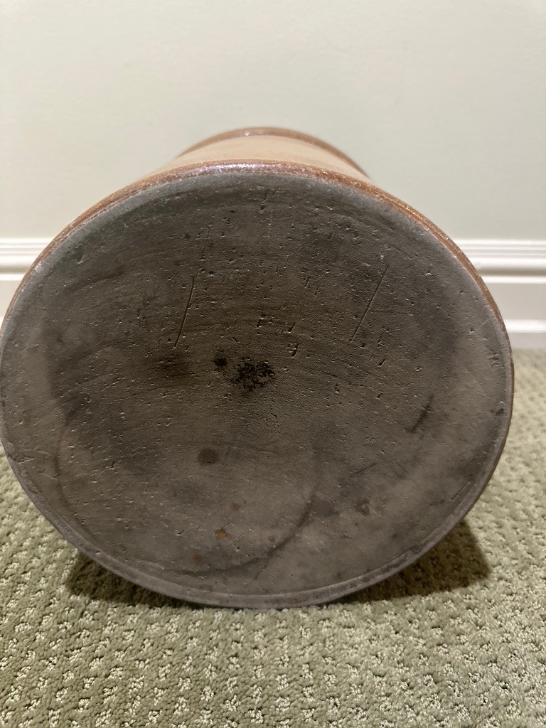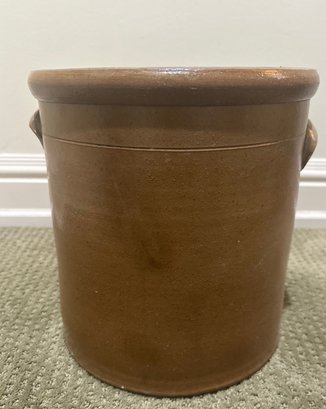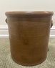 Classic antique salt-glazed stoneware crock featuring a warm honey-brown glaze and hand-decorated motif on the front. The traditional cylindrical form is finished with a thick rolled rim and substantial walls, indicative of quality 19th-century craftsmanship.