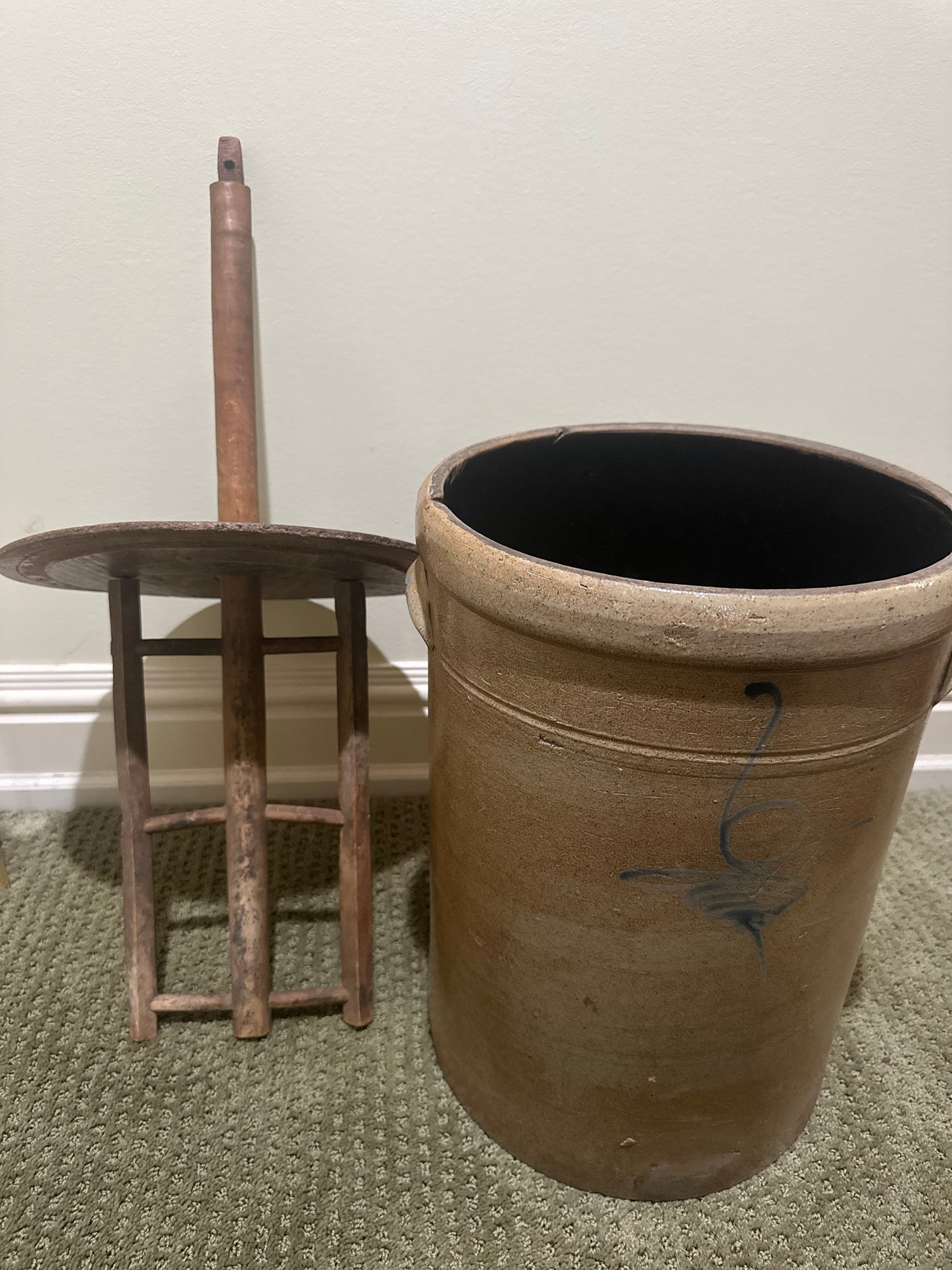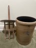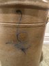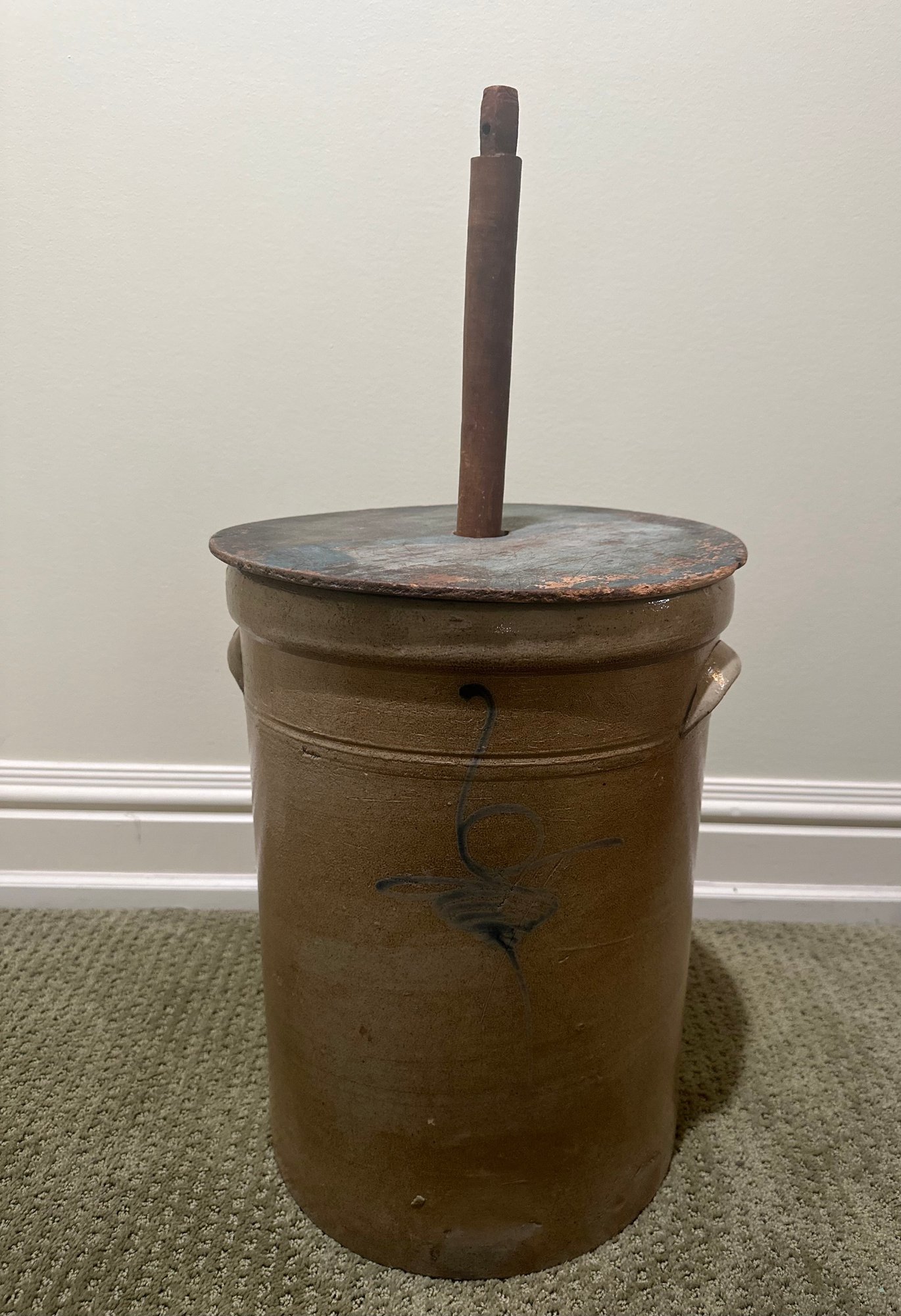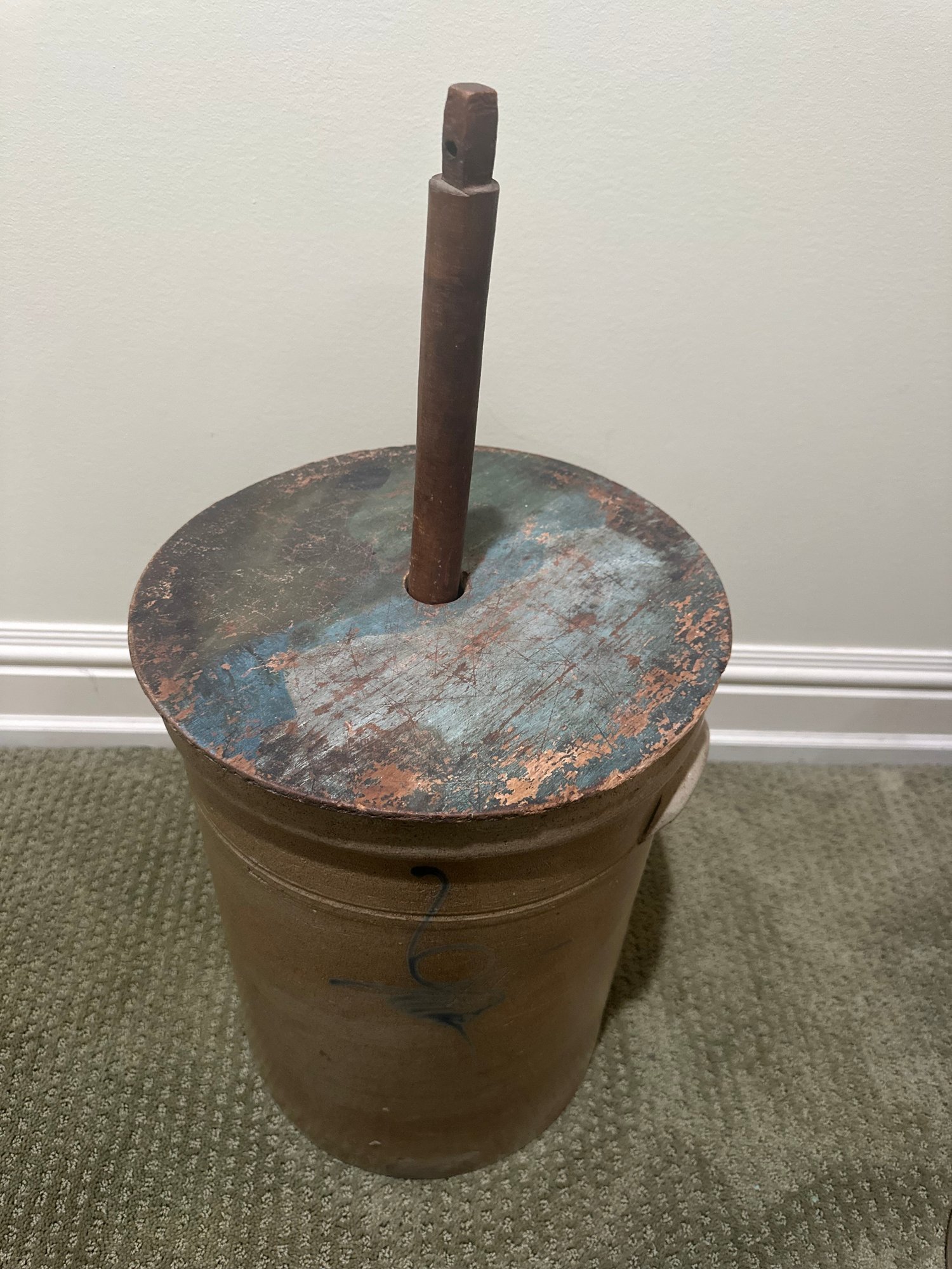 Antique butter churn featuring a cylindrical vessel with a lid and a central wooden paddle. The crock is decorated with a blue slip "bee sting" decoration.
