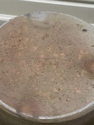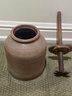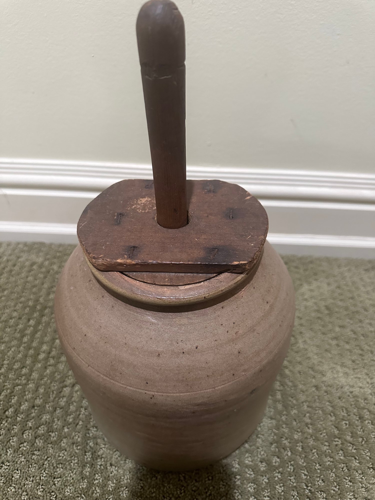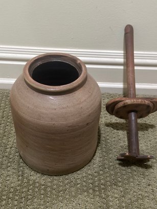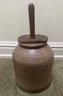 Antique stoneware butter churn crock with wooden dasher made of salt-glazed pottery. Includes the cylindrical crock base and wooden lid with a center hole for dasher, plunger used for churning.