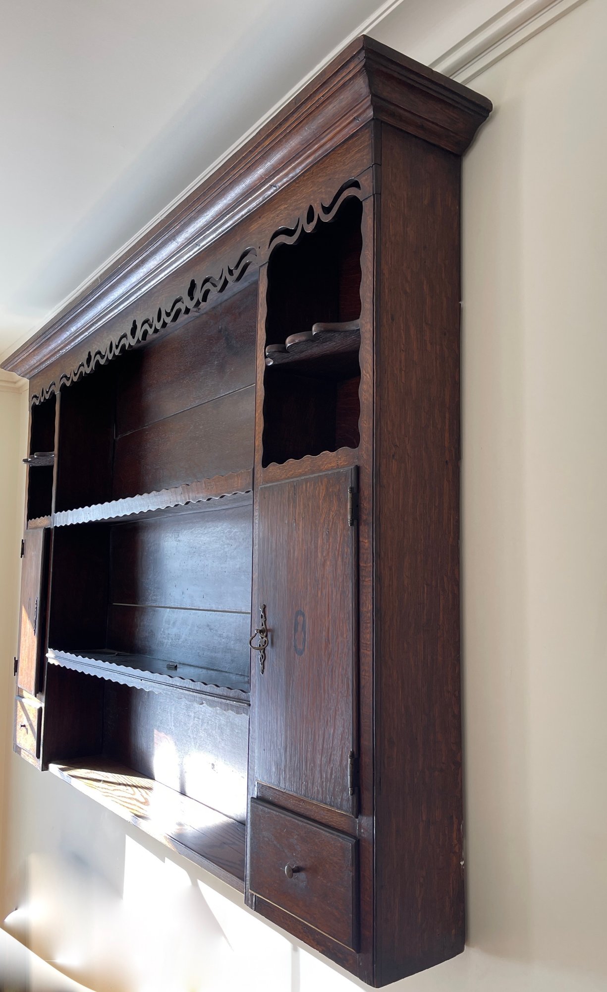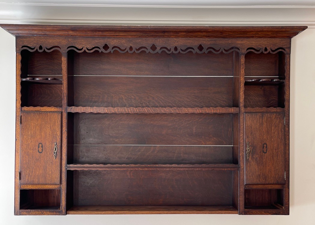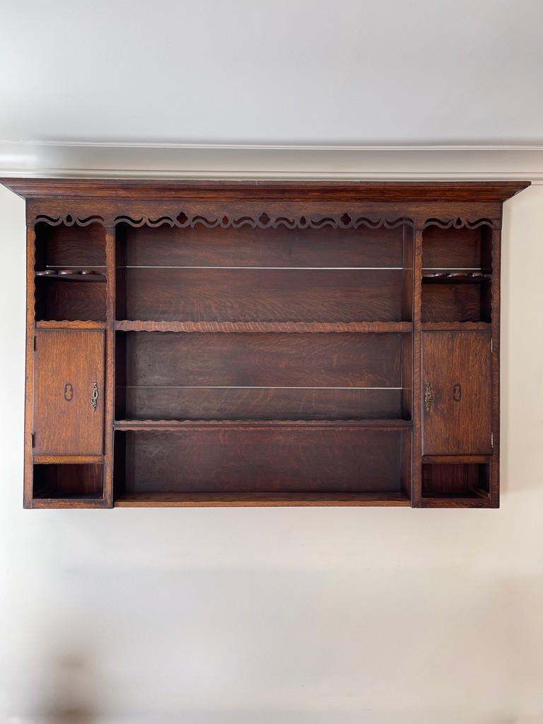 Antique Welsh wooden wall-mount display cabinet or plate rack with open shelves and side cupboards for storage. Features multi-level open shelving for displaying decorative items or plates with small cabinets on either side.