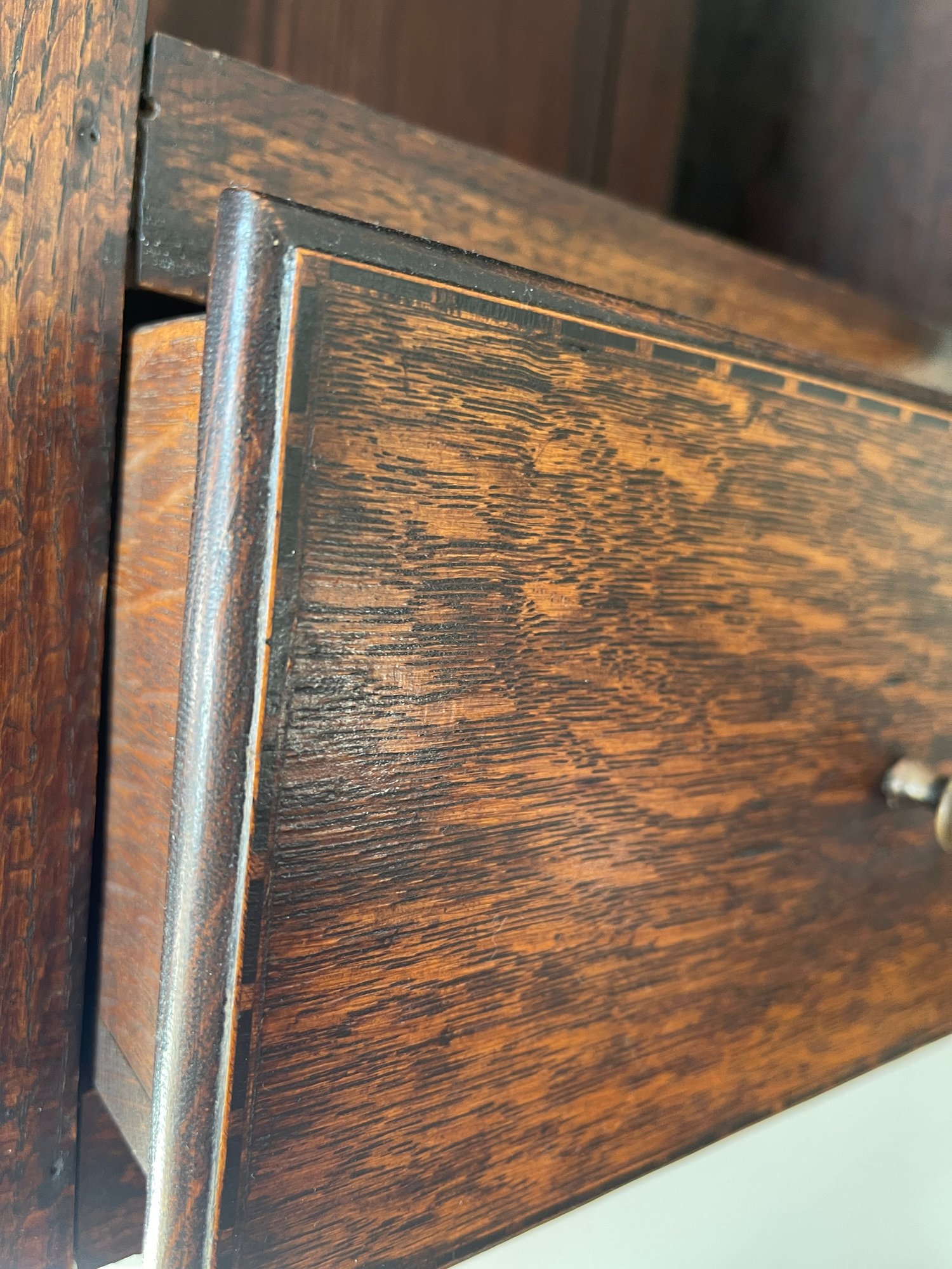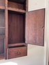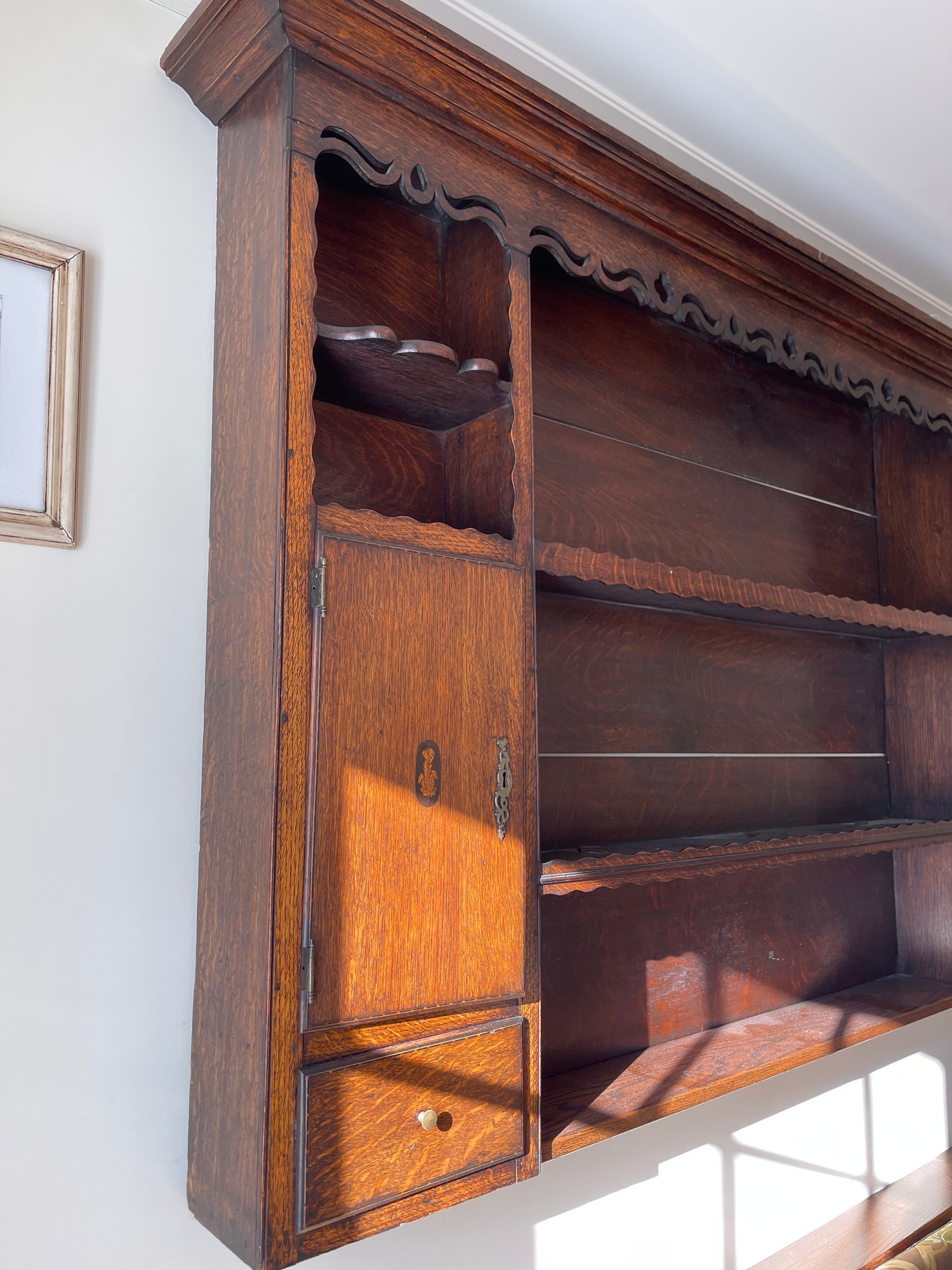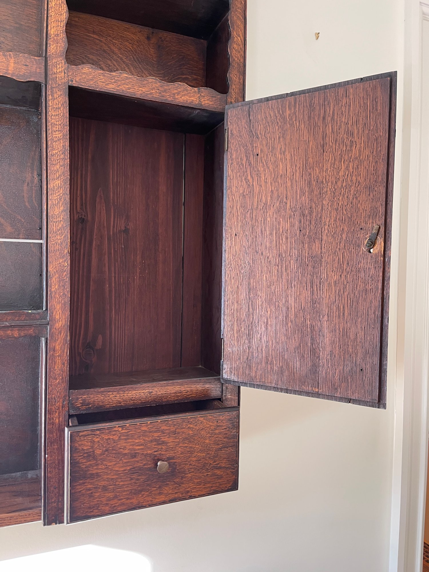 Antique Welsh wooden wall-mount display cabinet or plate rack with open shelves and side cupboards for storage. Features multi-level open shelving for displaying decorative items or plates with small cabinets on either side.