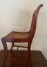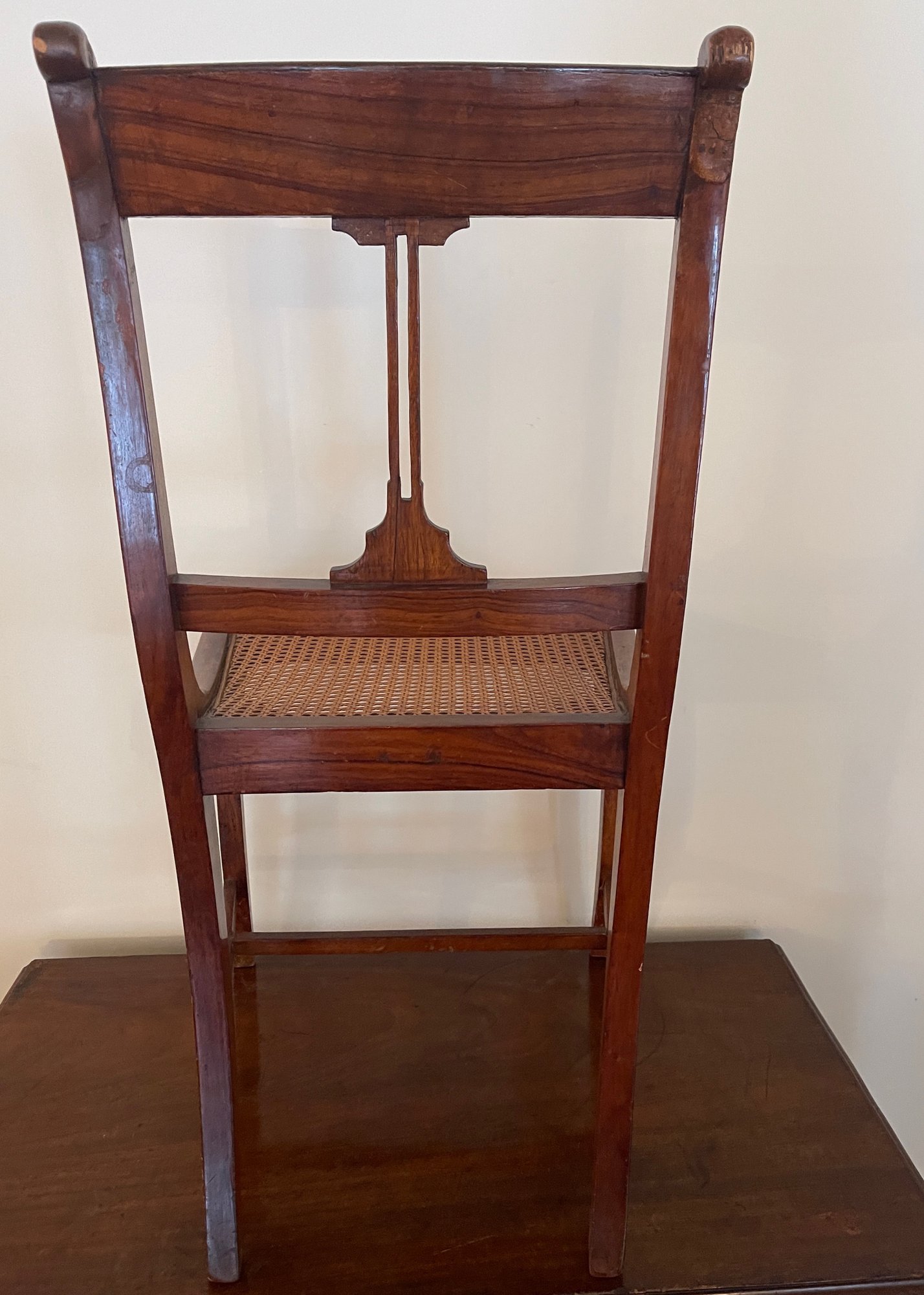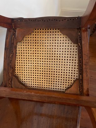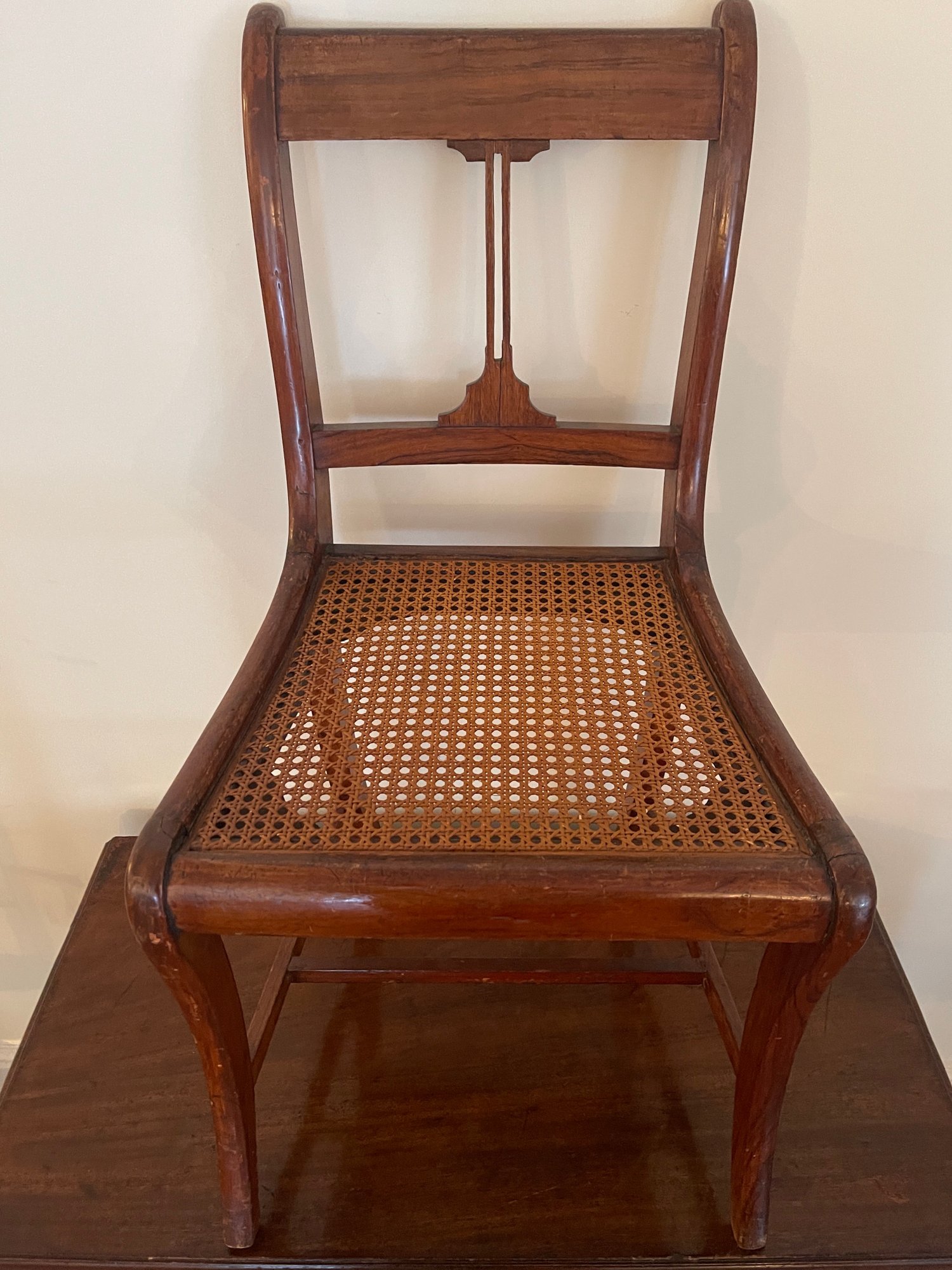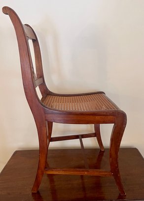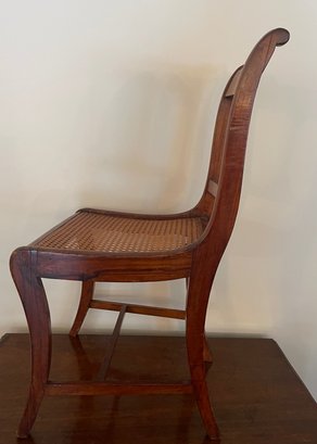 Classic antique wooden side chair featuring a warm, medium-brown finish and a handwoven caned seat. The chair is designed with a gently curved crest rail and a central vertical splat, offering a clean and understated silhouette typical of late 19th to early 20th century craftsmanship. Gracefully curved rear legs and a supportive stretcher base provide both stability and visual balance. A versatile piece ideal for a dining table, writing desk, or as an accent chair in traditional, farmhouse, or transitional interiors.