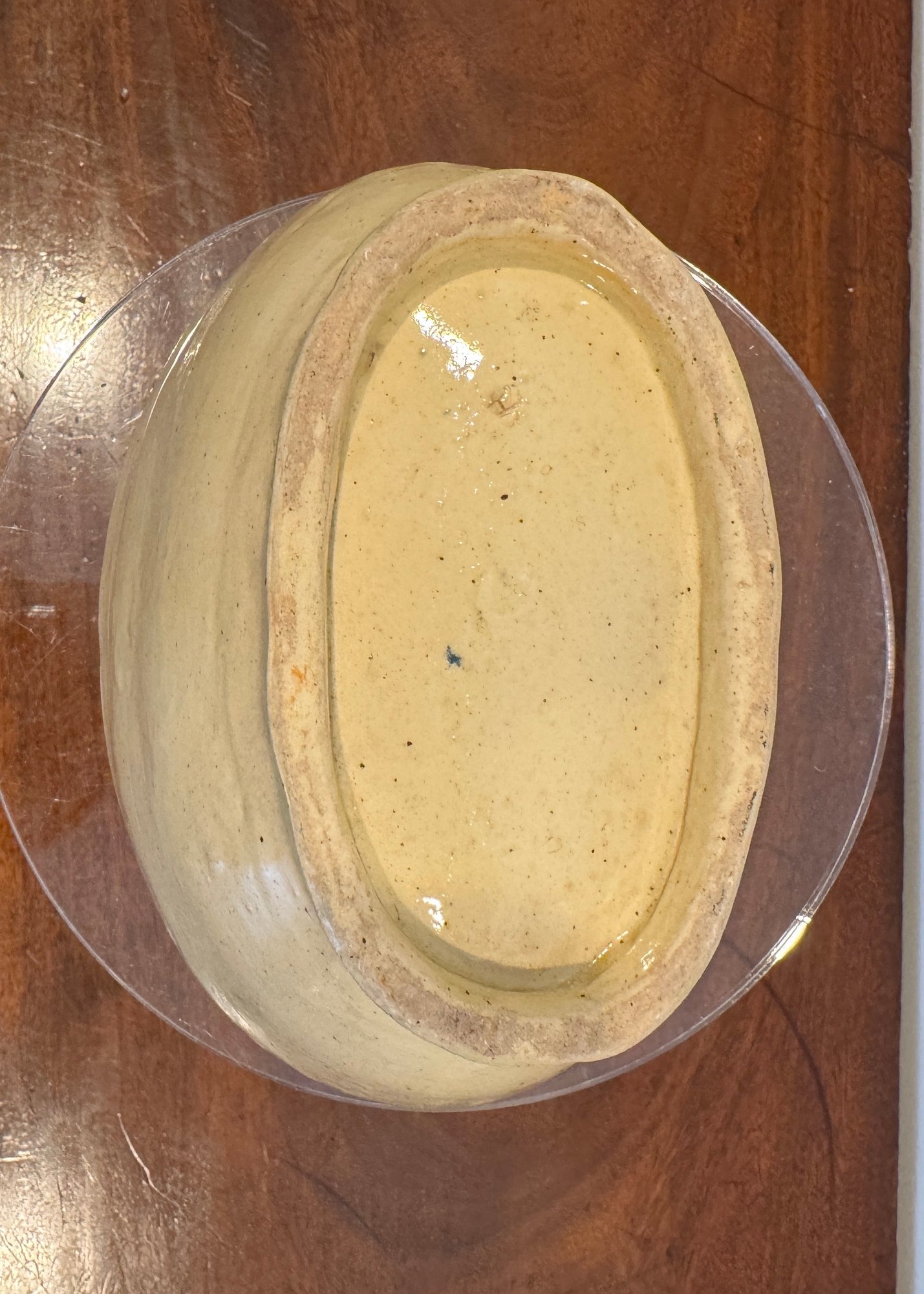 Originally intended for baking or shaping corn pudding and similar dishes, this piece now makes a delightful display item for a farmhouse kitchen or yellowware collection. The oval form and classic motif make it especially appealing to collectors of early American kitchenware.