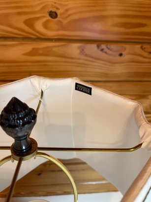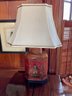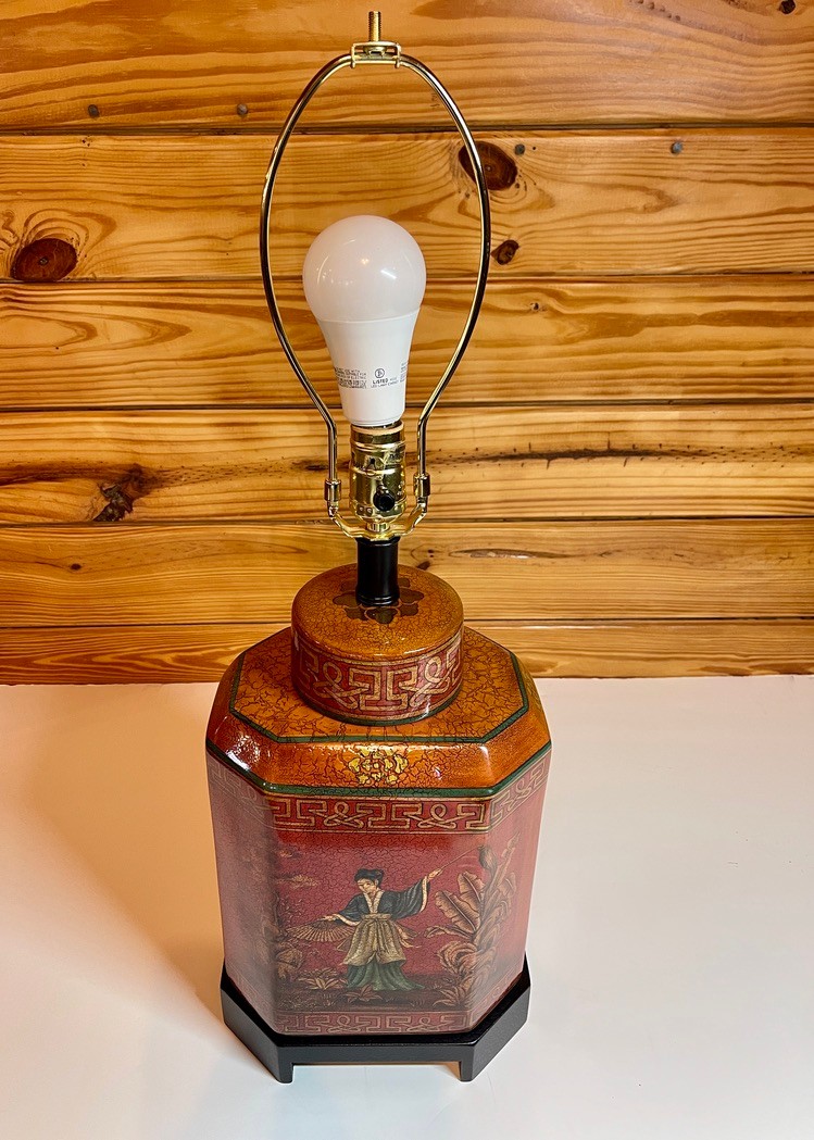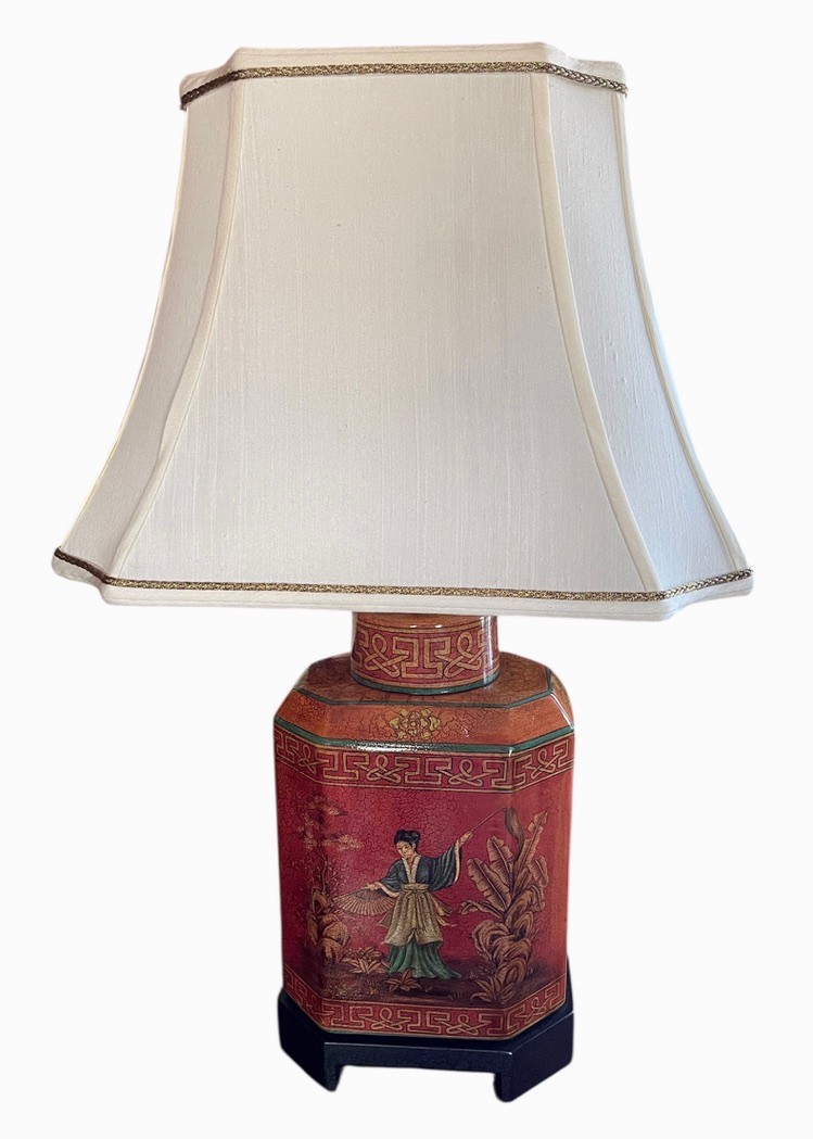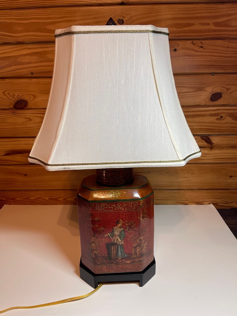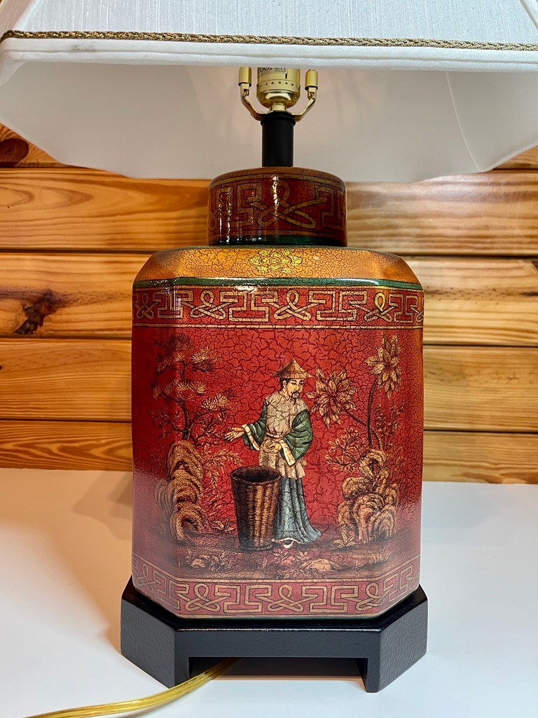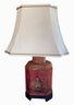 Asian-style table lamp with a hexagonal lacquered base, decorated in a red crackle finish with hand-painted figural scene and stylized border motifs. The base sits on a black plinth and is topped with a coordinating neck and a Fredrick Cooper cream fabric shade with decorative trim.