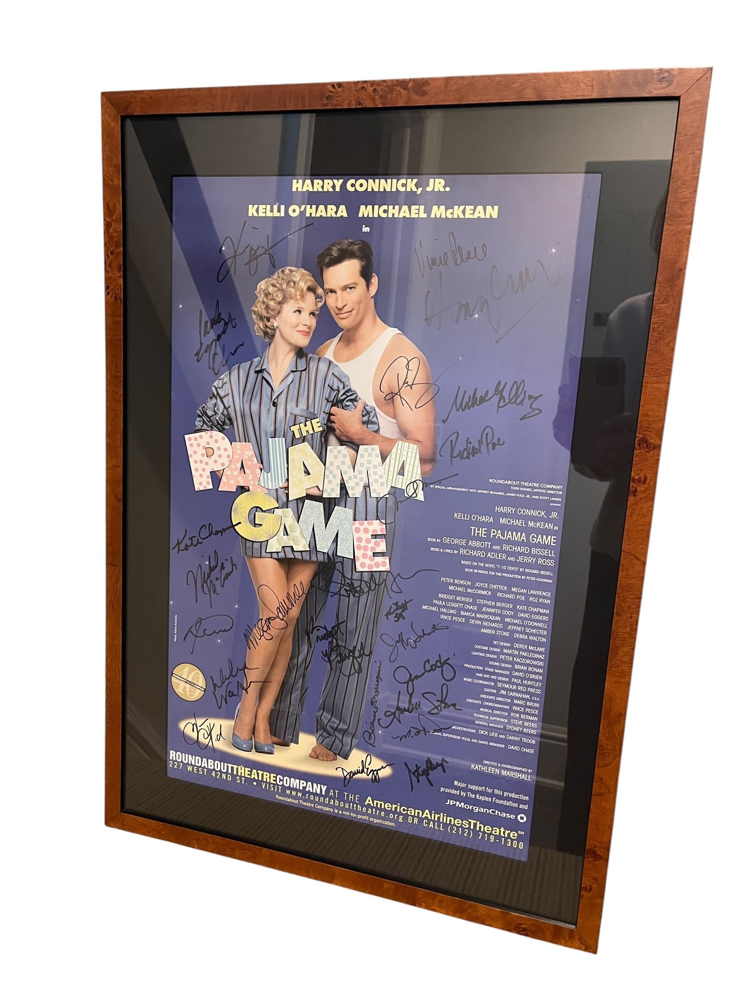 Autographed 2006 poster of the revival musical The Pajama Game. Signed by members of the cast and production team to include Harry Connick Jr., Kelli O'Hara and Michael McKean in a matted and custom burlwood frame. The owner was a board member of Playwrights Horizons, a not-for-profit American Off-Broadway theater located in New York City dedicated to the support and development of contemporary American playwrights, composers, and lyricists, and to the production of their new work.