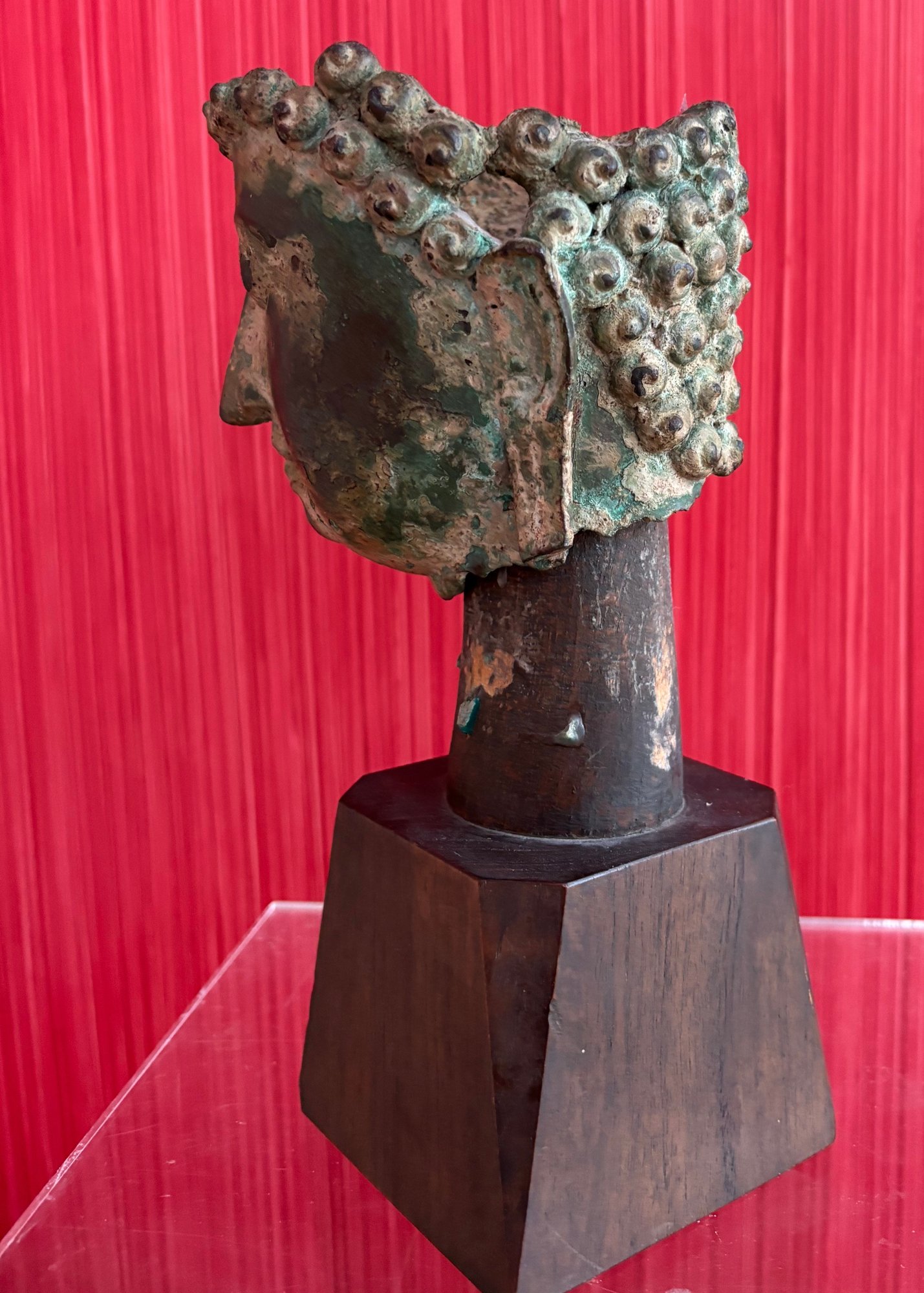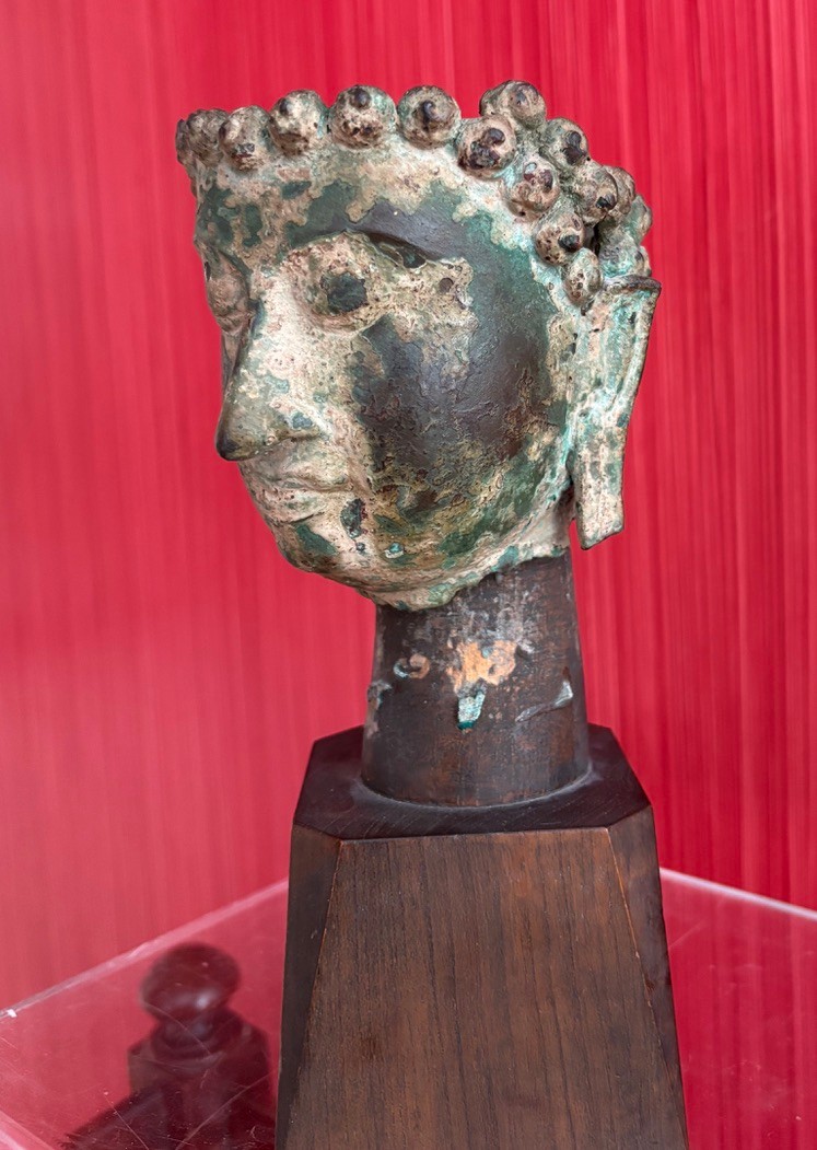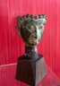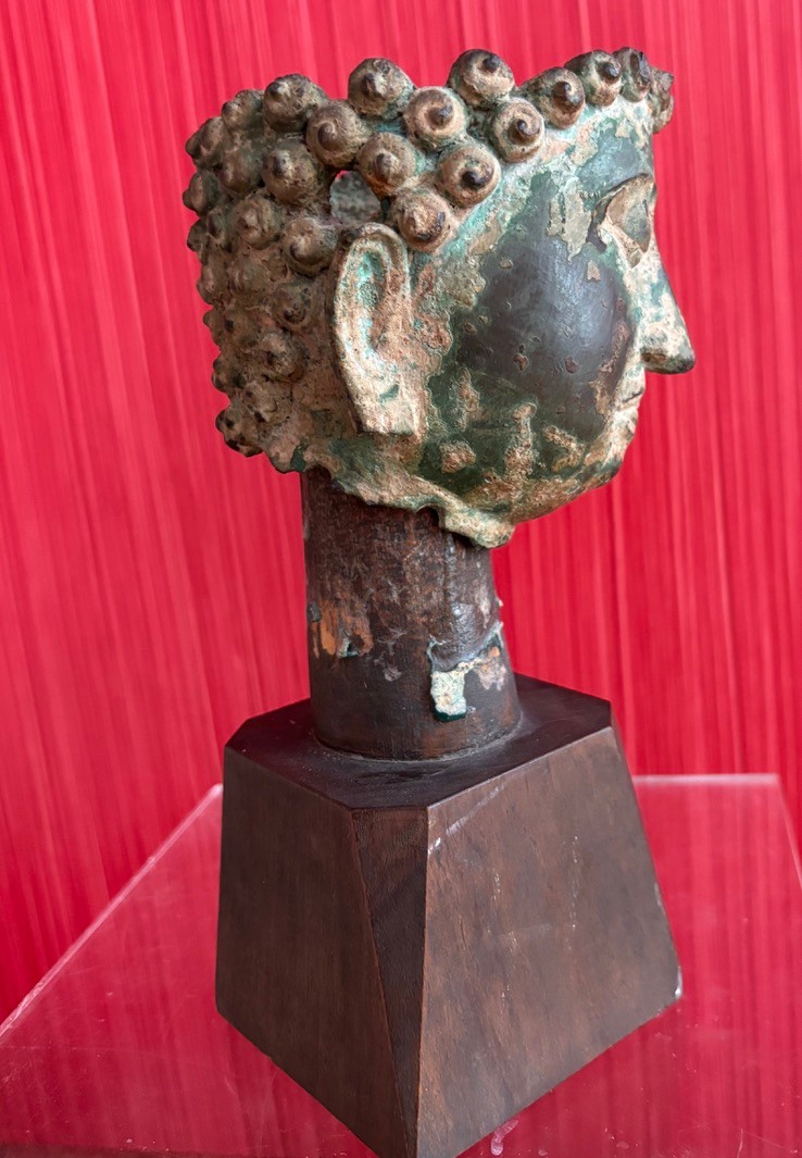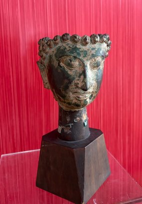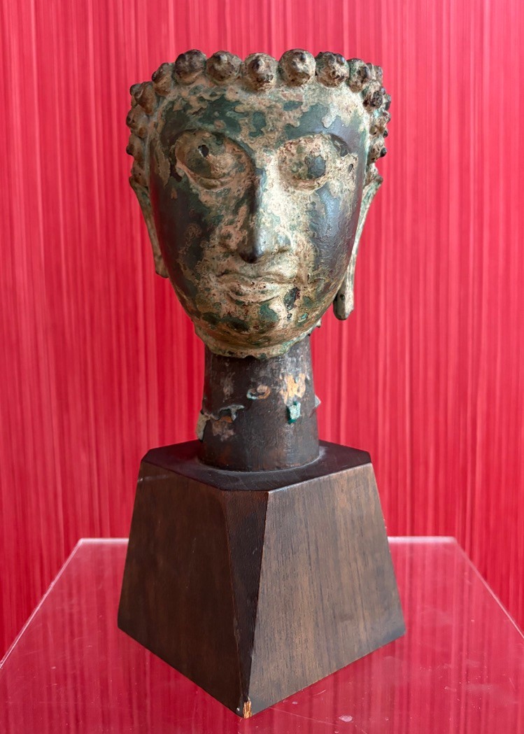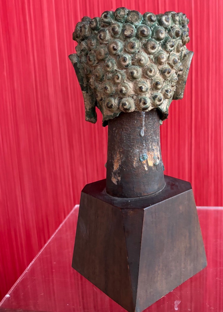 Bronze partial head of Buddha likely Thai with a serene expression and downcast eyes, long partial earlobes and short ringlet curls of hair that sits on wooden mount and easily removable.