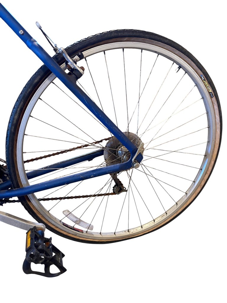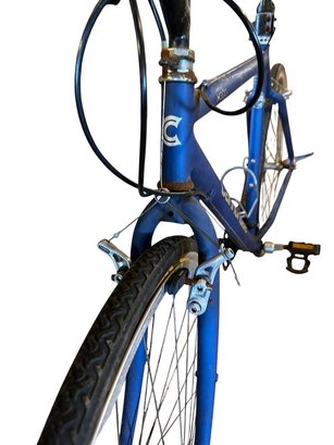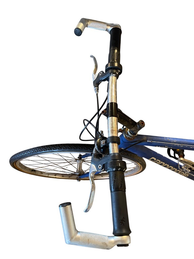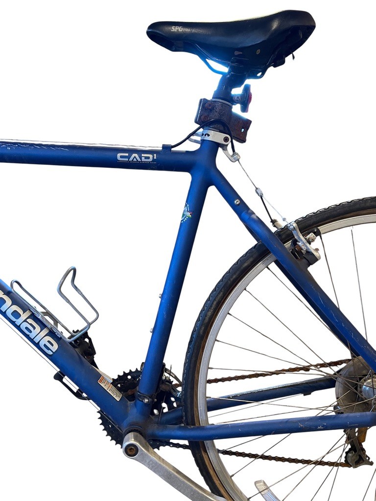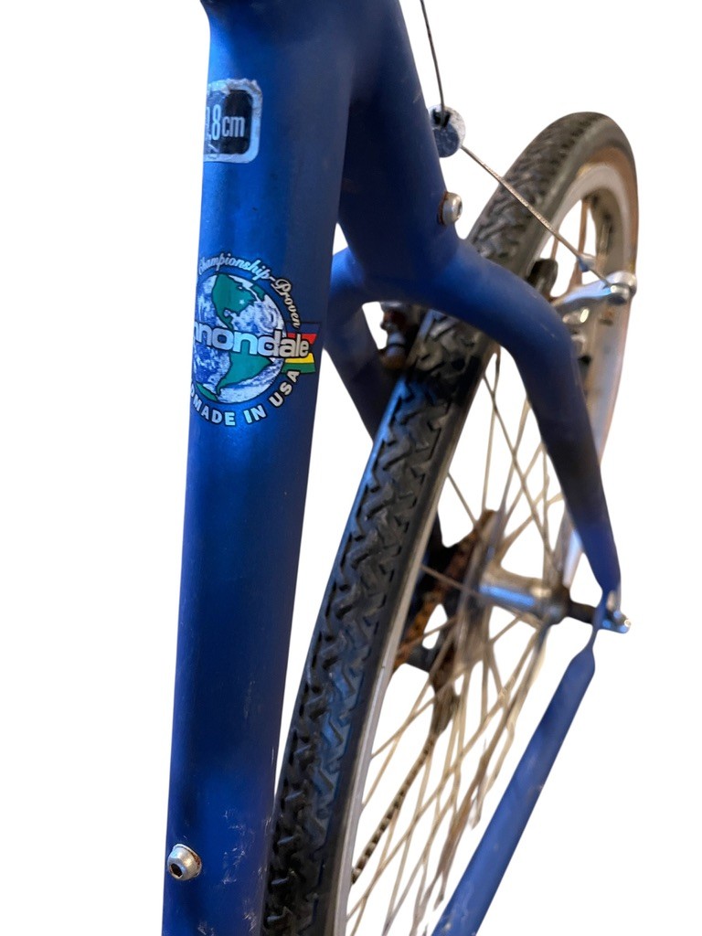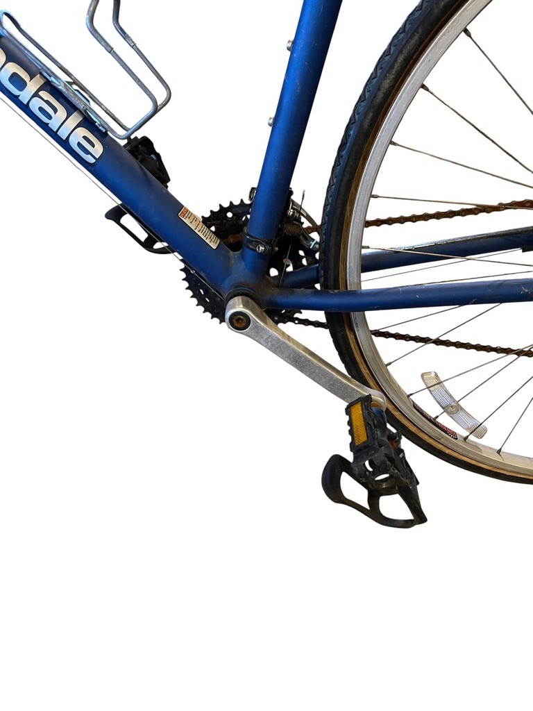 The streamlined frame geometry offers a smooth, agile ride, while the multi-speed drivetrain provides versatility across varied terrain. Finished in a classic blue with Cannondale branding.