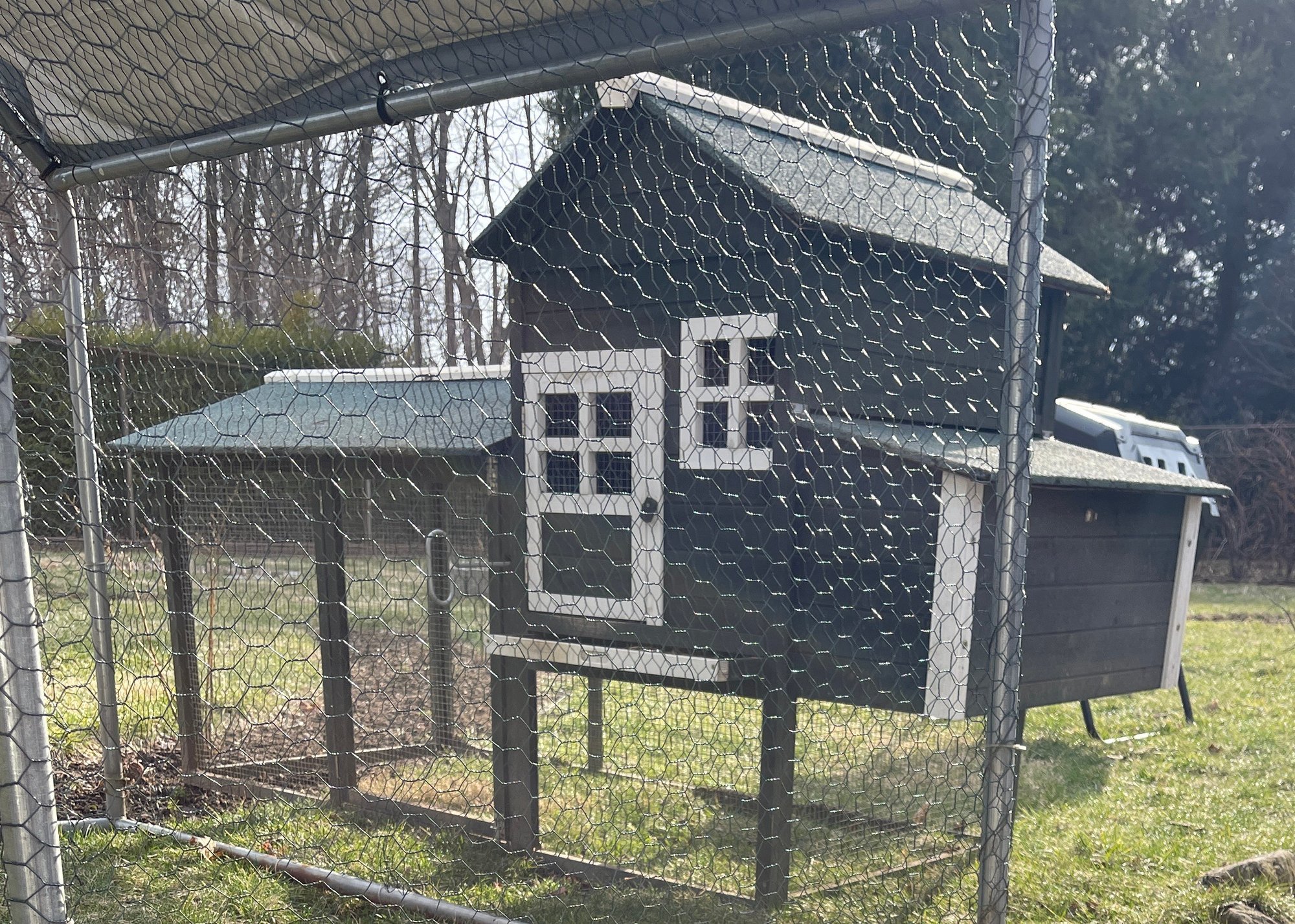 Well-built outdoor chicken coop featuring a raised wooden house for easy maintenance. The coop is constructed with painted wood in a classic dark green finish with white trim, giving it a charming, farmhouse-style appearance.