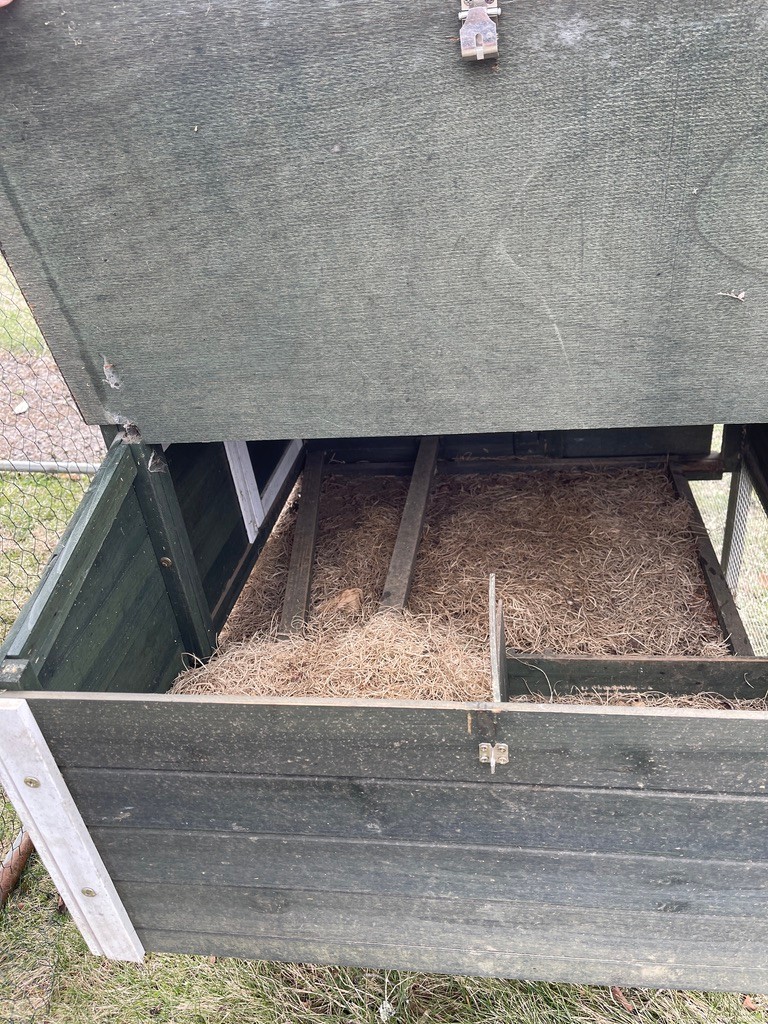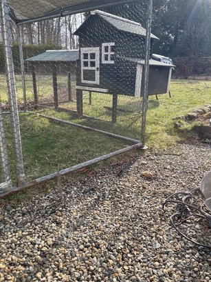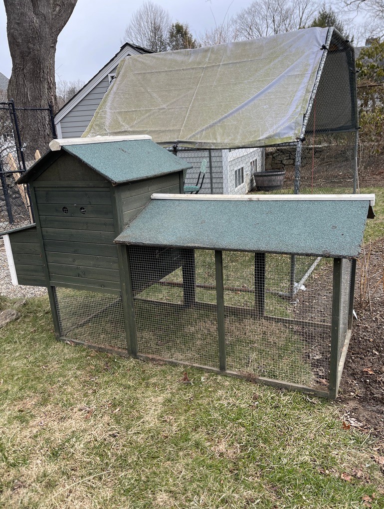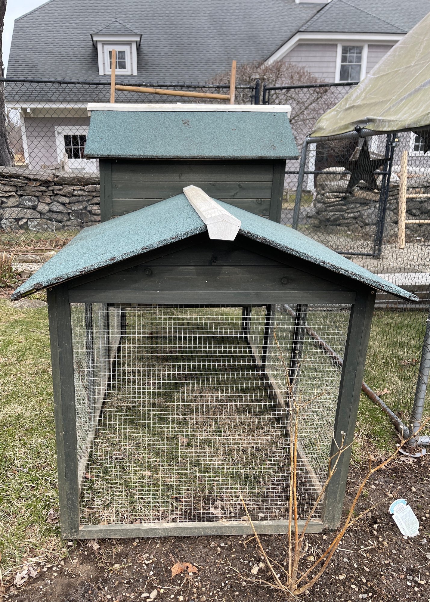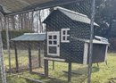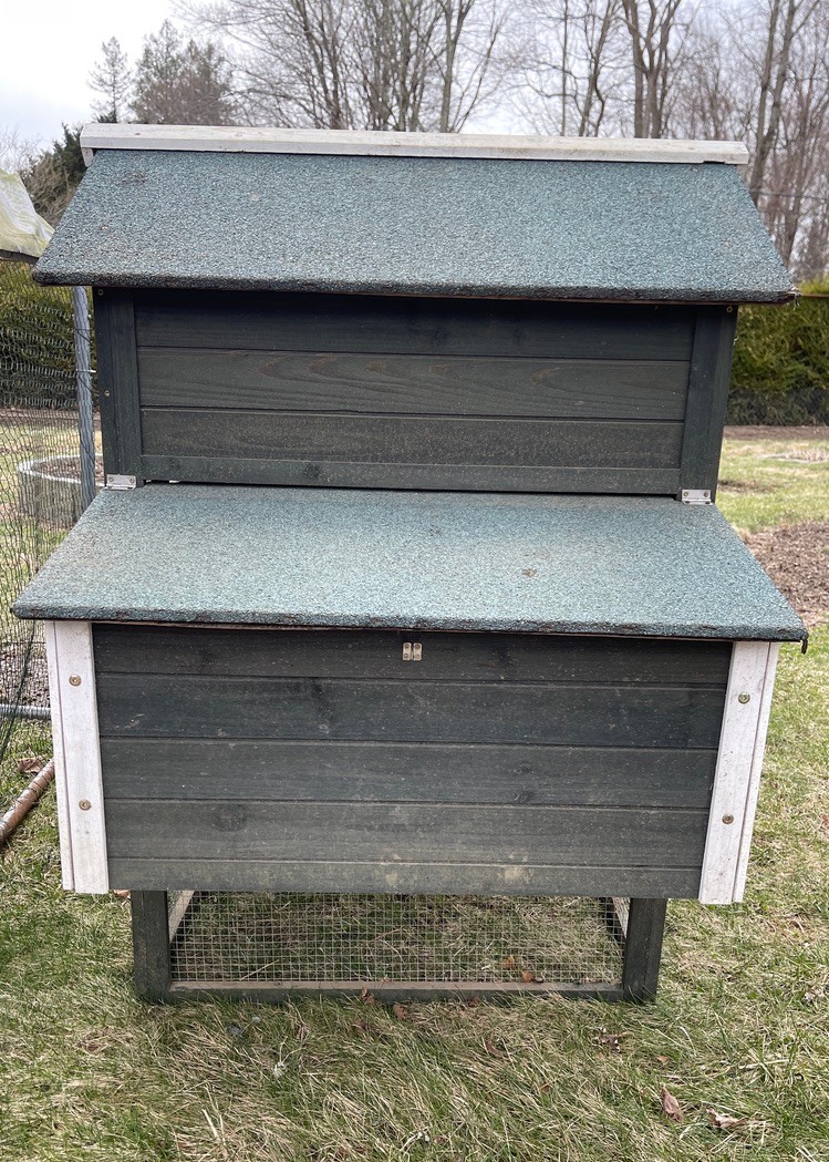 The elevated coop includes multiple access points, including a front door with window panes for visibility and ventilation. The coop pairs nicely with the chicken run also available in this auction. Unable to get a clear shot with the run in the way and the weight of the coop, we hope you are able to get enough of a view. Please inquire if you have questions.