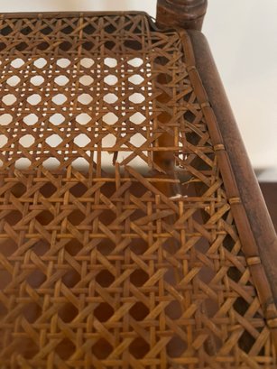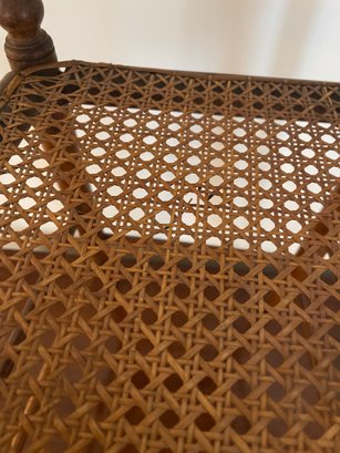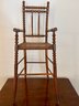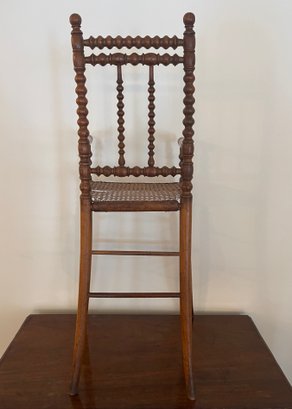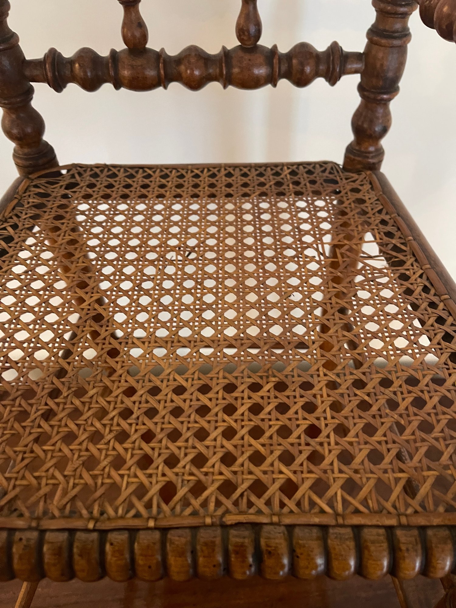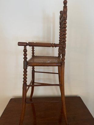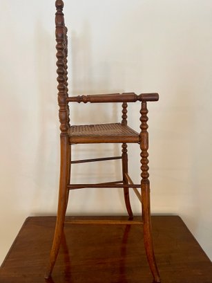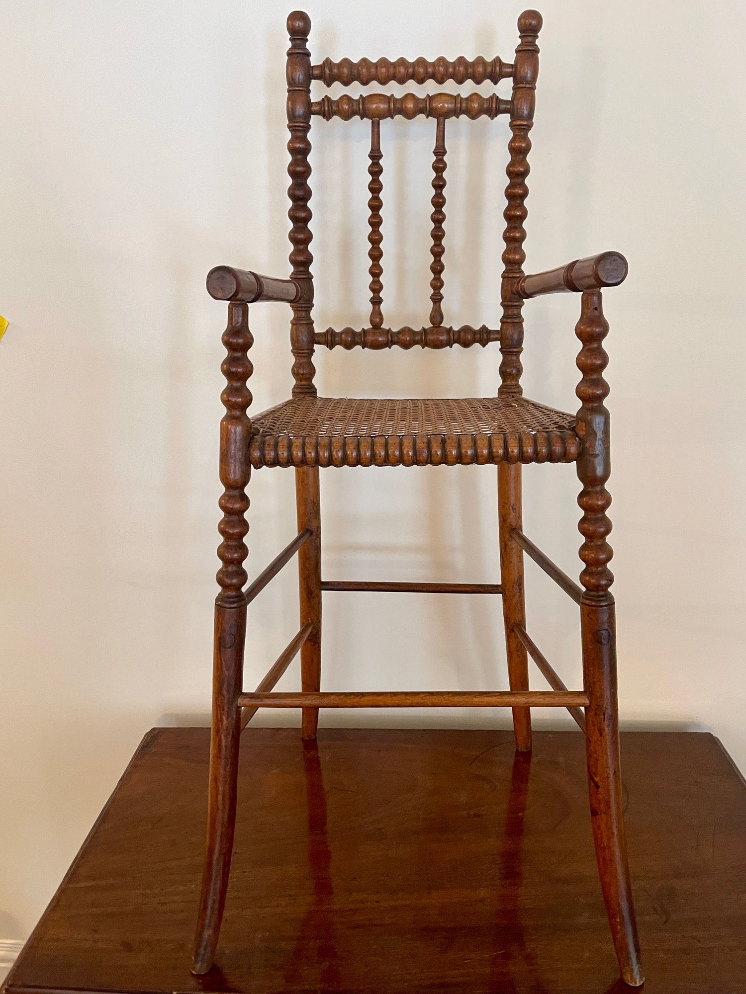 Child's highchair in Jacobean-style bobbin, a type of furniture characterized by turned legs and structural elements resembling bobbins or spools. This chair features a tall, narrow backrest and armrests appropriate for a child. The seat is caned and has a small whole to one side.