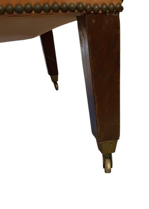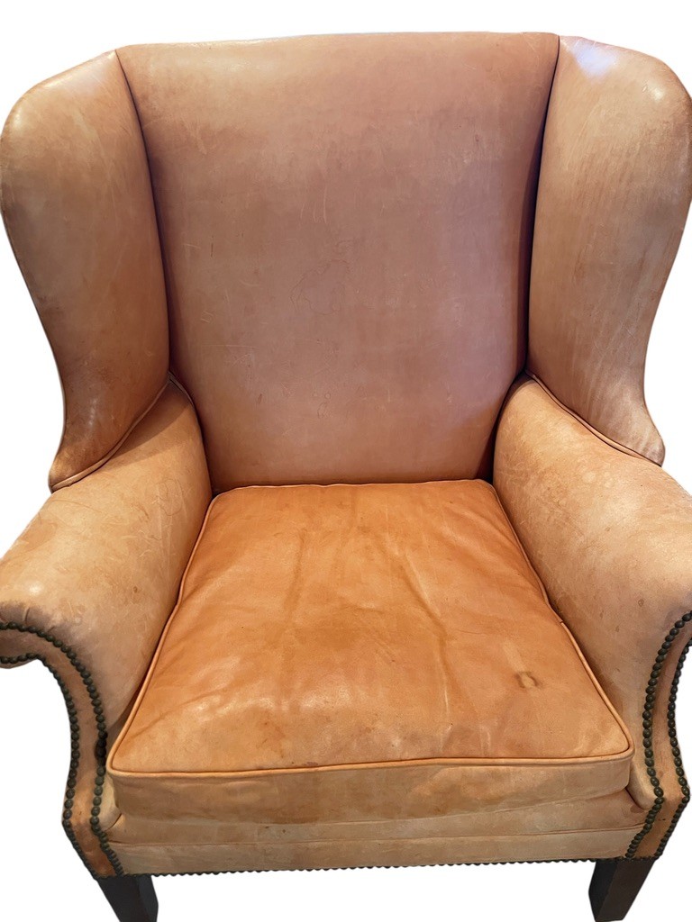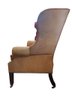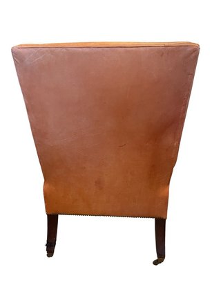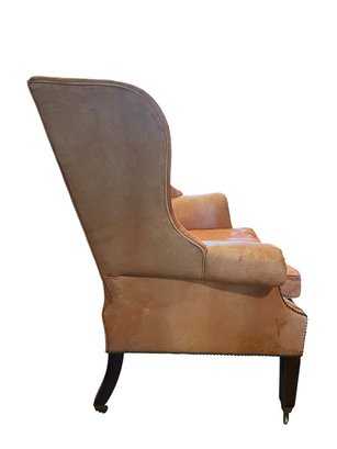 Elegant and timeless leather wingback armchair upholstered in a warm camel-toned leather. This traditional piece features a high, shaped back with winged sides, rolled arms, and classic nailhead trim detailing along the arms and base. The chair rests on sturdy wood legs with casters.
