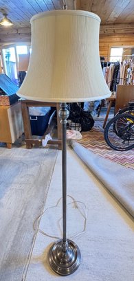 Elegant floor lamp featuring a slender metal column with a traditional stepped base and a soft, neutral pleated shade. The clean lines and understated finish make this piece versatile enough to complement both classic and transitional interiors.