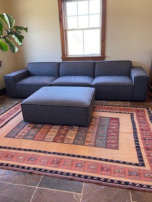 Clean-lined and versatile modular sectional sofa upholstered in a neutral gray fabric, offering both comfort and modern style. This piece features a low-profile silhouette with wide track arms and generously sized seat cushions, designed for relaxed lounging. The modular configuration allows for flexible arrangement to suit a variety of spaces.