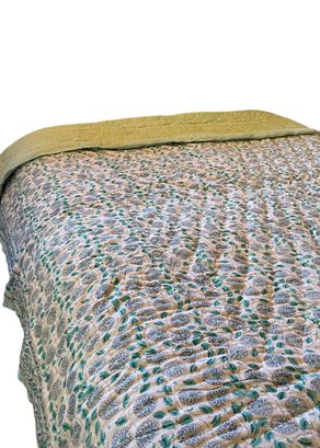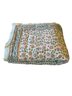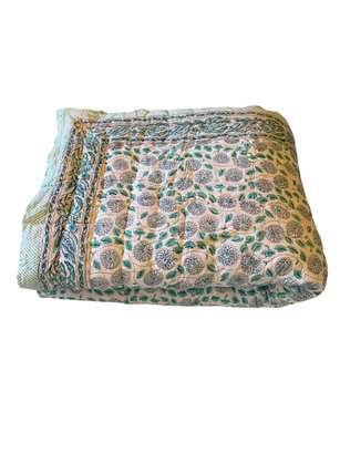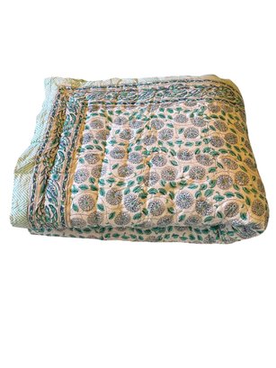 Beautifully crafted quilted cotton coverlet featuring a traditional hand-block printed floral motif in soft blue-green tones on a warm ivory ground. The piece is accented with a decorative border and subtle coordinating reverse pattern, showcasing classic artisanal textile design.