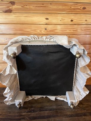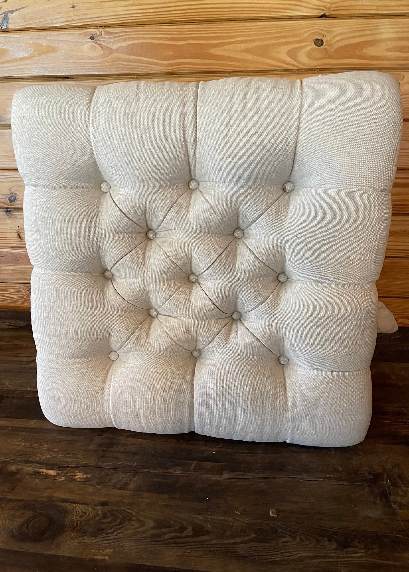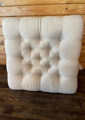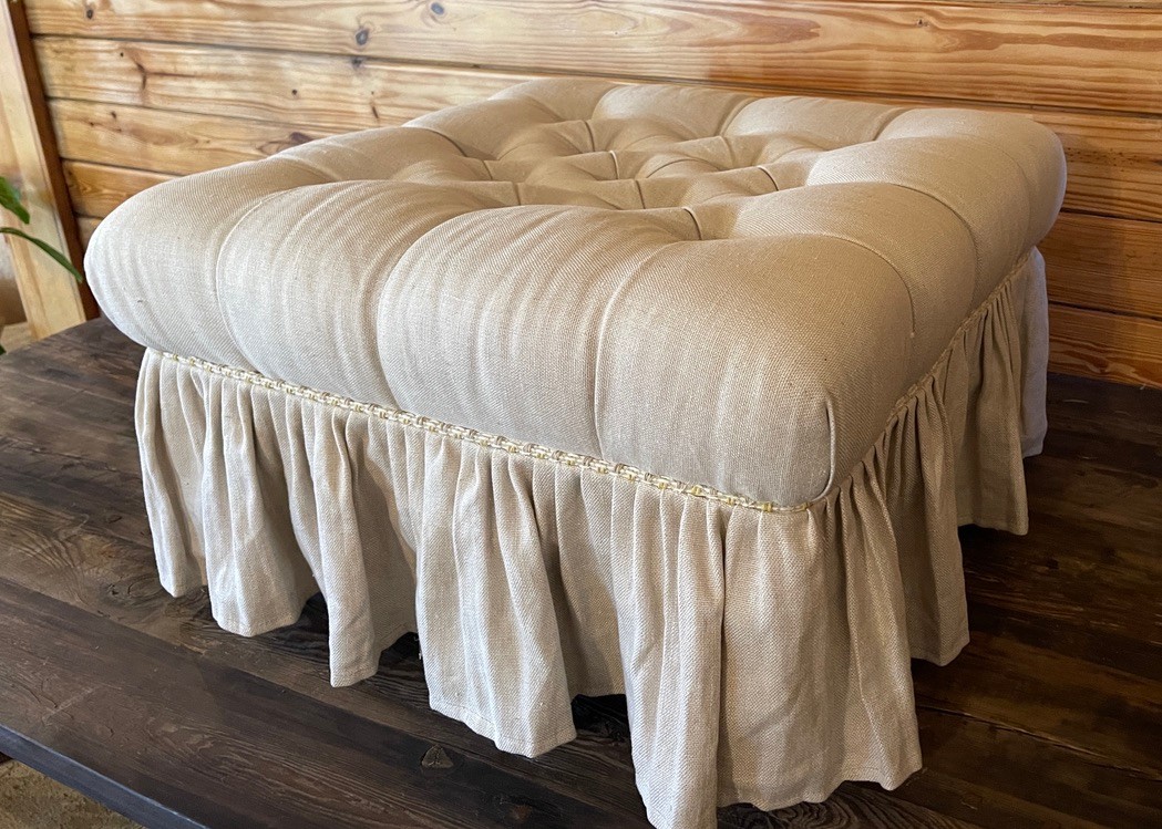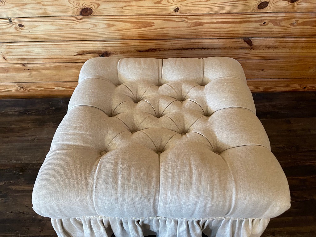 Charming custom upholstered ottoman featuring a plush, deeply tufted cushion top and a classic gathered skirt. Finished in a soft neutral fabric, this piece brings a relaxed, cottage-inspired elegance to any room.