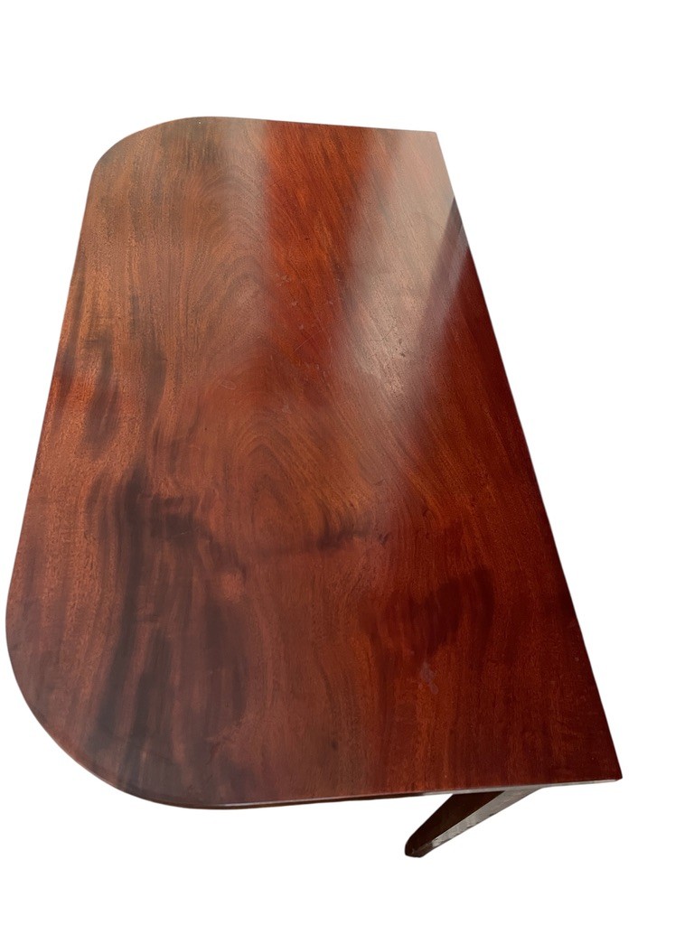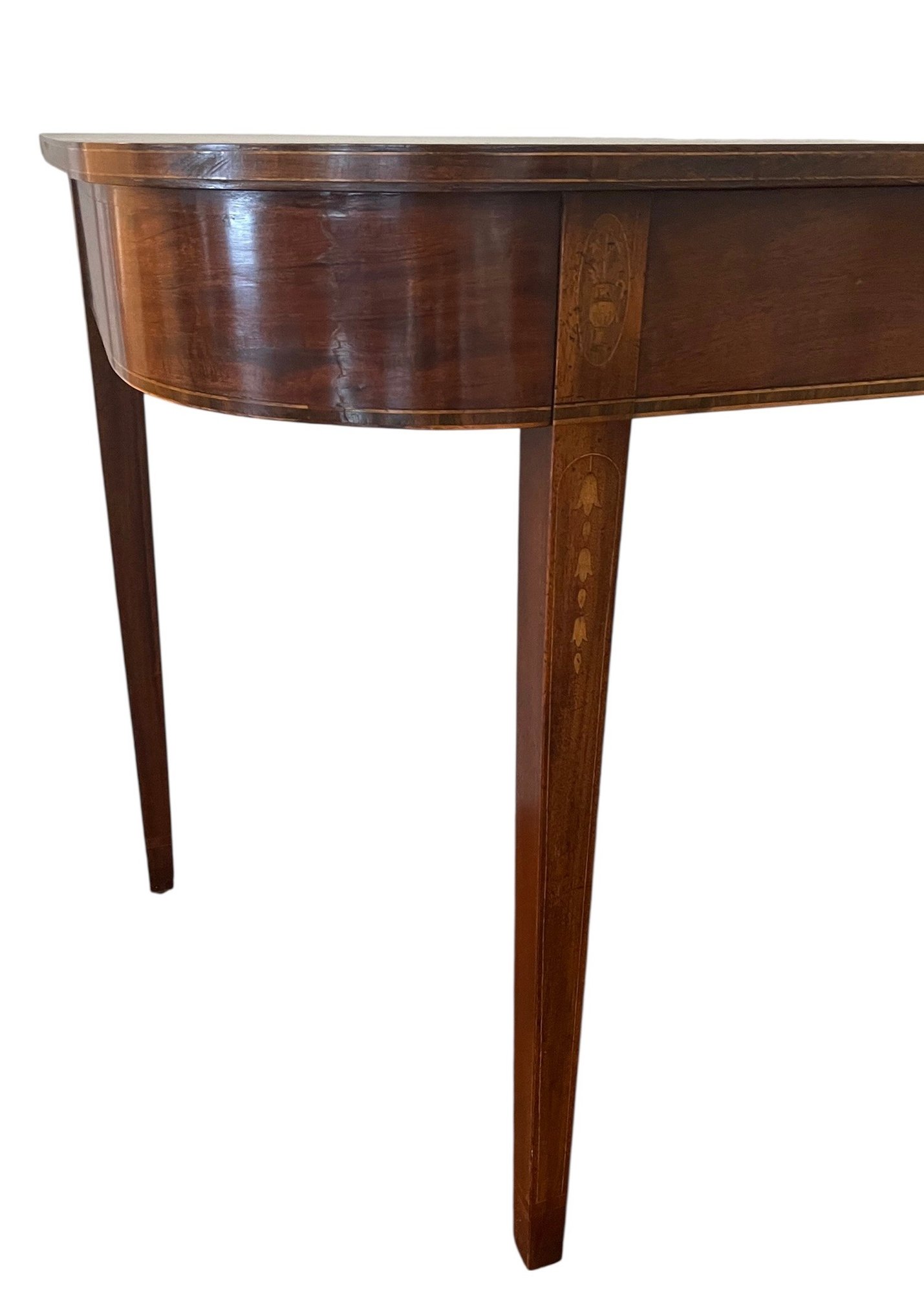 Classic D-shaped or demi-lune table with tapered legs, made of solid mahogany wood with beautiful inlay. Two tables are offered in this auction and can be used as a stand alone or attached to two other dropleaf tables offered in this auction to create a huge banquet table.