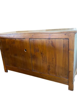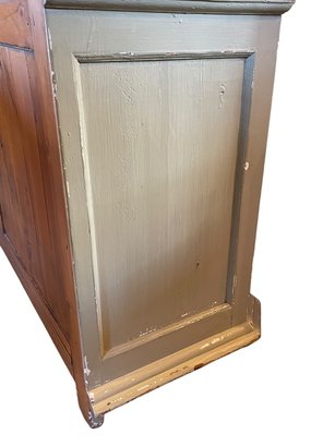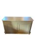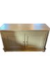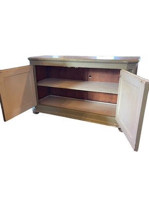 Charming painted solid wood sideboard or storage cabinet featuring a soft green finish with intentional distressing that highlights its rustic, vintage-inspired character. The piece offers a clean, rectangular form with paneled double doors and simple hardware, making it both functional and versatile.