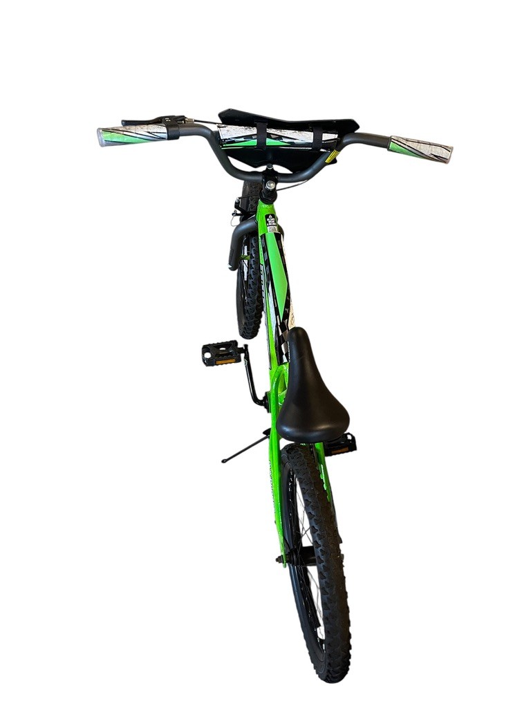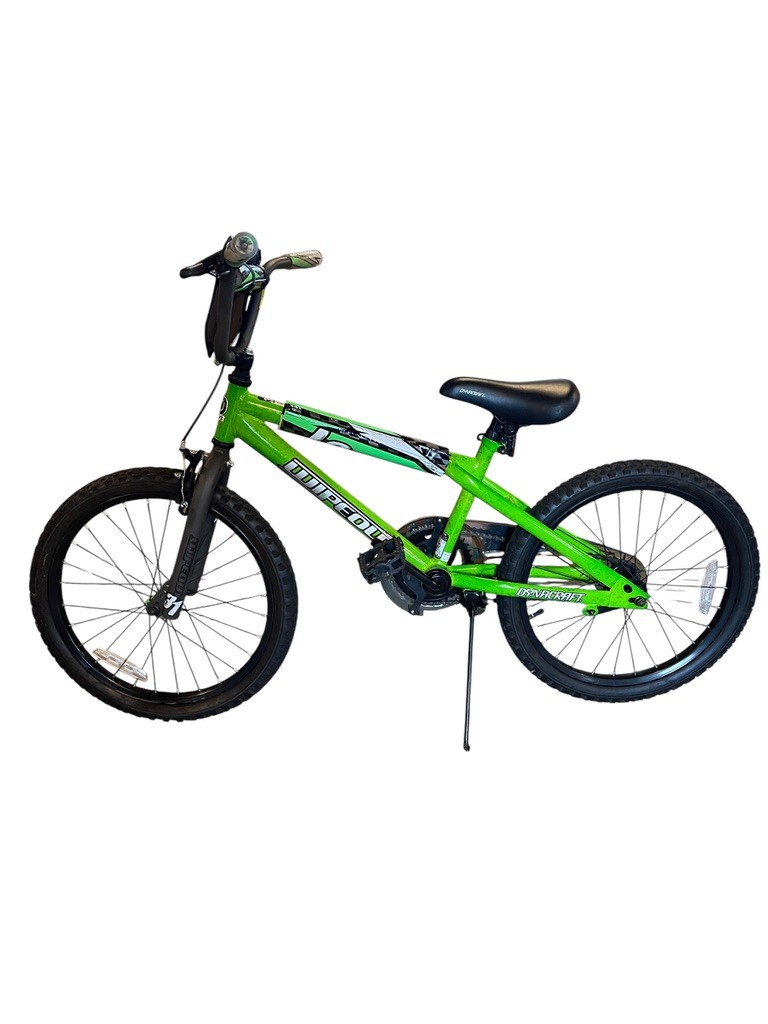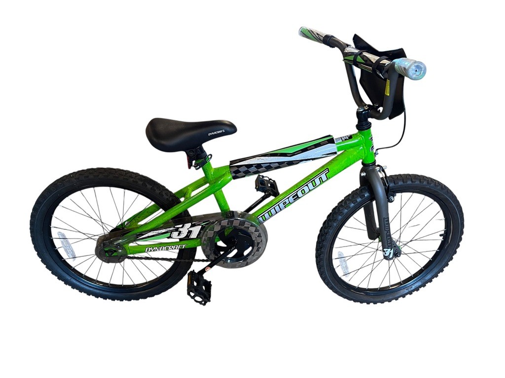 Bright and sporty Dynacraft “Wipeout” bicycle, finished in a vibrant green with black accents. This youth bike features a sturdy steel frame, BMX-style handlebars, and knobby tires designed for neighborhood riding or light off-road use. Equipped with a padded seat, front caliper brake, rear coaster brake, and kickstand for easy parking.