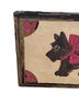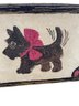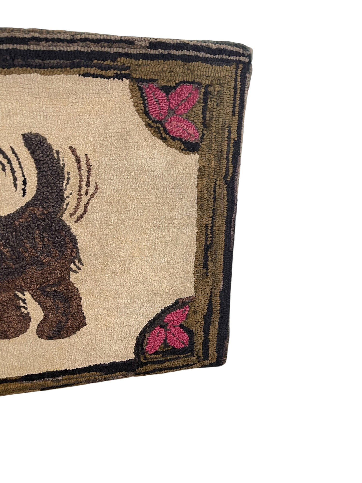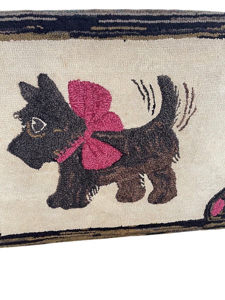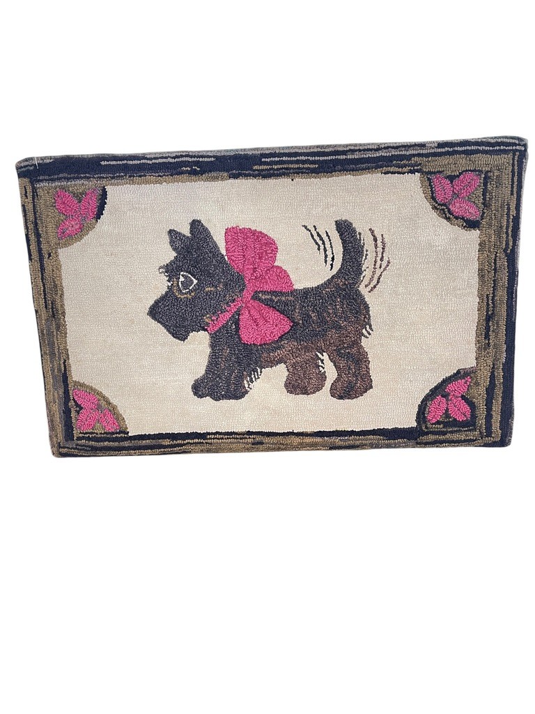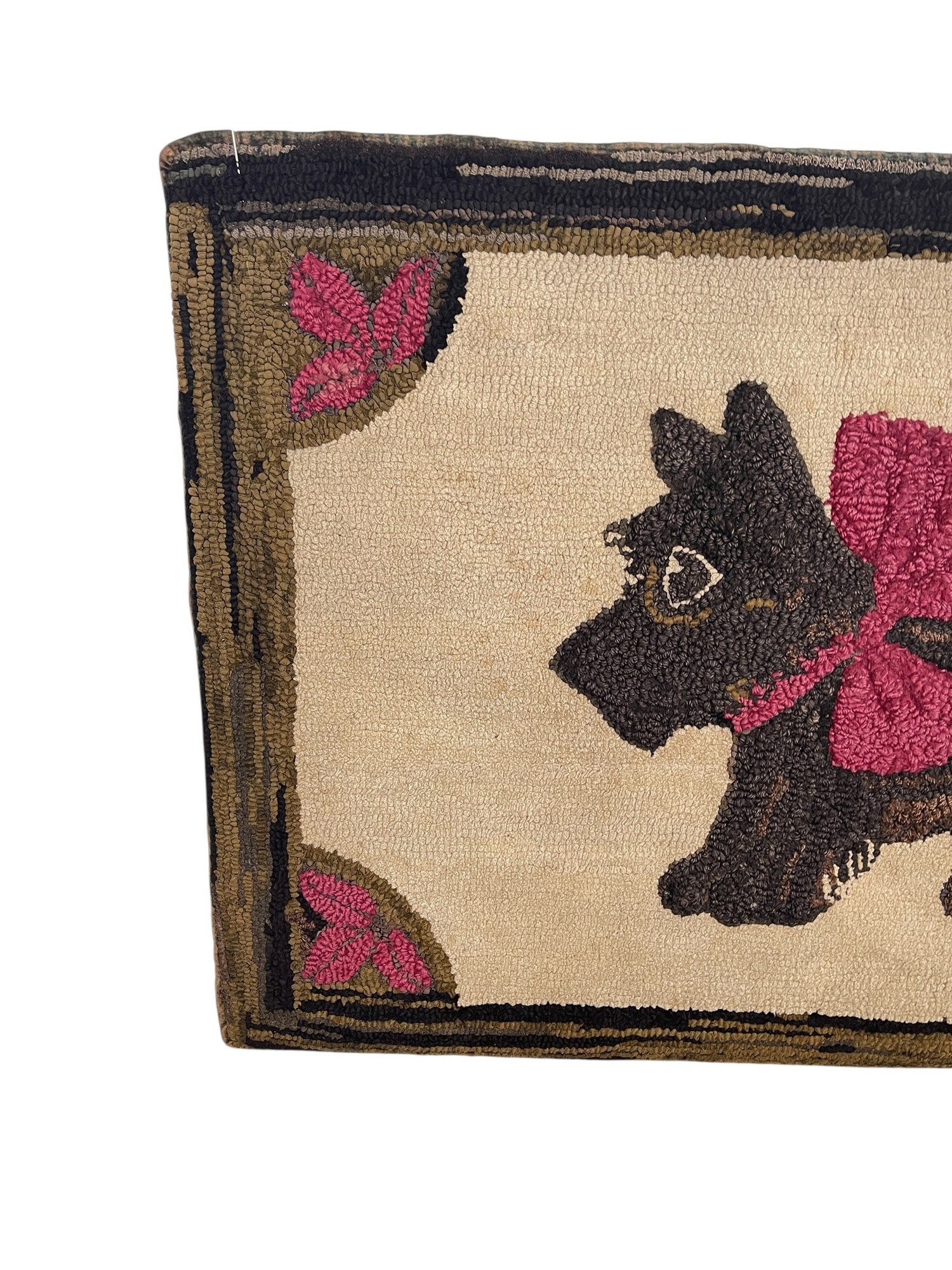 Early American folk art Scottish Terrier hooked rug. The rug features a black Scottie dog with a prominent pink bow surrounded by pink floral corner motifs on a light colored background.