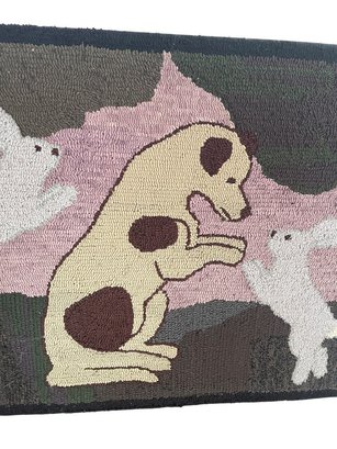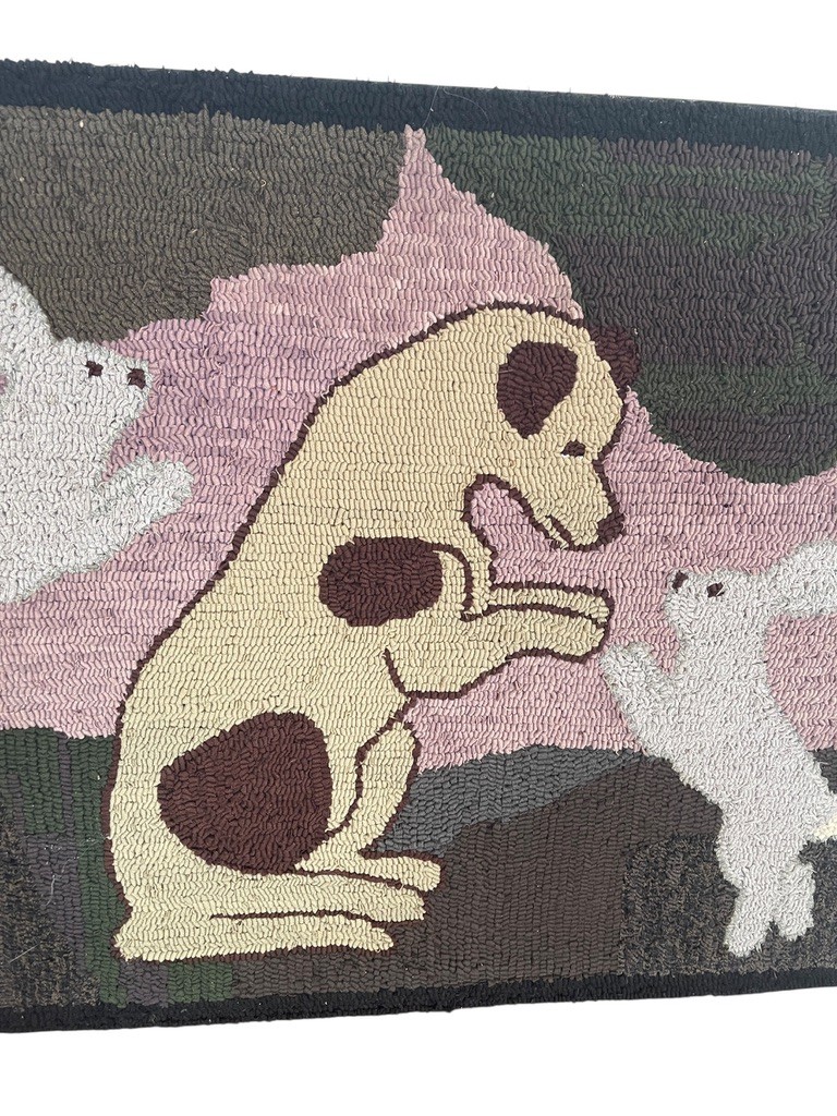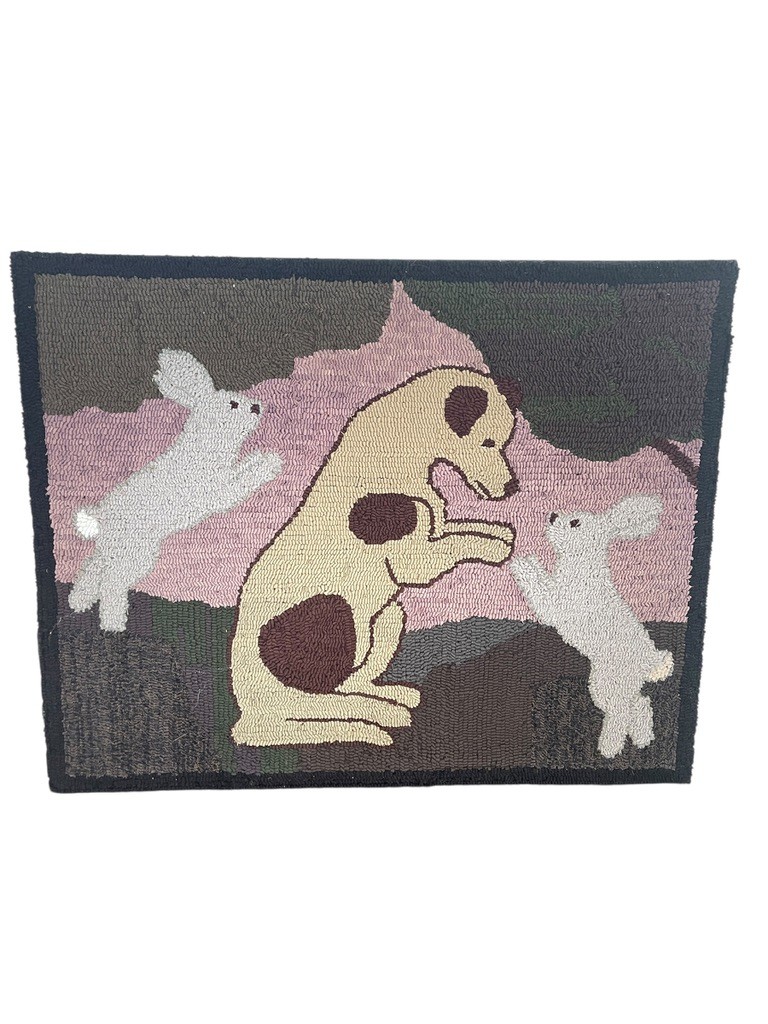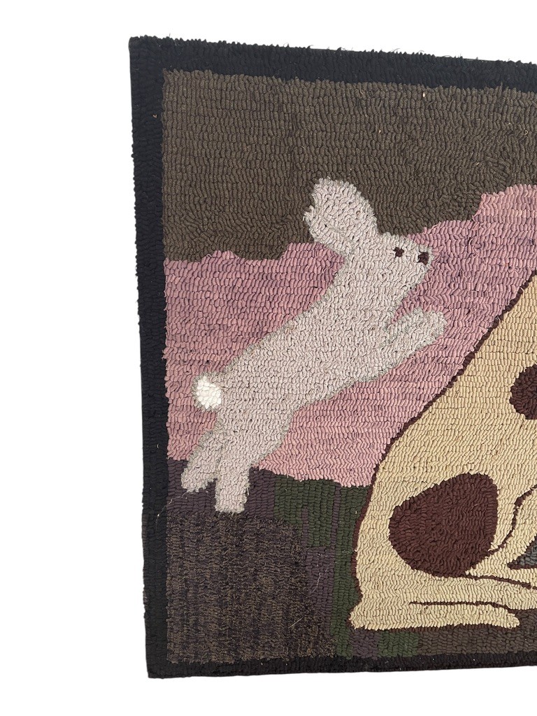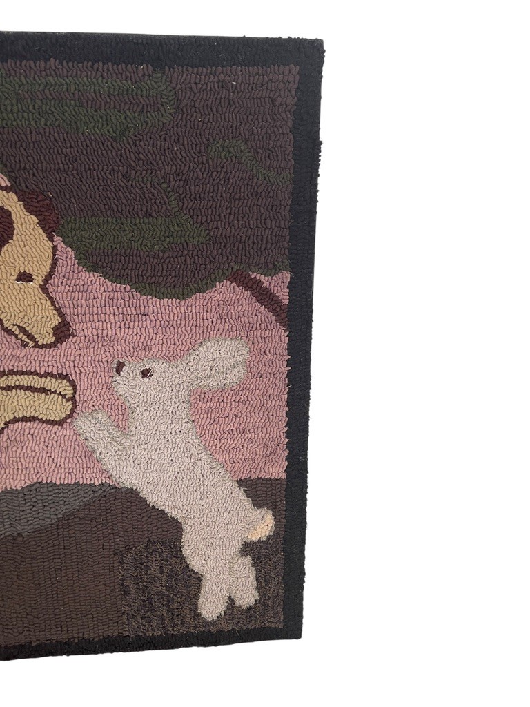 Handmade hooked wool rug featuring a pastoral scene with a dog and bunnies. These types of textile art pieces often date back to the early 20th century or late 19th century.